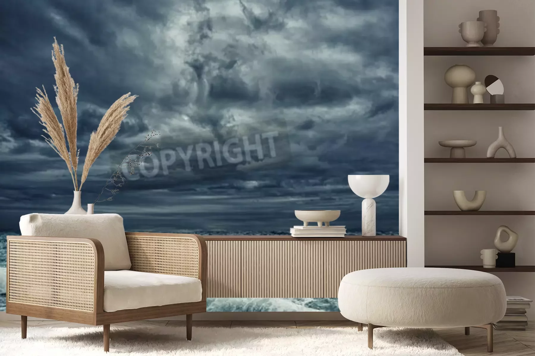 Das Material Premium+ besteht aus einer strukturierten Vinyl-Oberschicht und einem Trägermaterial (Vlies) mit einer Grammatur von 255 g/m², das kleine Unebenheiten der Wand zuverlässig kaschiert. Die feine Sandstruktur verleiht der Oberfläche eine luxuriöse Haptik, während das halbmatte Finish die Tiefe der Farben betont. Das Material ist dampfdurchlässig – so kann diese Fototapete auch in Küchen und Badezimmern eingesetzt werden. Die maximale Breite einer Tapetenbahn beträgt 100 cm. Bei größeren Abmessungen besteht die Fototapete aus mehreren gleich großen Bahnen. Der Kleber wird direkt auf die Wand aufgetragen, und die Fototapete wird auf Stoß angebracht, was für einen ästhetischen Effekt ohne sichtbare Fugen sorgt. Die Oberfläche ist pflegeleicht und kann bei Bedarf sanft mit einem feuchten Tuch abgewischt werden.