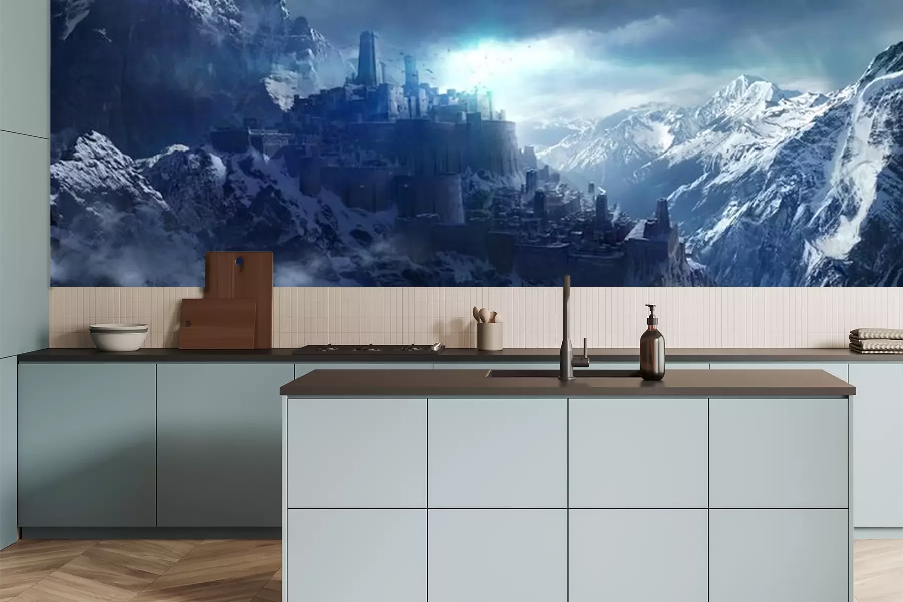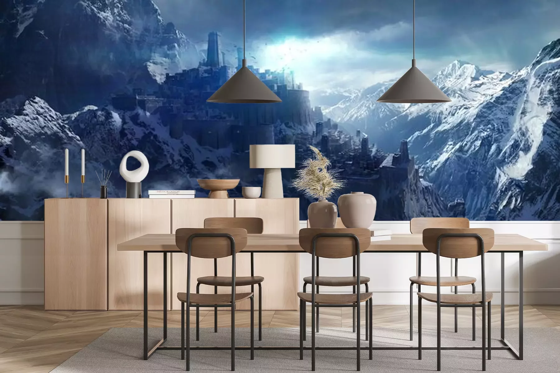 Das Material Premium+ besteht aus einer strukturierten Vinyl-Oberschicht und einem Trägermaterial (Vlies) mit einer Grammatur von 255 g/m², das kleine Unebenheiten der Wand zuverlässig kaschiert. Die feine Sandstruktur verleiht der Oberfläche eine luxuriöse Haptik, während das halbmatte Finish die Tiefe der Farben betont. Das Material ist dampfdurchlässig – so kann diese Fototapete auch in Küchen und Badezimmern eingesetzt werden. Die maximale Breite einer Tapetenbahn beträgt 100 cm. Bei größeren Abmessungen besteht die Fototapete aus mehreren gleich großen Bahnen. Der Kleber wird direkt auf die Wand aufgetragen, und die Fototapete wird auf Stoß angebracht, was für einen ästhetischen Effekt ohne sichtbare Fugen sorgt. Die Oberfläche ist pflegeleicht und kann bei Bedarf sanft mit einem feuchten Tuch abgewischt werden.