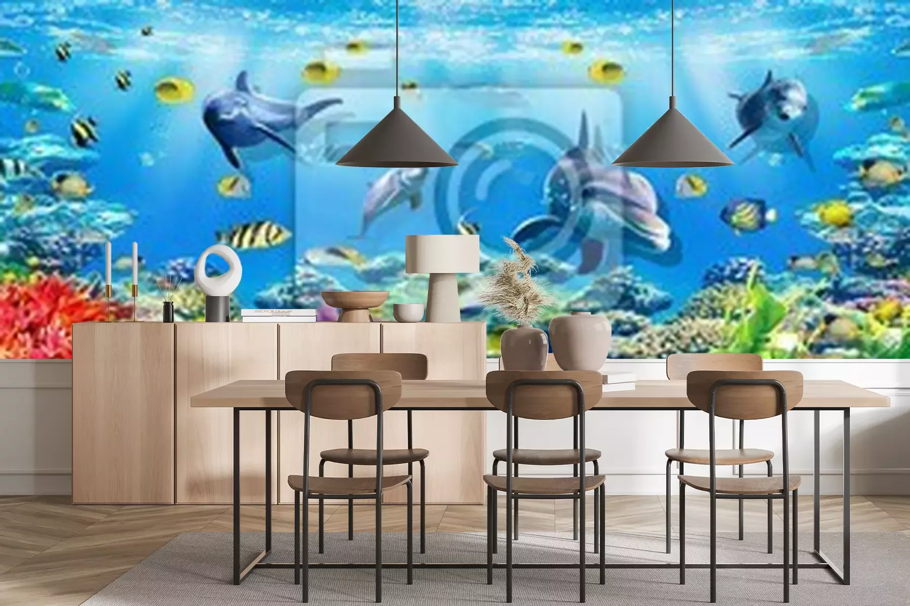 Sticker 3d illustration  wallpaper under sea dolphin, Fish, Tortoise, Coral reefsand water with broken wall bricks background. will visually expand the space in a small room, bring more light and become an ac