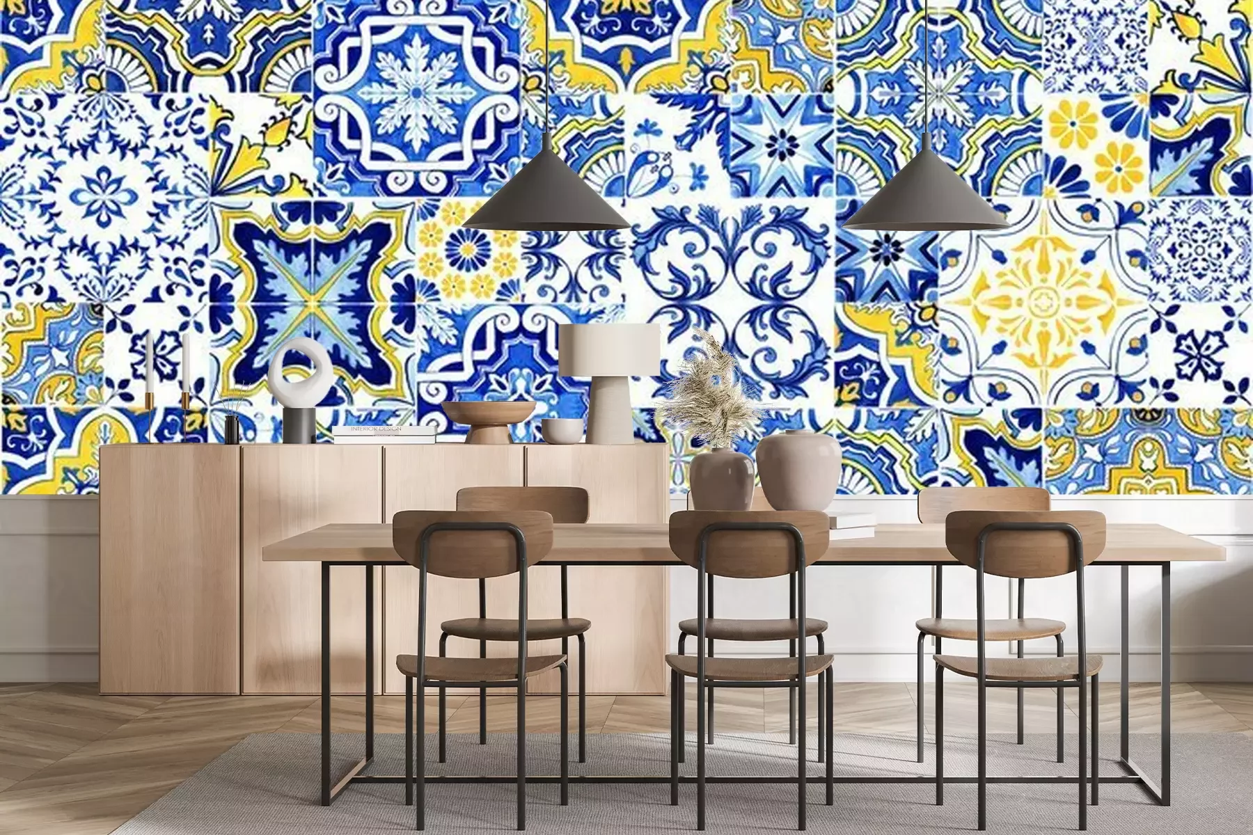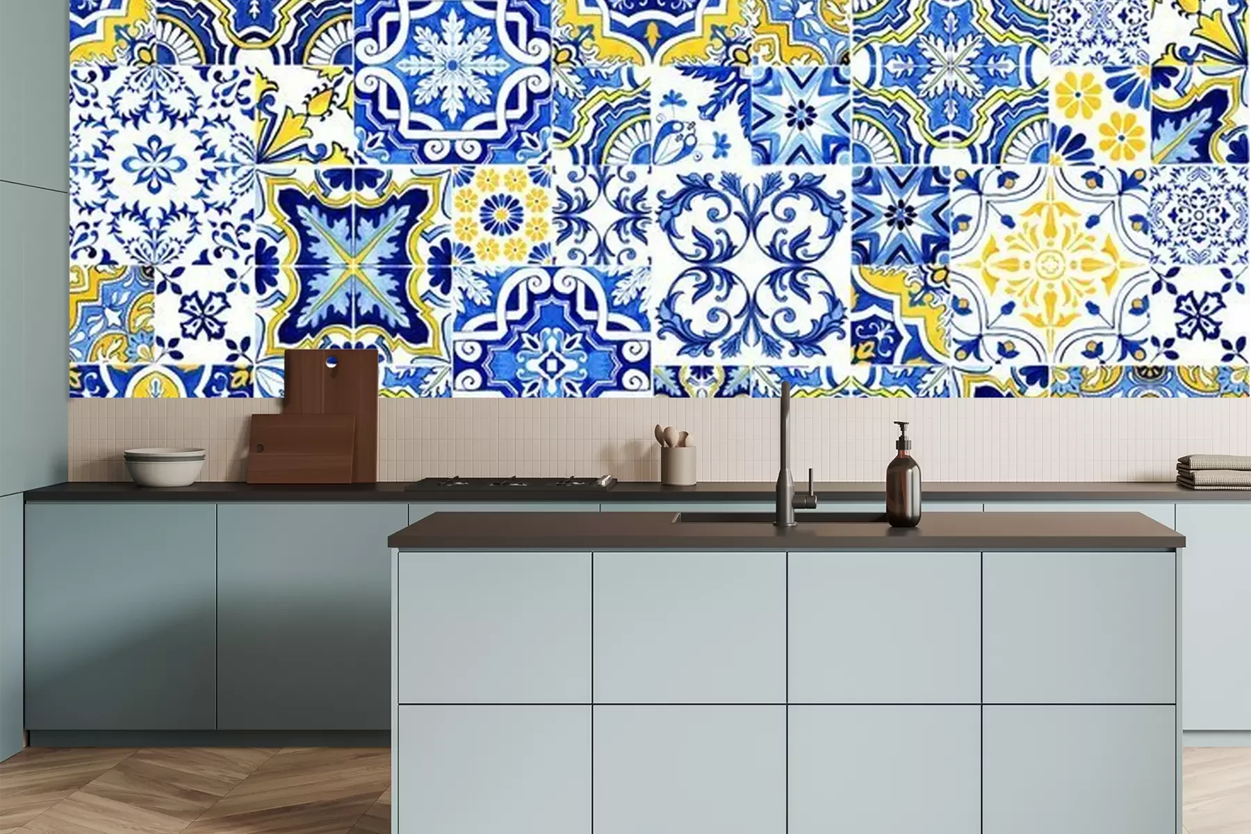 Sticker Azulejos tile wallpaper. Traditional Portuguese Mosaic, horizontal tile desoration. Watercolor artwork, blue and yellow tiles. Antique ceramics tileable, heritage. Old painted panel, floral pattern
