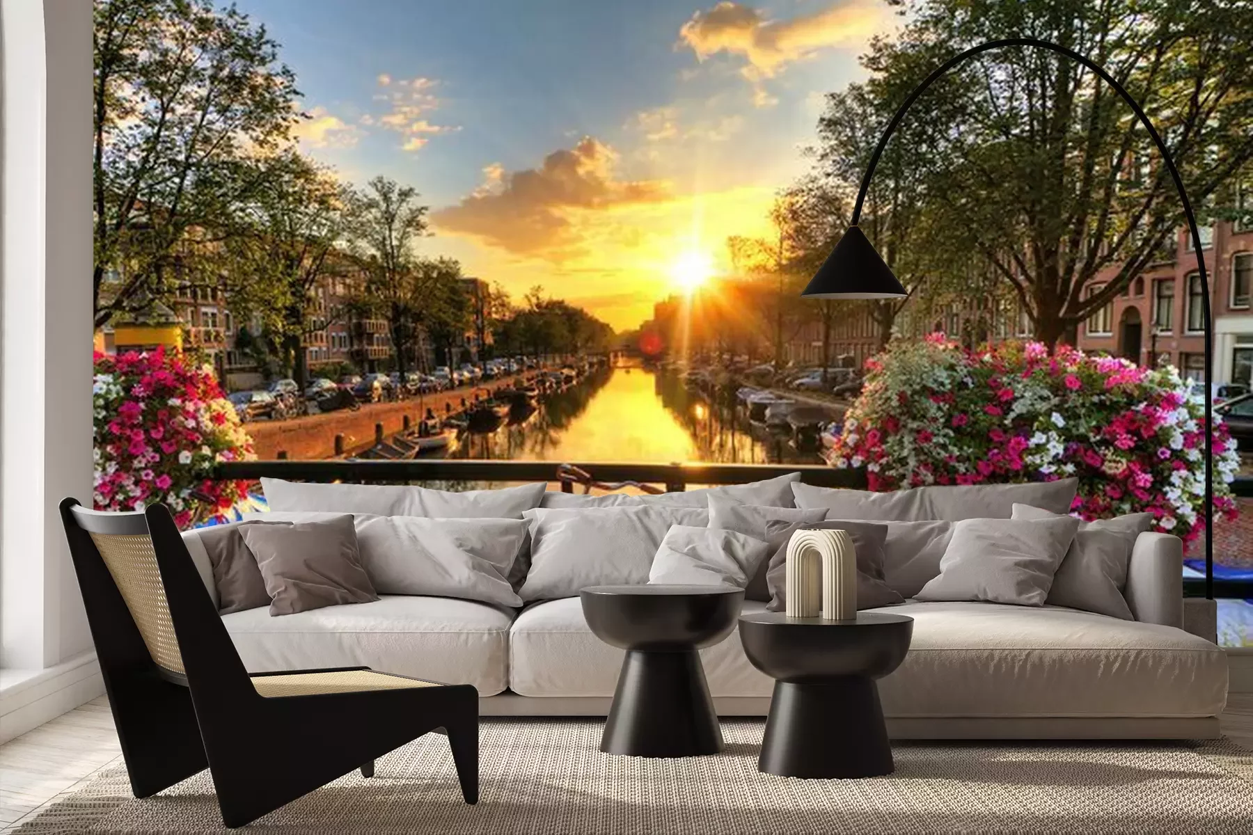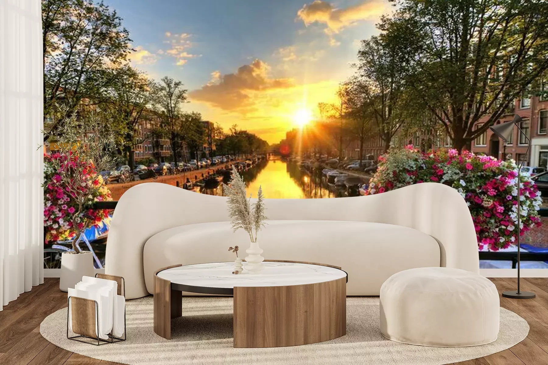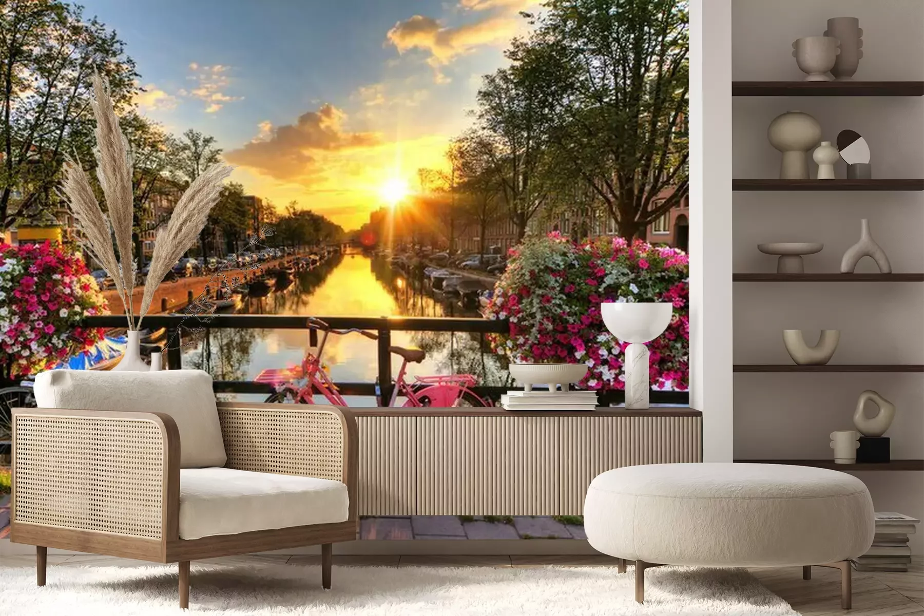 Sticker Beautiful sunrise over Amsterdam, The Netherlands, with flowers and bicycles on the bridge in spring