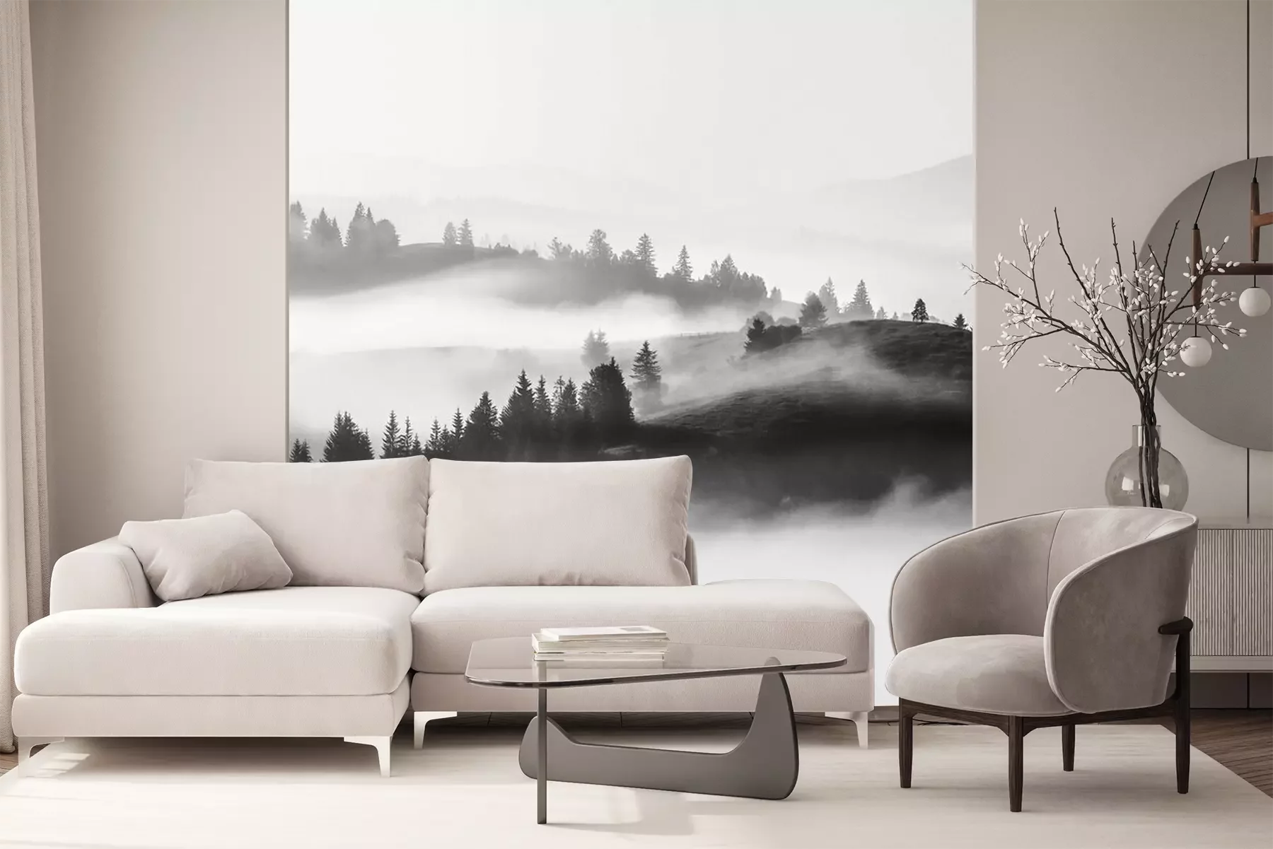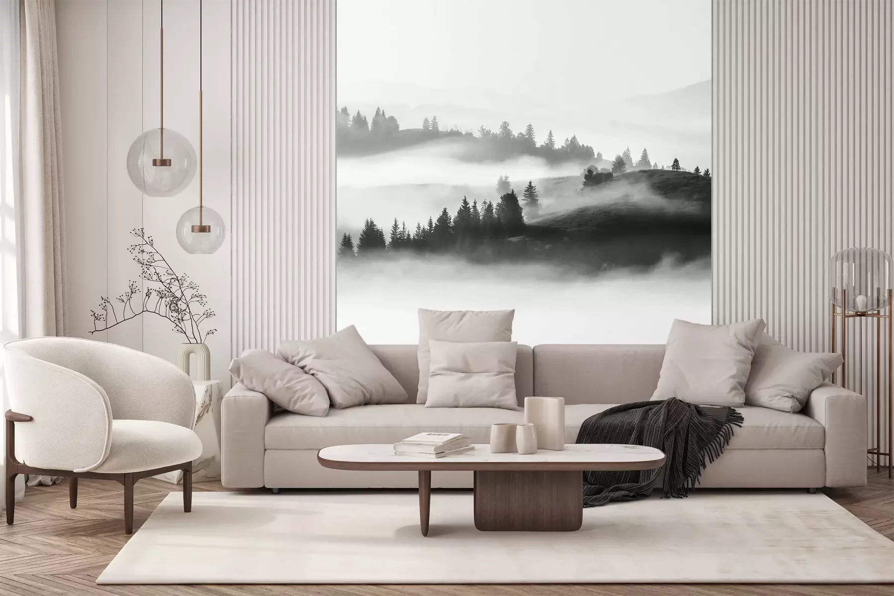 Sticker Black white foggy  landscape,  morning view on slopes of Carpathian mountains at morning sunrise sunlight and fog over valley, stunning nature  landscape, Europe, Carpathians, Ukraine