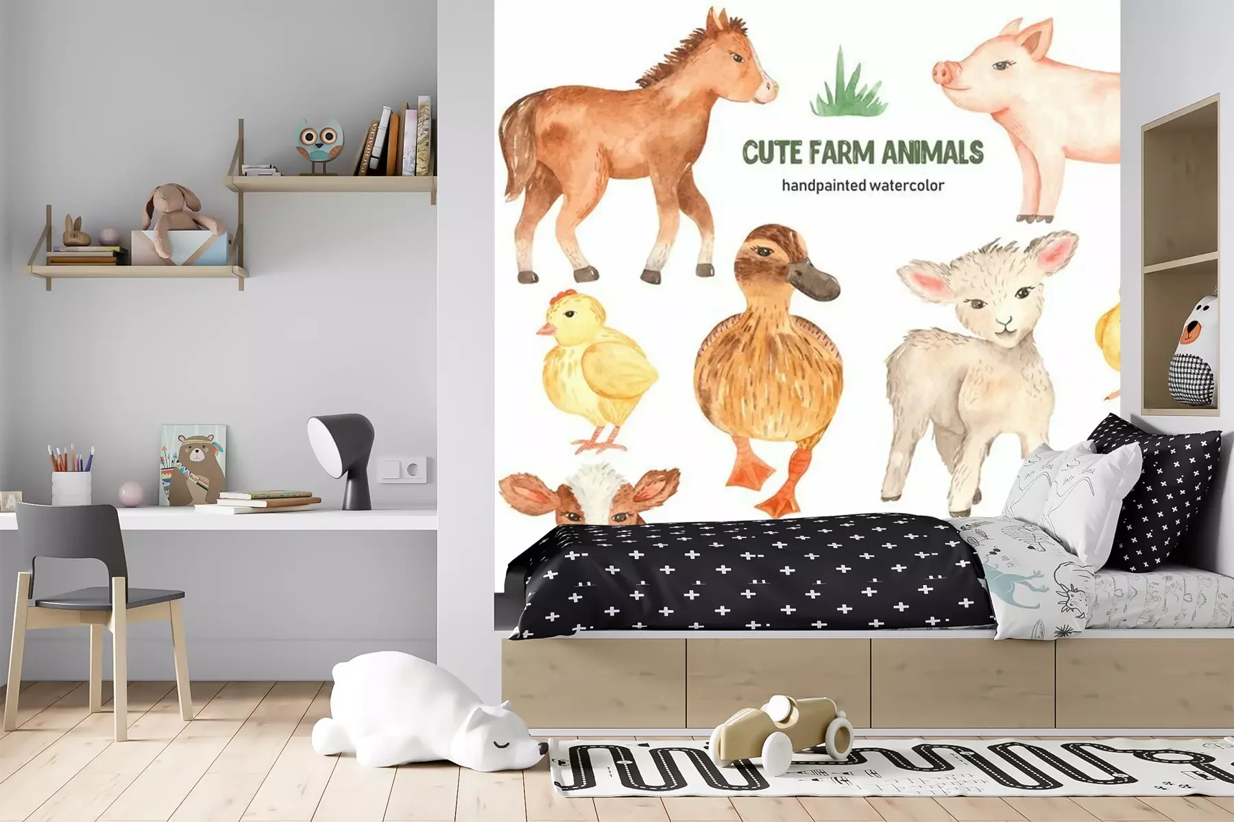 Sticker Cute farm animals horse, pig, lamb, calf, duck, duckling, watercolor chick