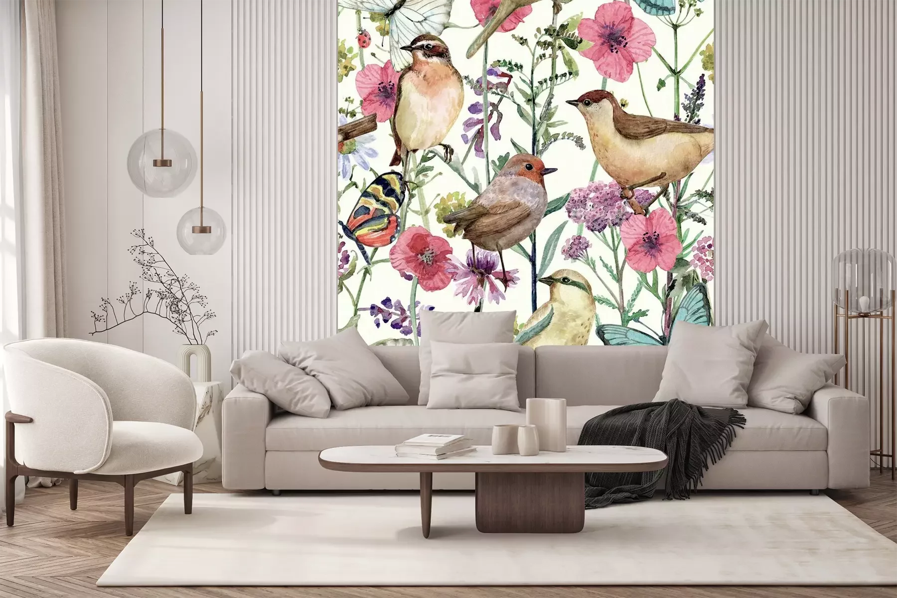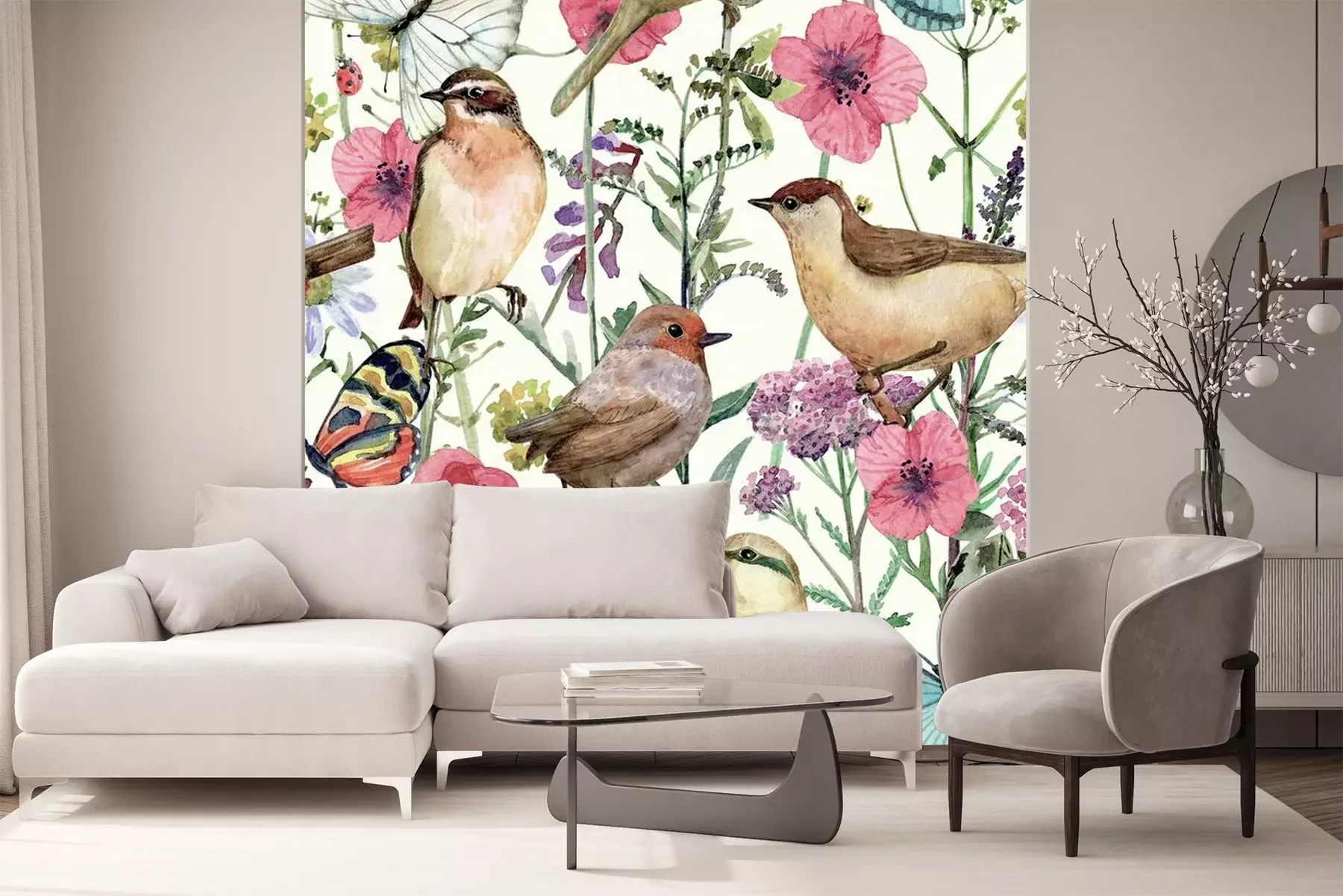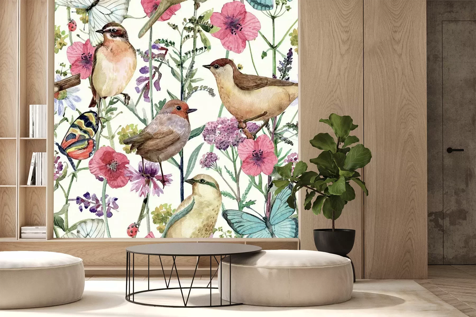 Sticker Cute seamless texture with pretty birds in meadow flowers. watercolor painting