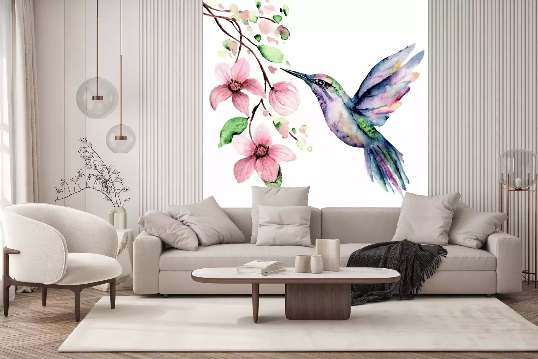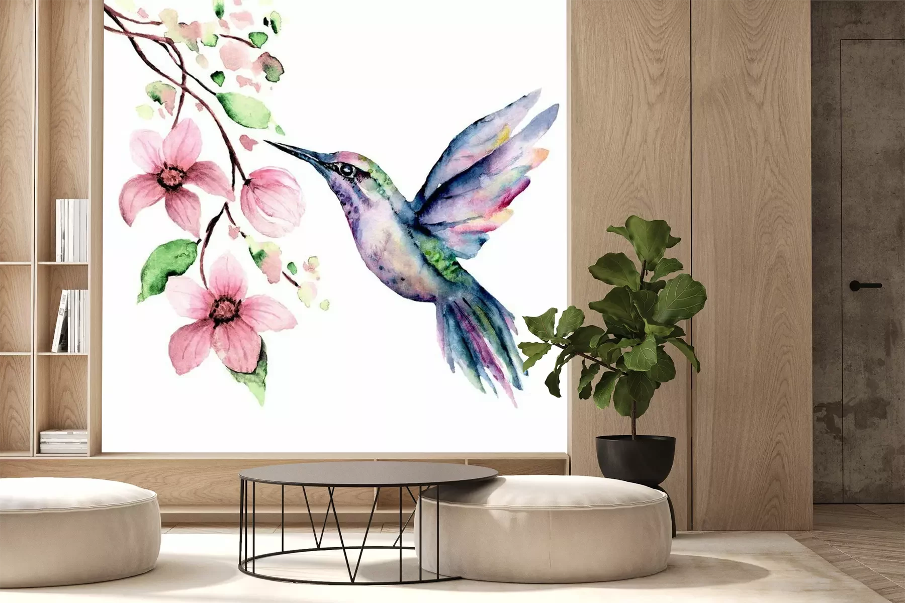 Sticker Flying hummingbird, watercolor illustration, tropical bird and flower isolated on white background, exotic, wild life clip art. Hand painting.