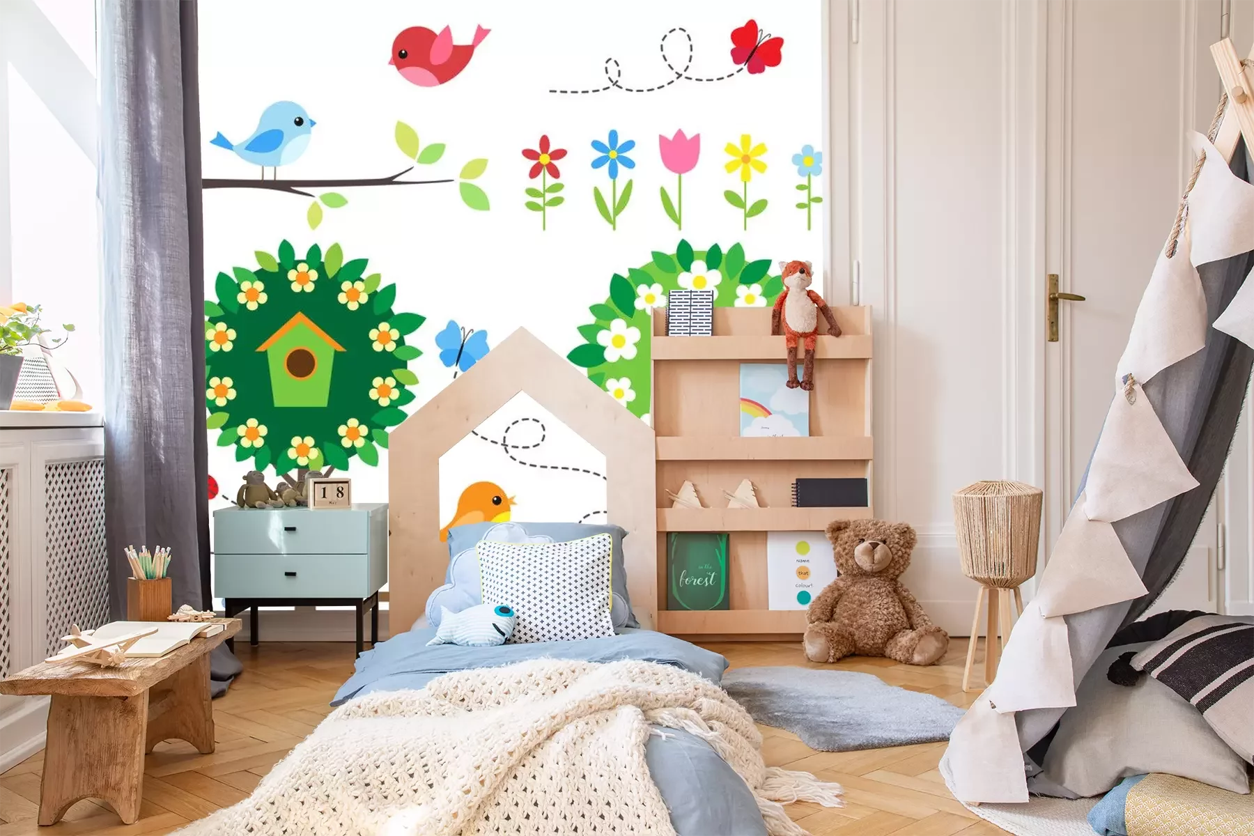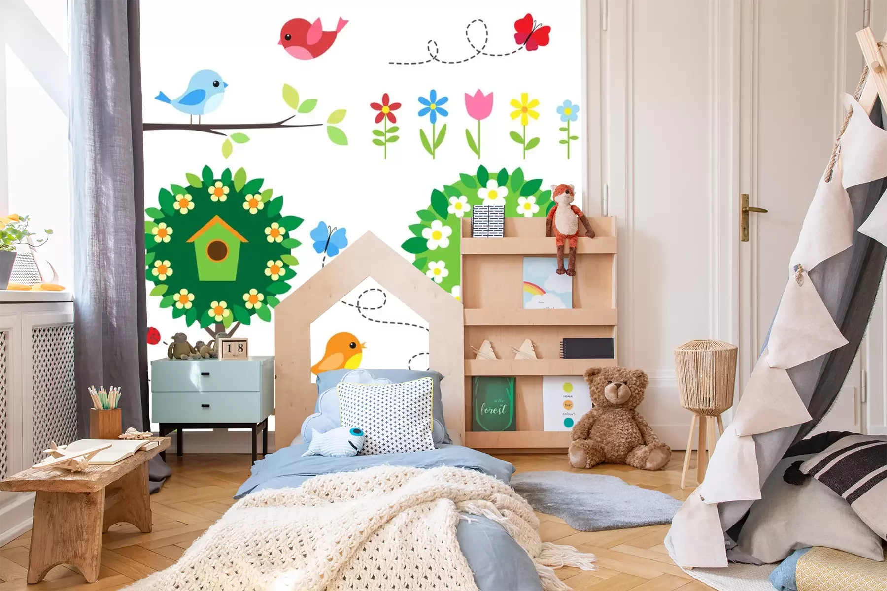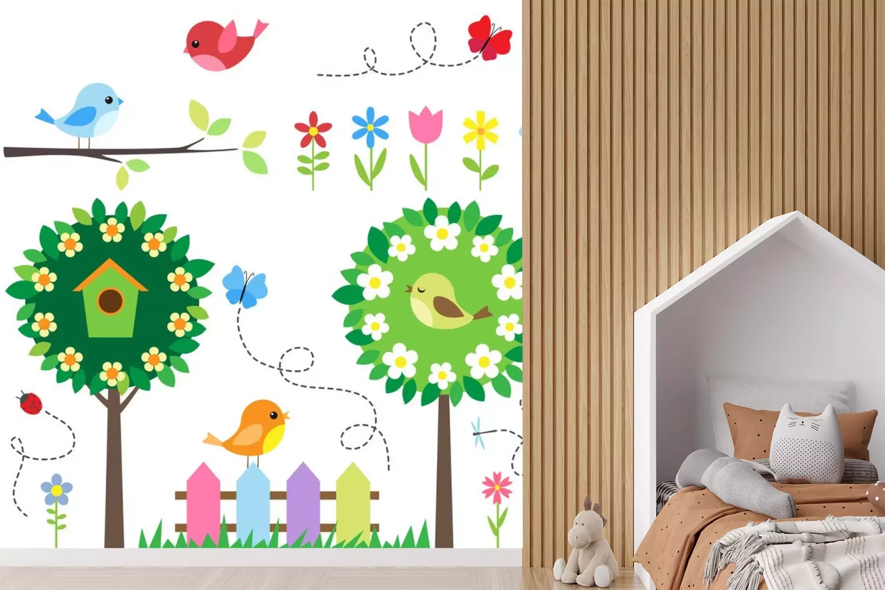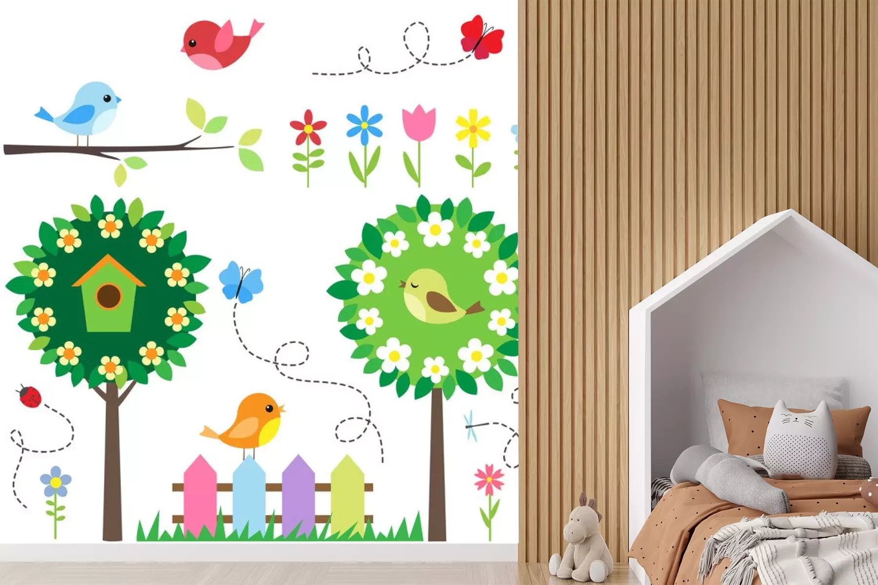 Sticker Garten mit Vögeln, blühenden Bäumen, Blumen und Insekten.
