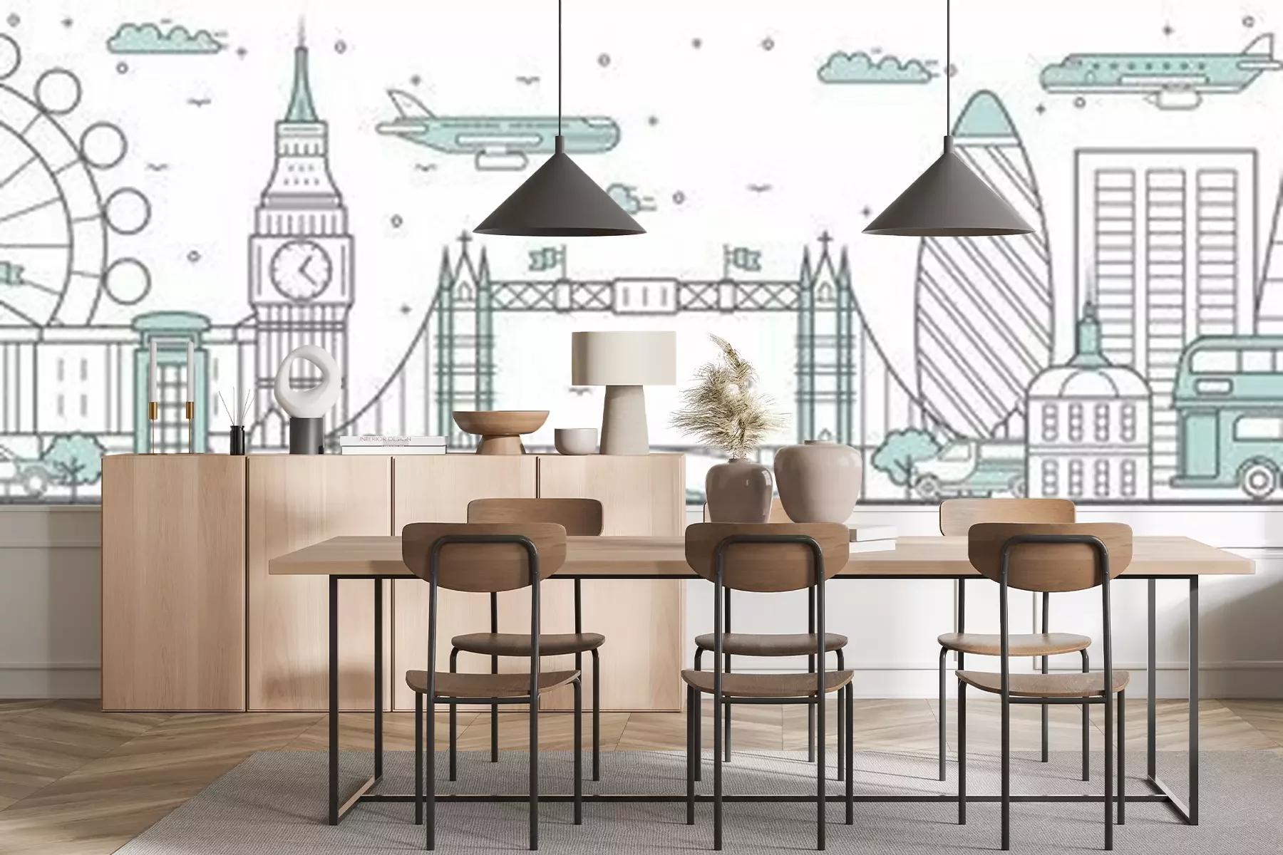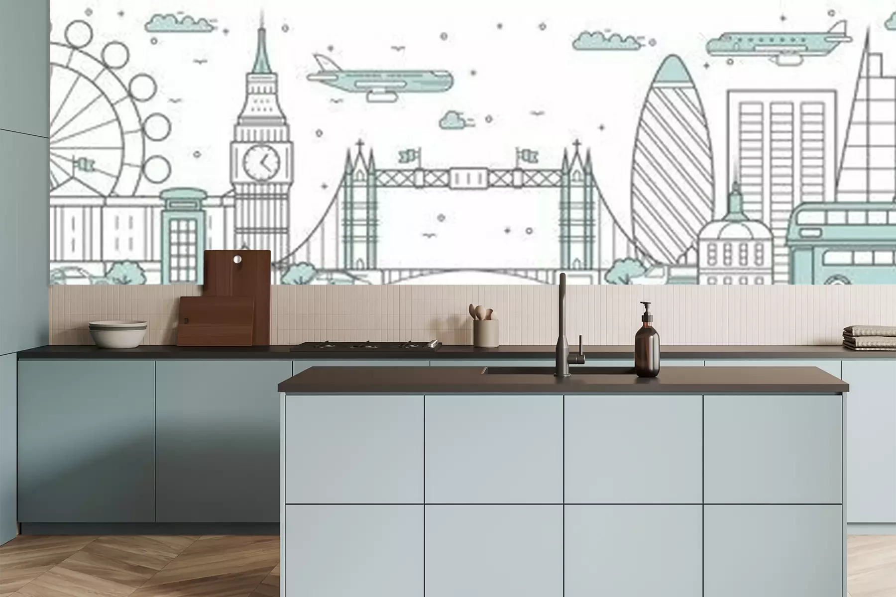 Sticker London skyline. Line cityscape with building landmarks horizontal panorama. London skyline with Big Ben, Tower Bridge street city sights. Capital city constructions outline, architecture concept