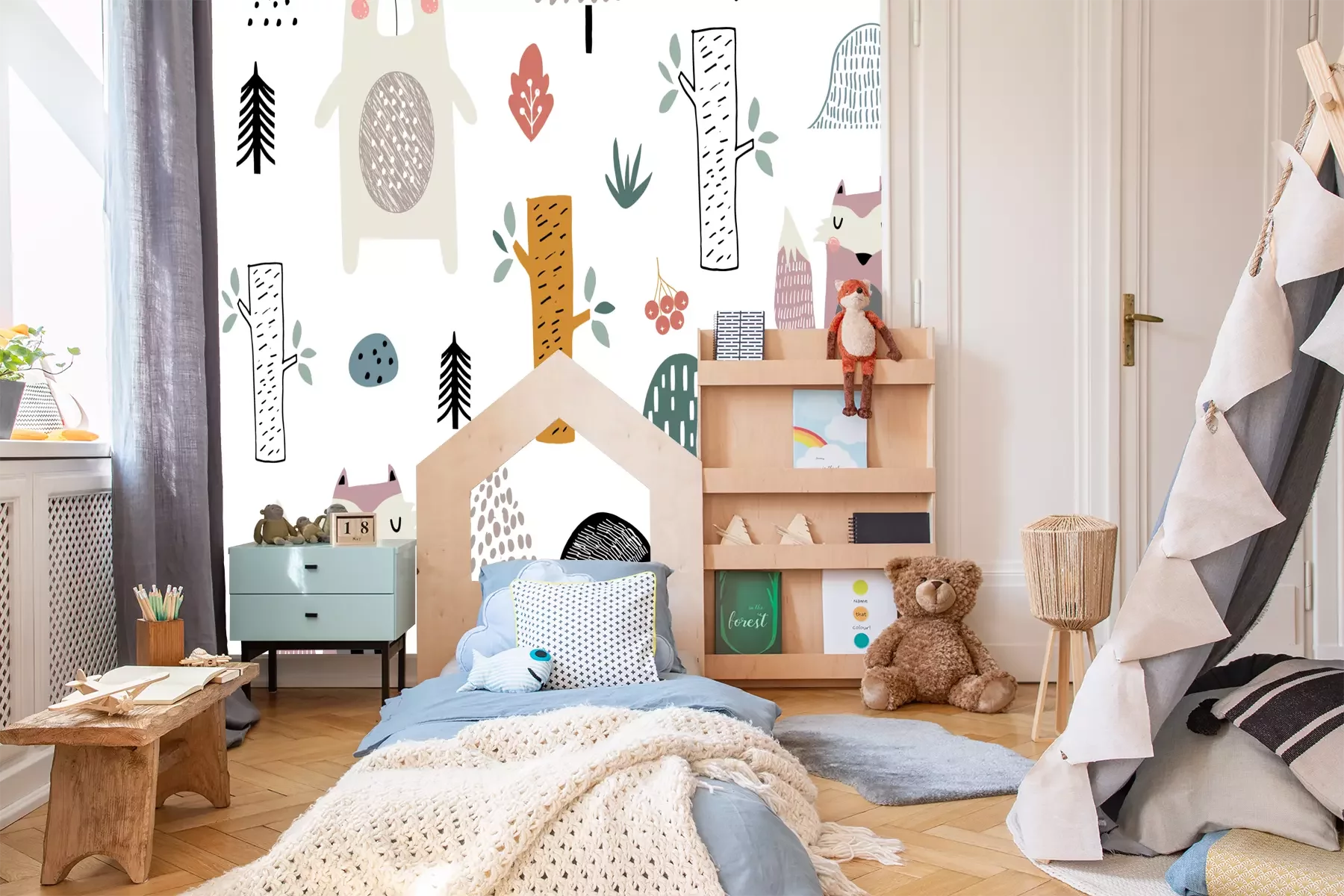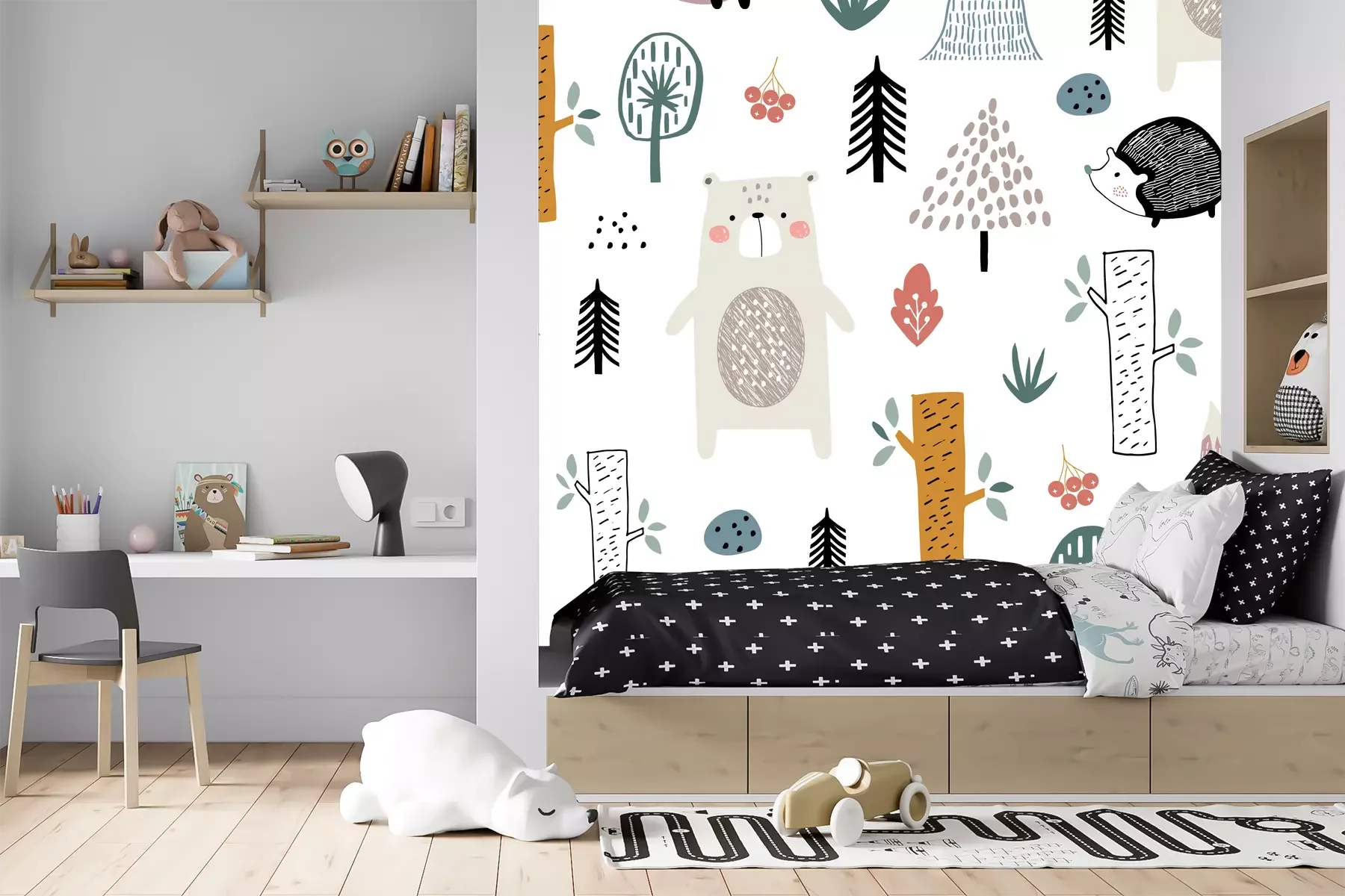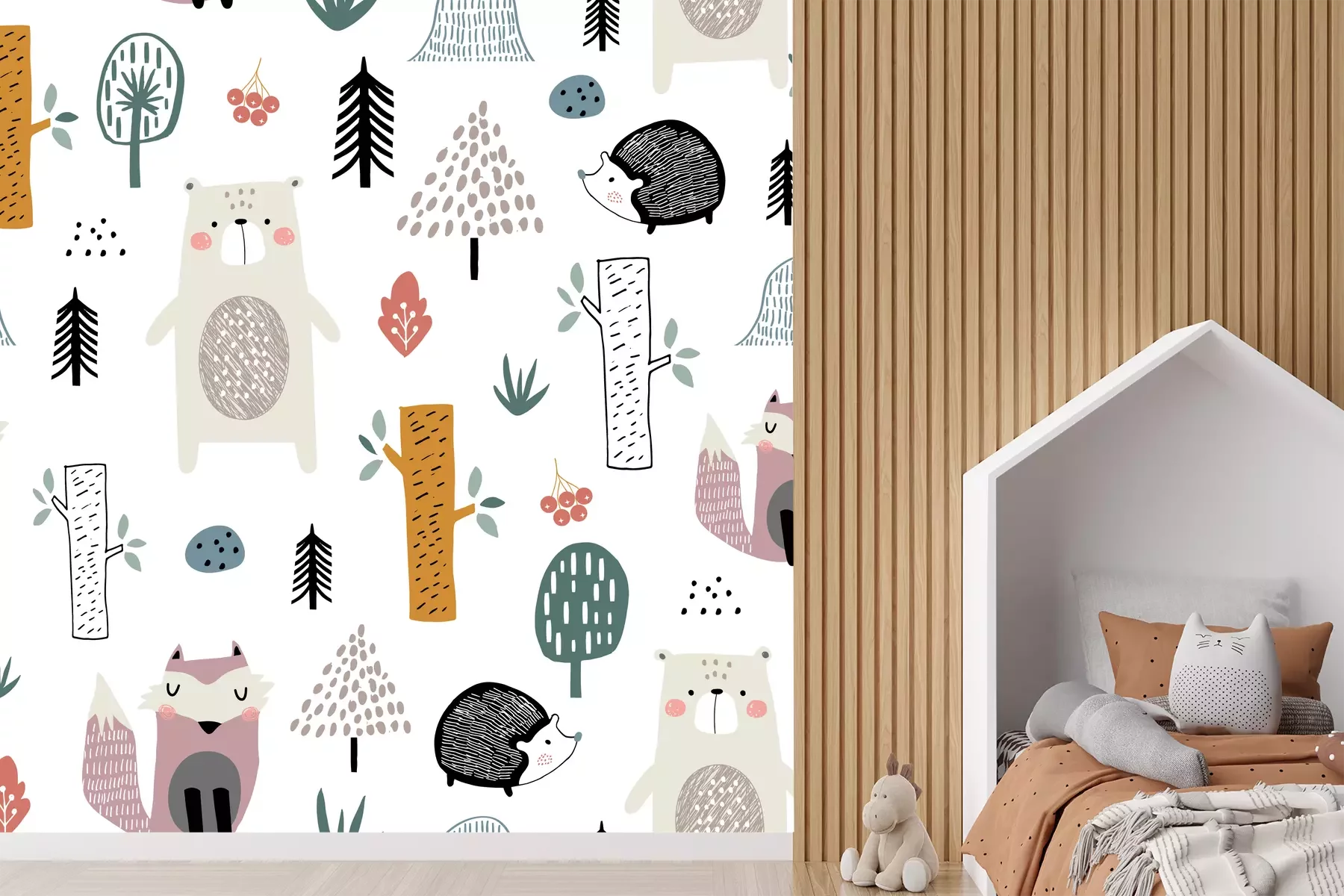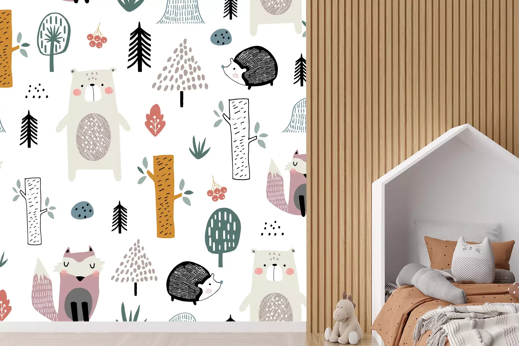 Sticker Seamless childish pattern with cute bear, fox, hedgehogs in the wood. Creative kids scandinavian style texture for fabric, wrapping, textile, wallpaper, apparel. Vector illustration