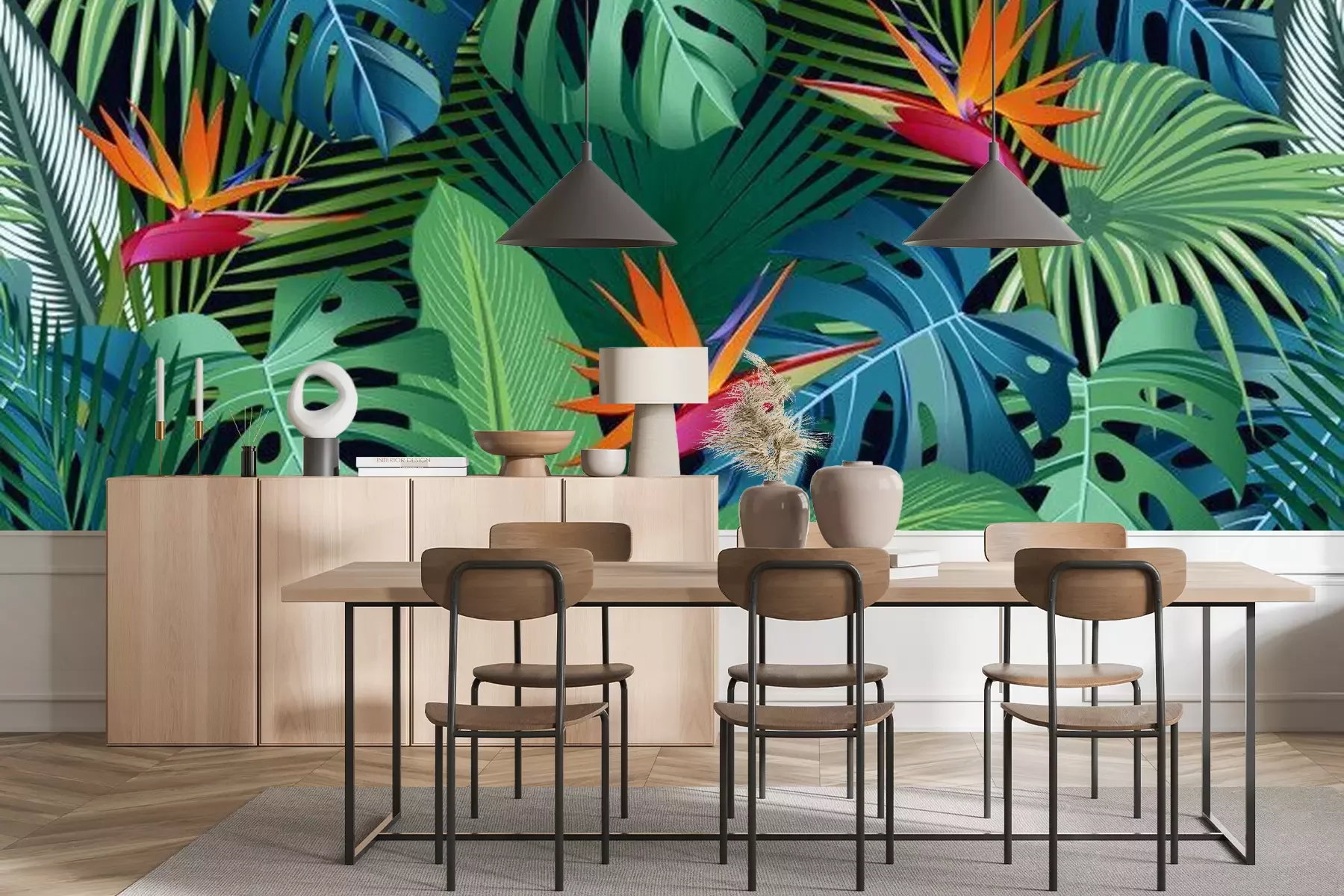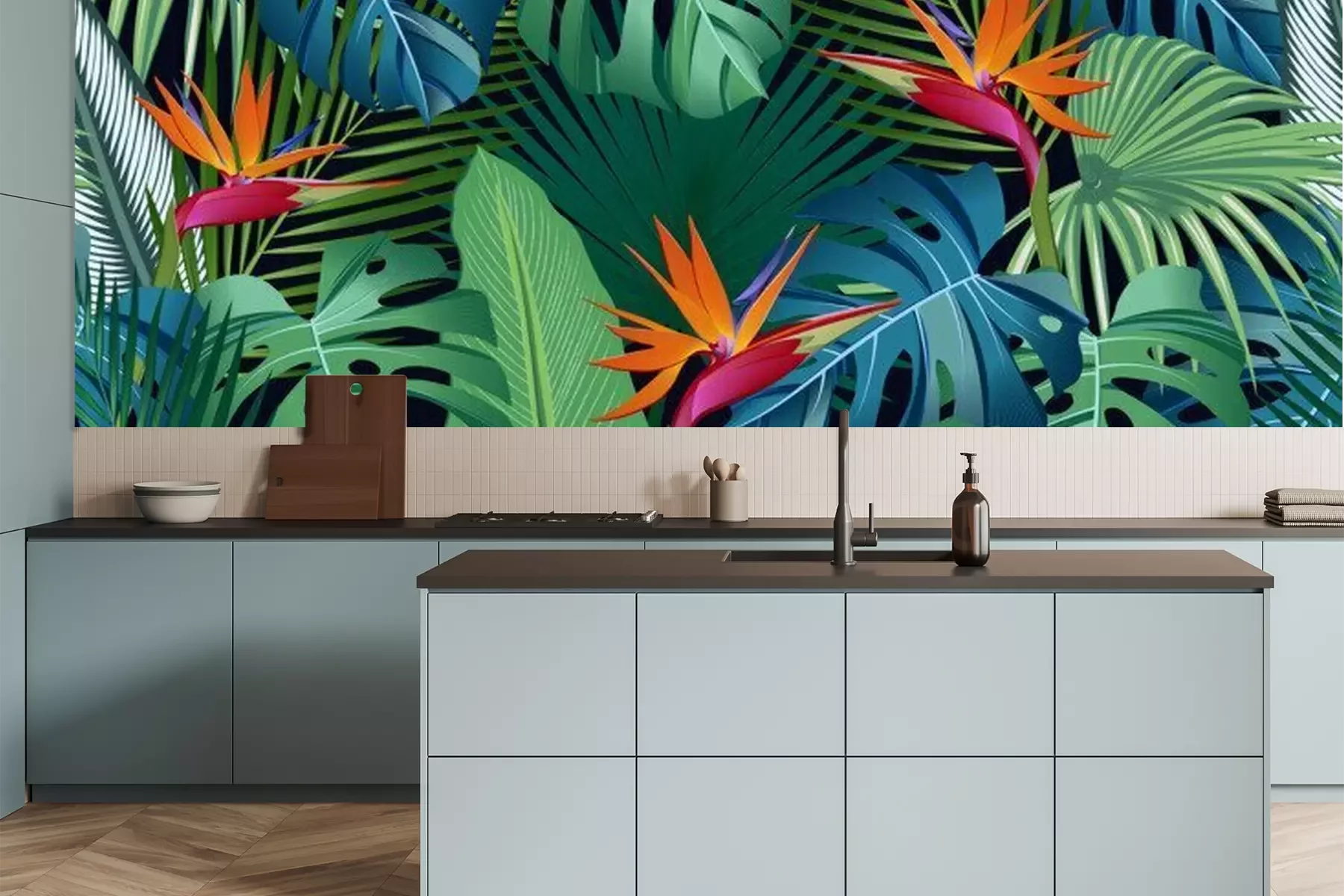 Sticker Seamless pattern tropical leaves with bird of paradise on black background