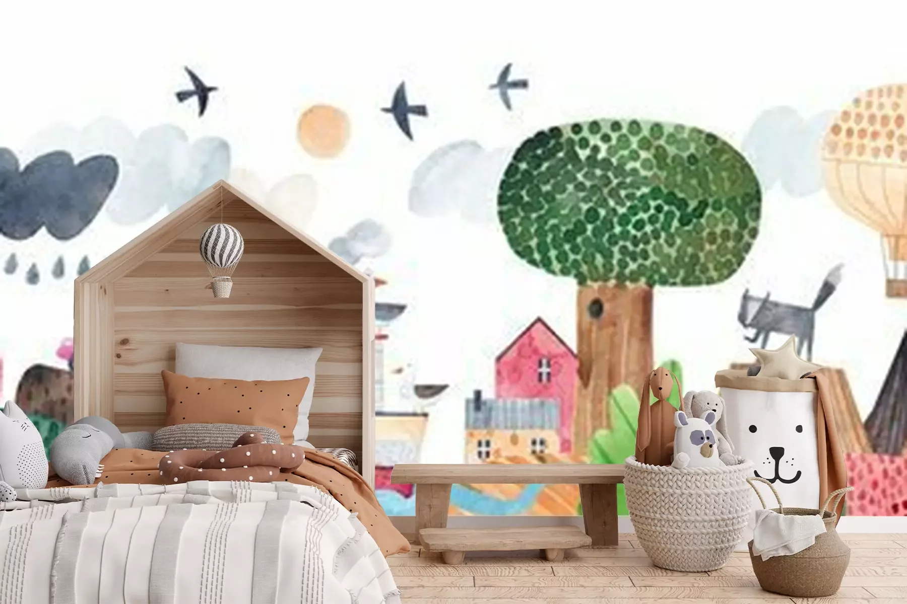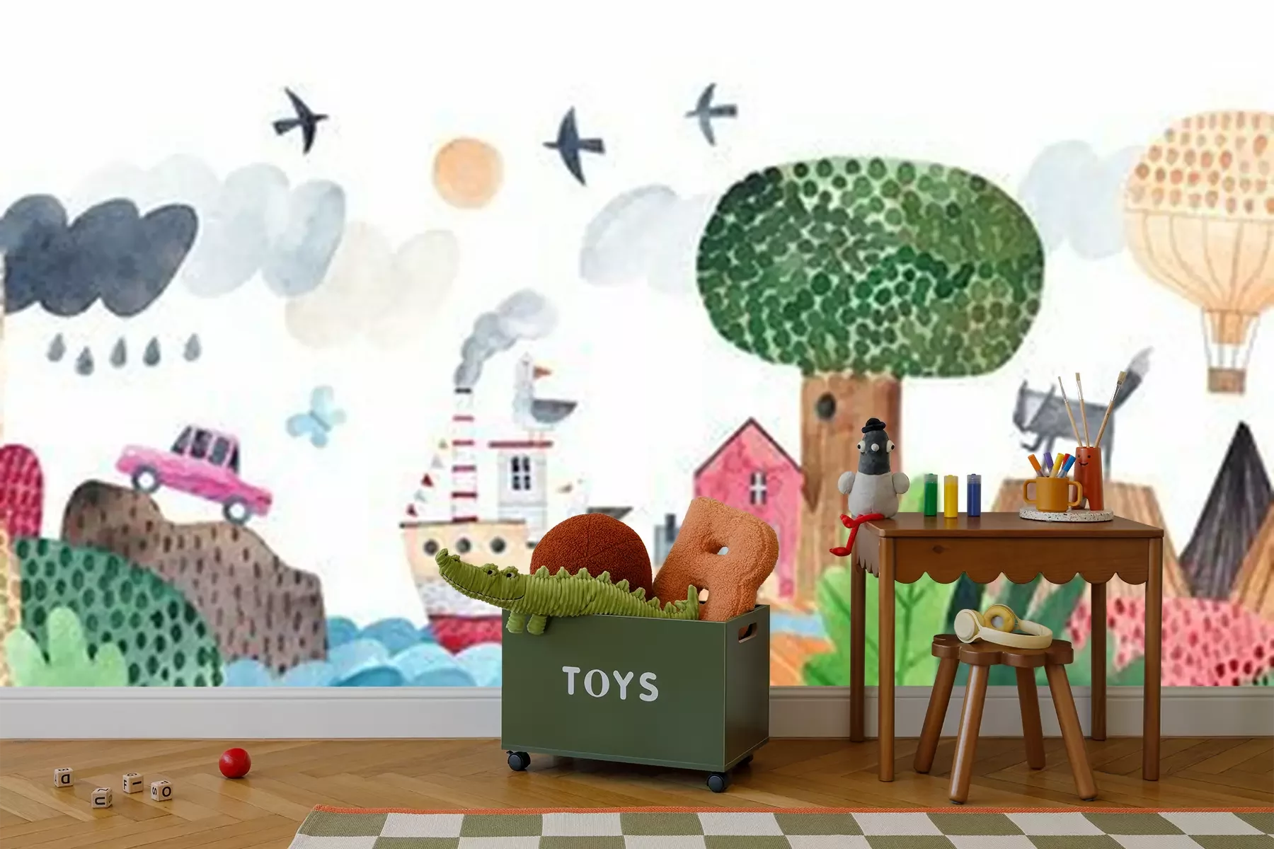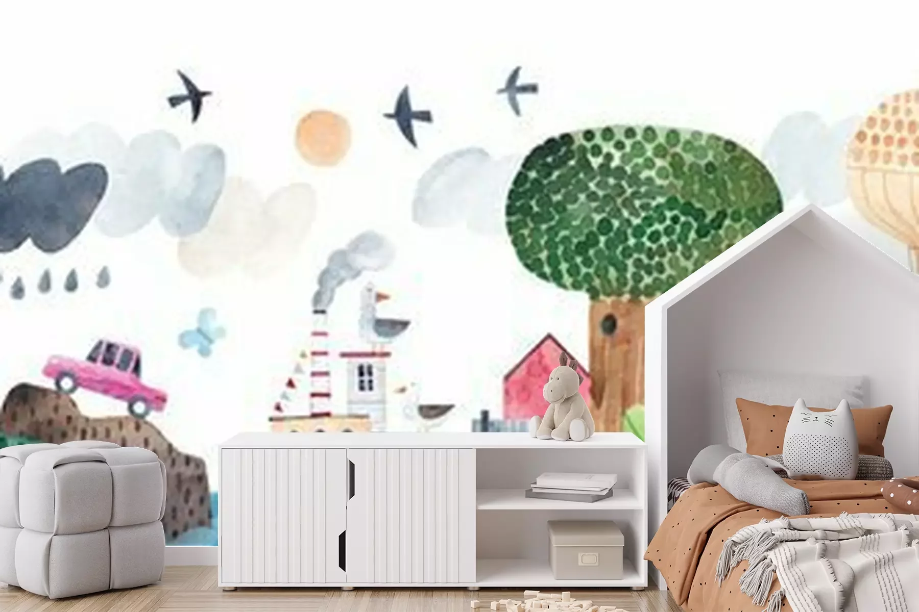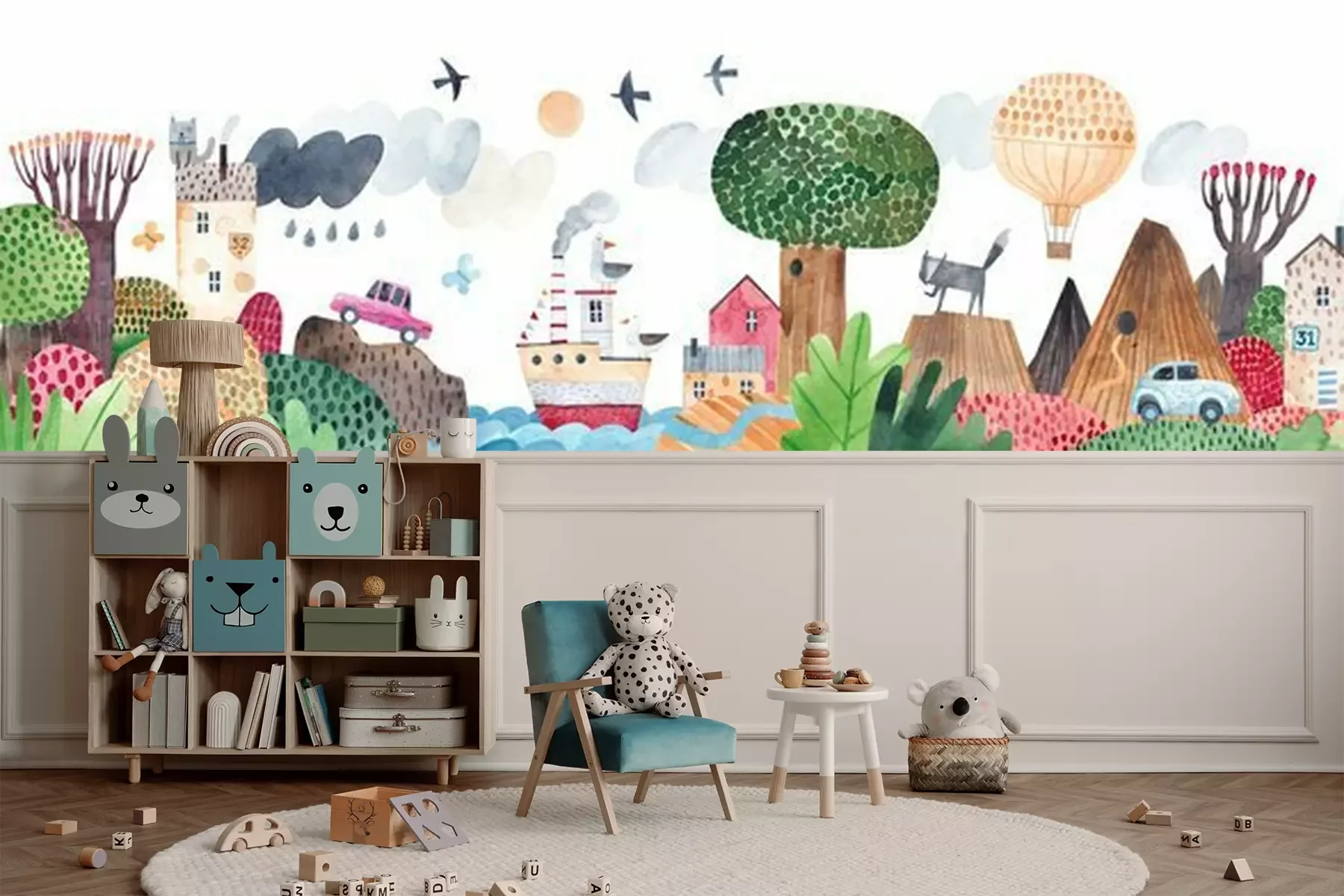 Sticker Summer. Watercolor landscape, mountains, hills, lake, trees and cute houses. Lake among the hills. Horizontal landscape.