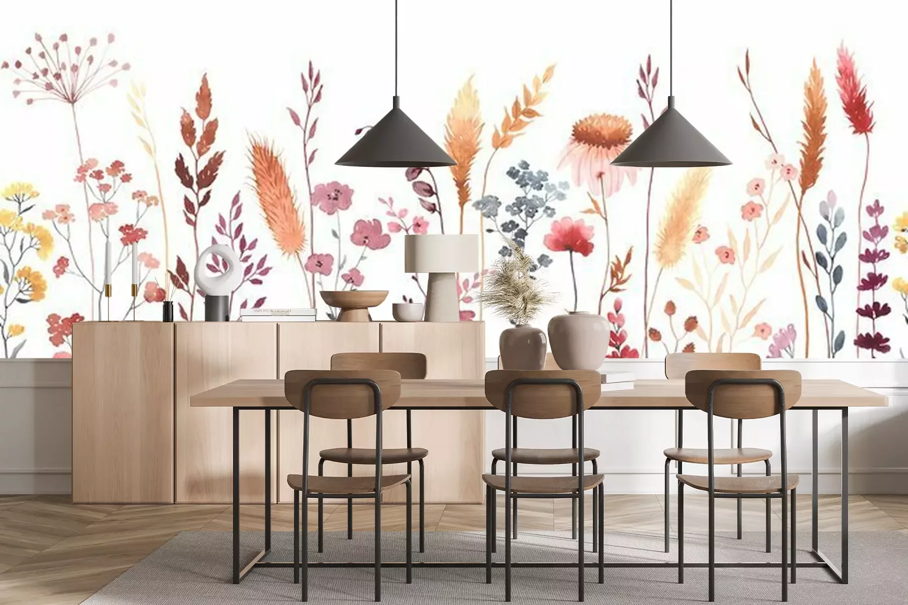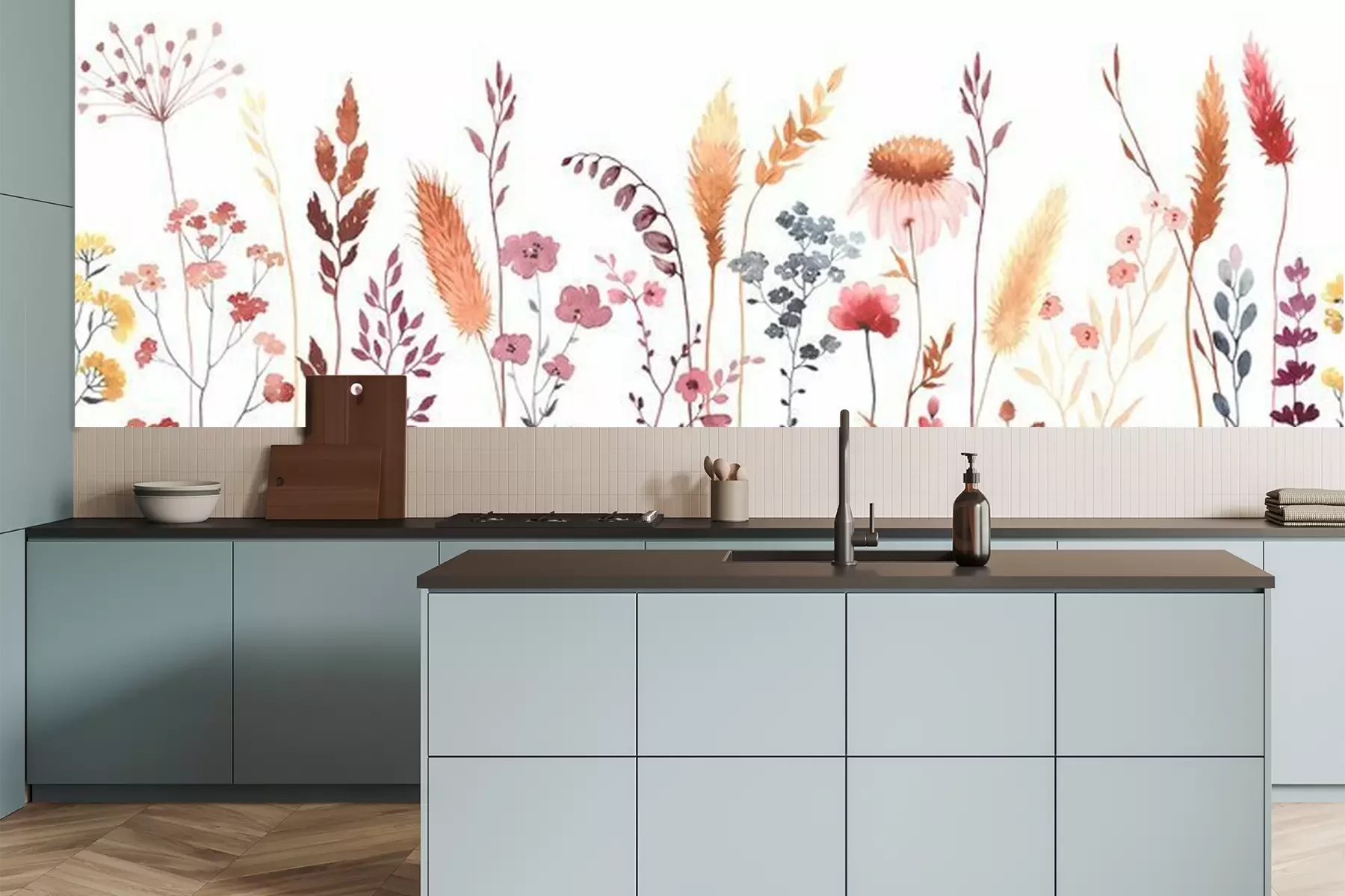 Sticker Watercolor floral seamless pattern with colorful wildflowers, plants and grass. Panoramic horizontal border, isolated illustration. Meadow in vintage style.