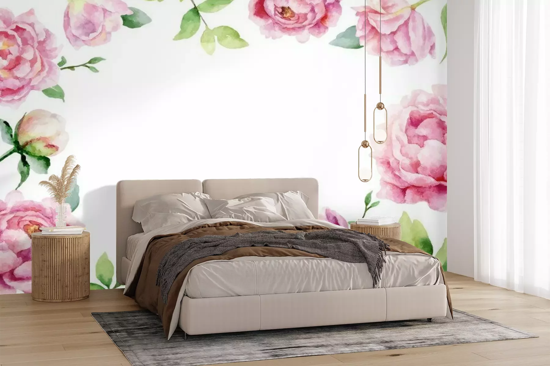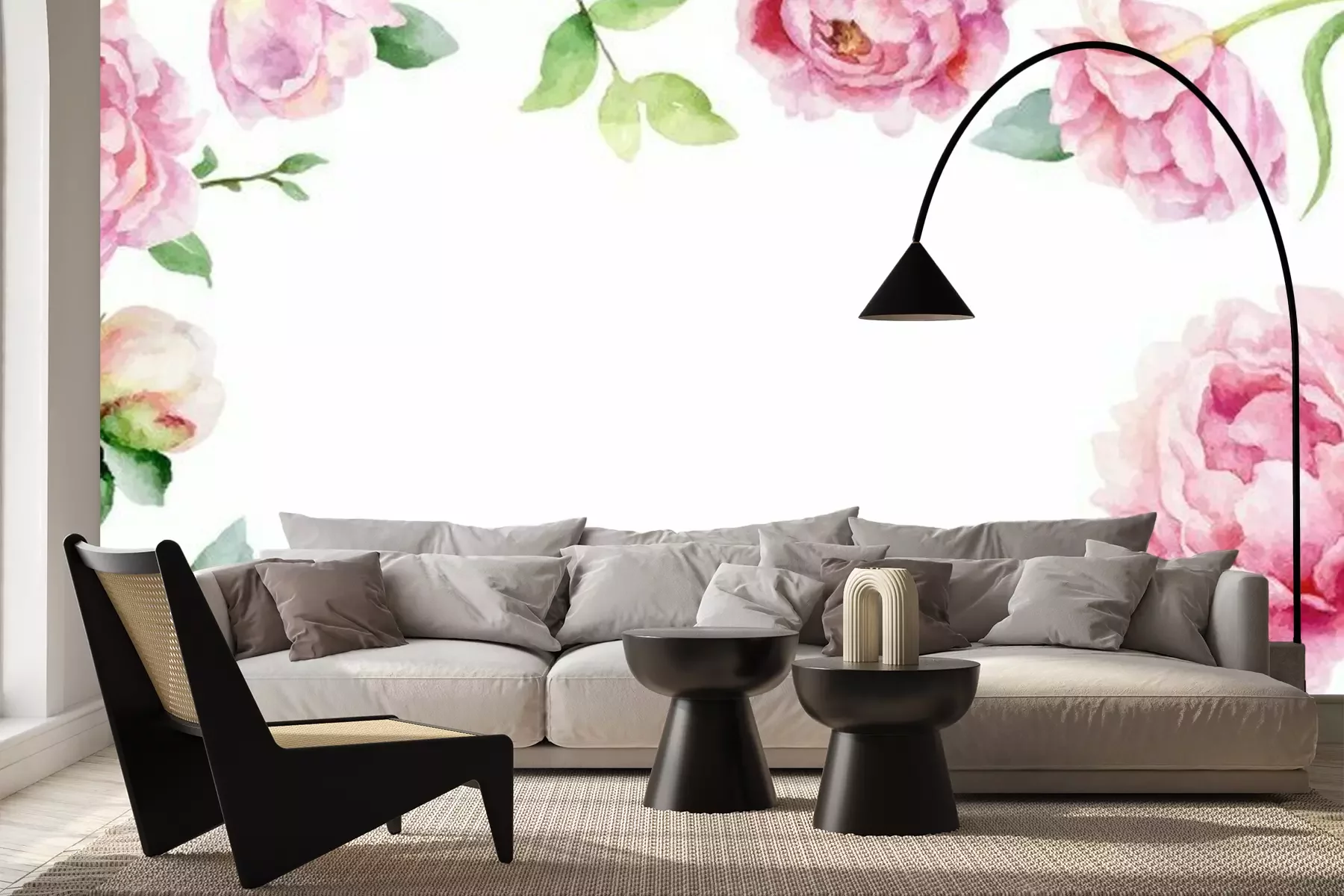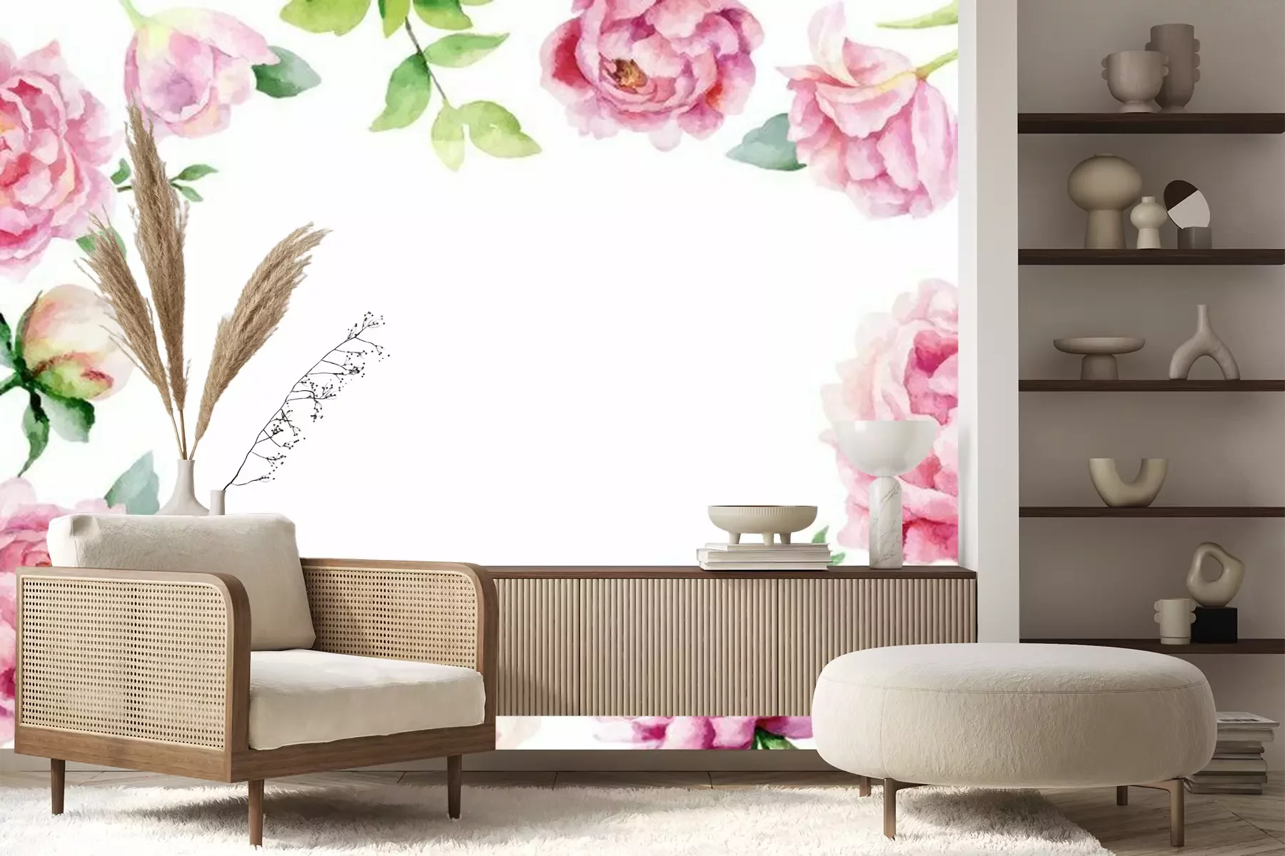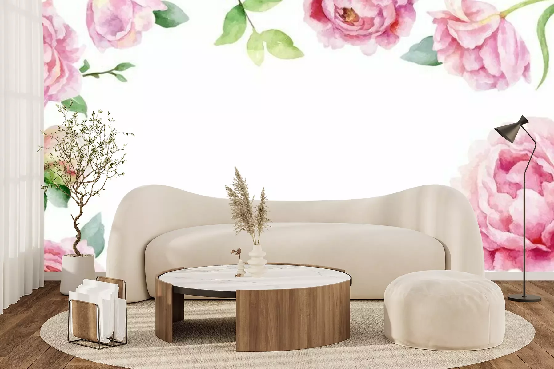 Sticker Watercolor vector hand painting card of peony flowers and green leaves.