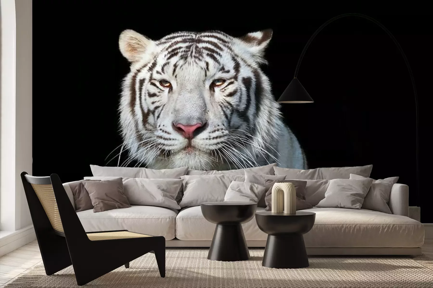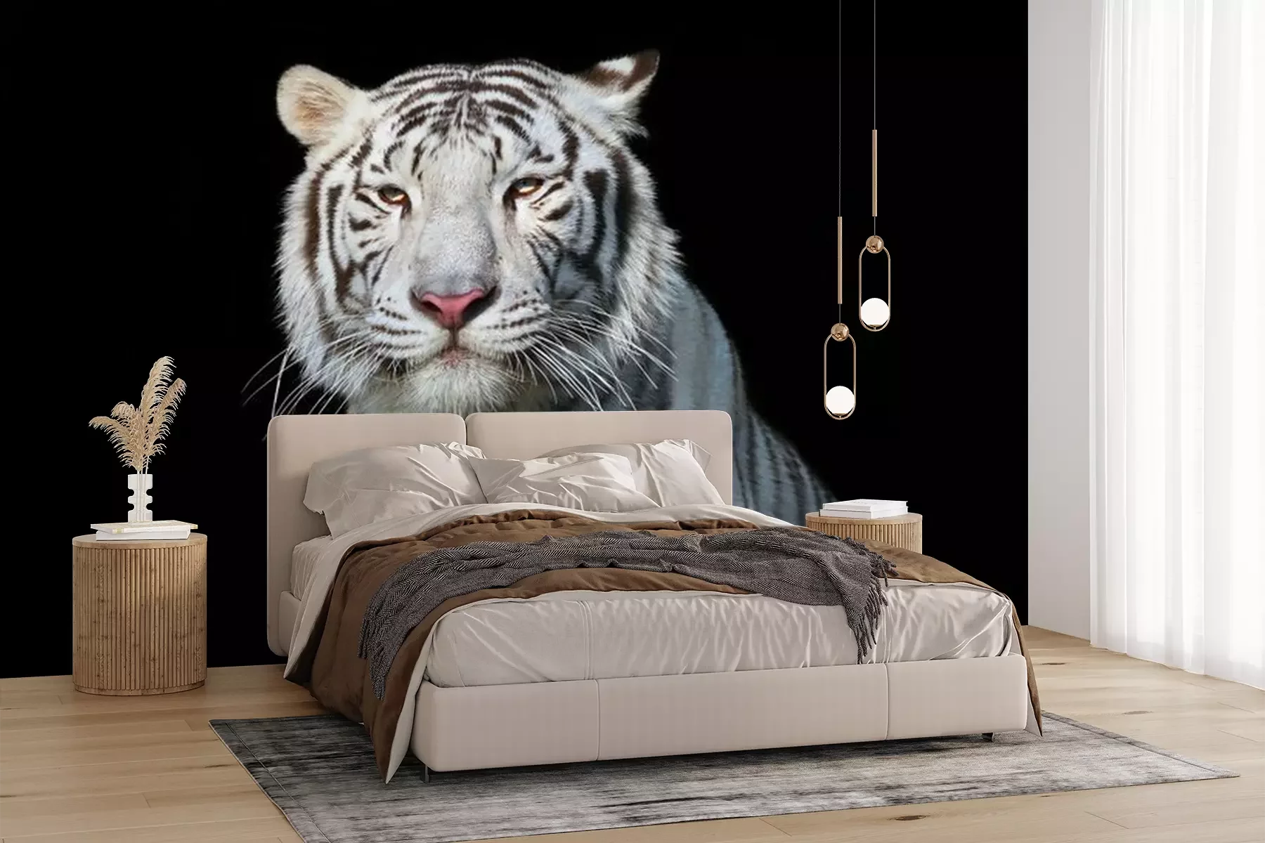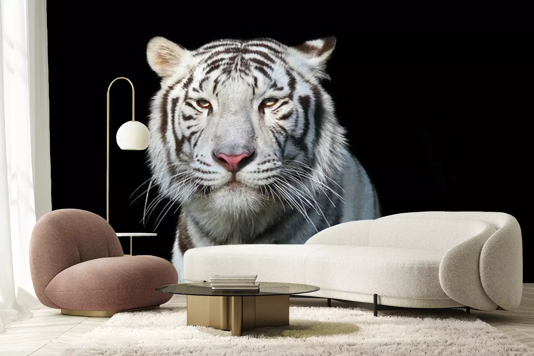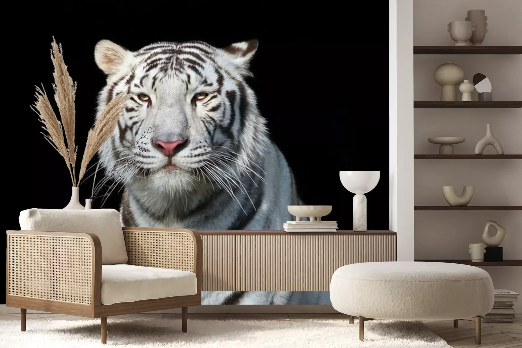 Sticker Weißer Bengal-Tiger auf schwarzem Hintergrund. Das gefährlichste Biest zeigt seine ruhige Größe. Wilde Schönheit einer schweren großen Katze.