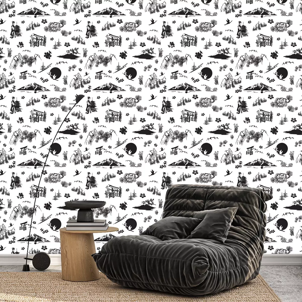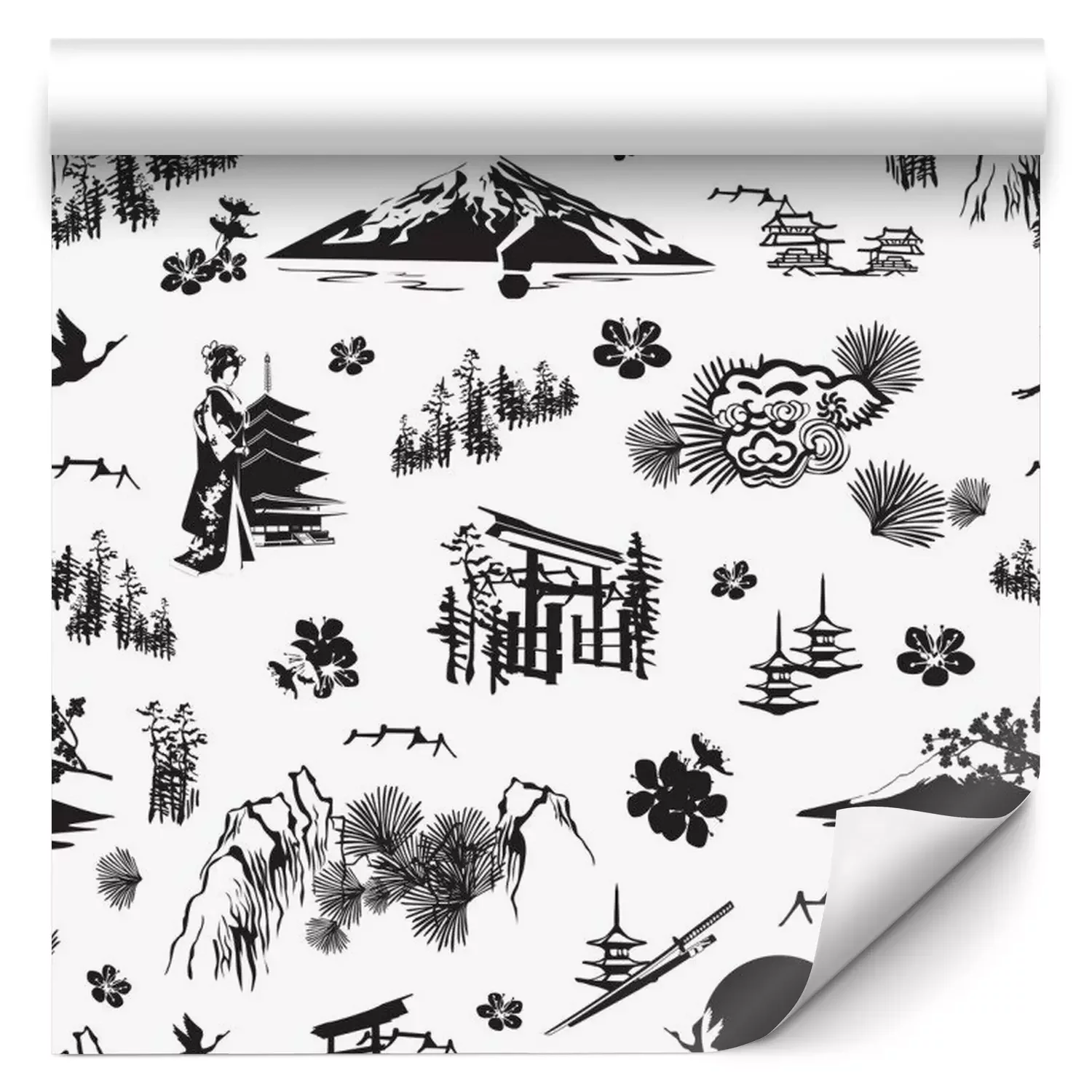 Tapete Ein nahtloses Muster mit Miniaturen, die Japan symbolisieren. Sakura, Kimono, Kiefern, Fuji, Torii, Laternen und andere