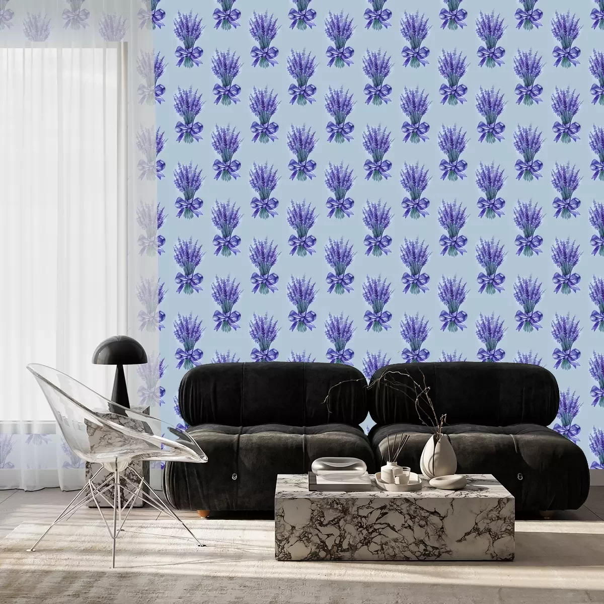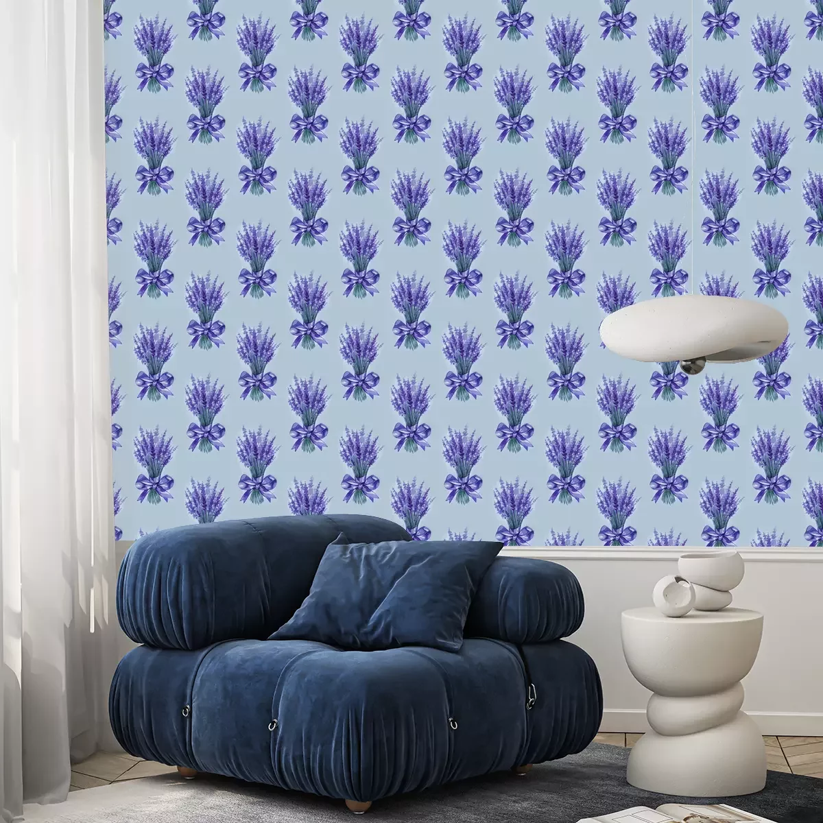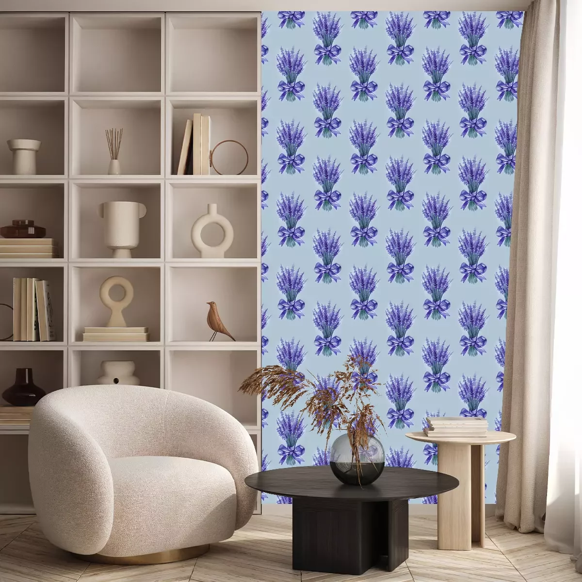 Tapete Lavender flowers purple watercolor seamless pattern. Beautiful violet lavender retro background. Elegant fabric on light background Surface pattern design.
