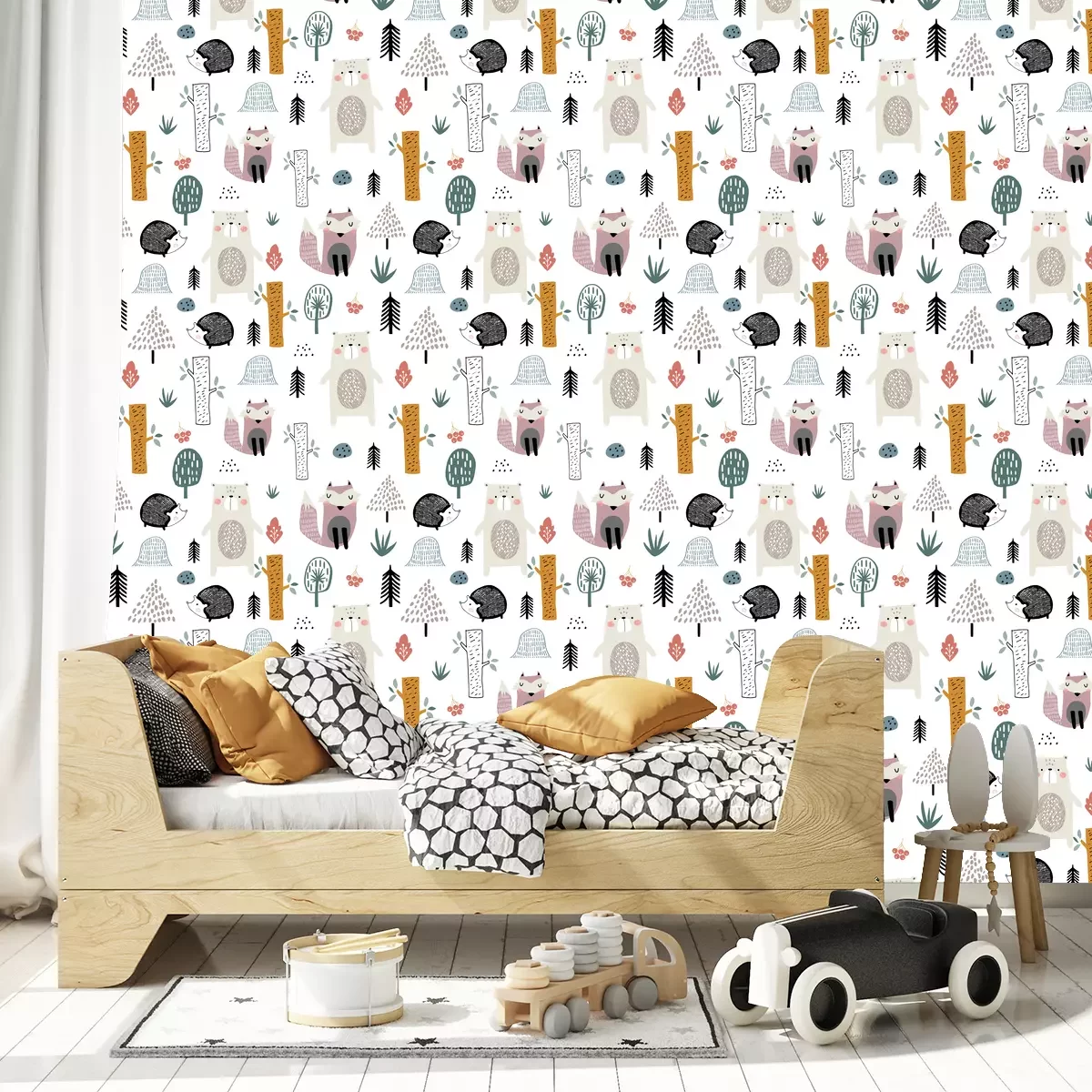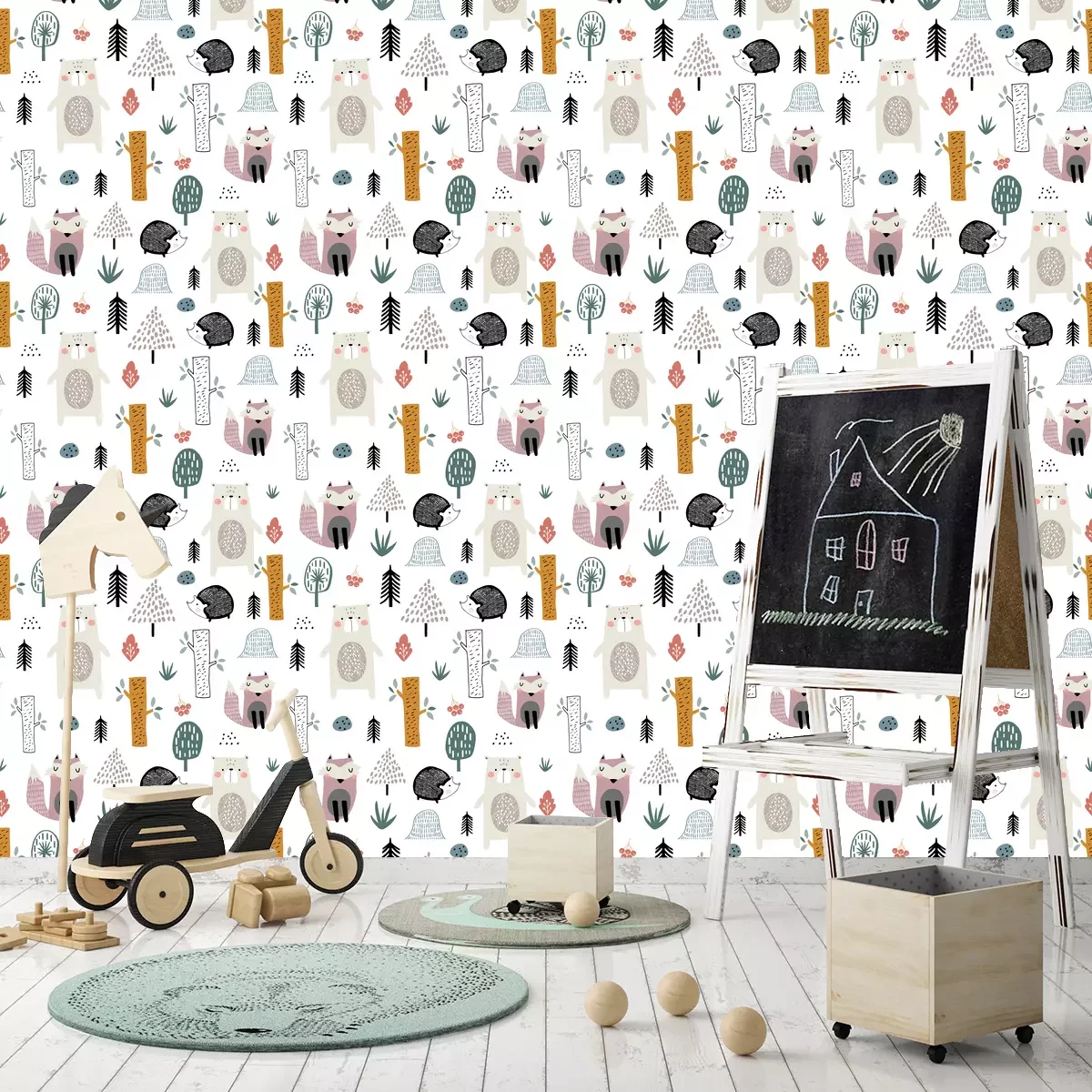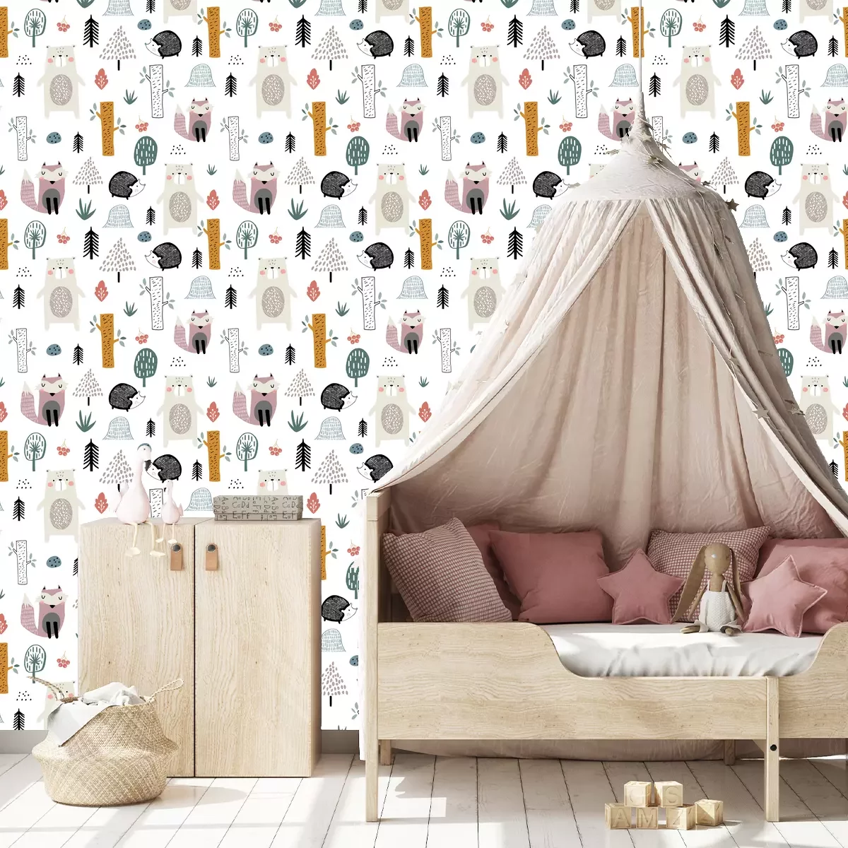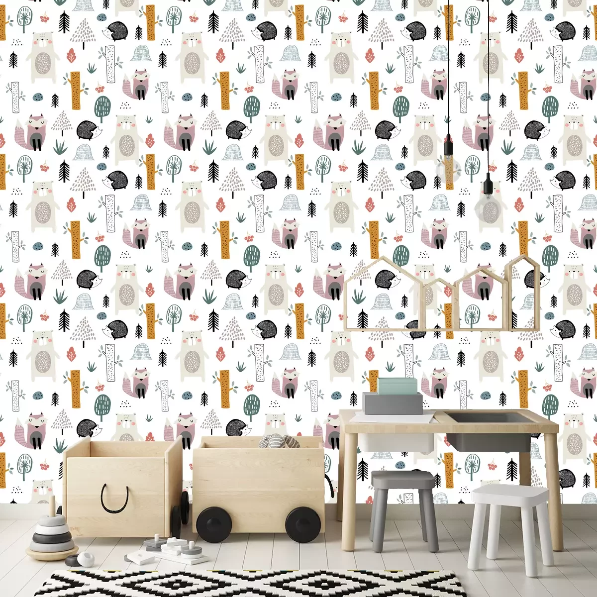 Tapete Seamless childish pattern with cute bear, fox, hedgehogs in the wood. Creative kids scandinavian style texture for fabric, wrapping, textile, wallpaper, apparel. Vector illustration