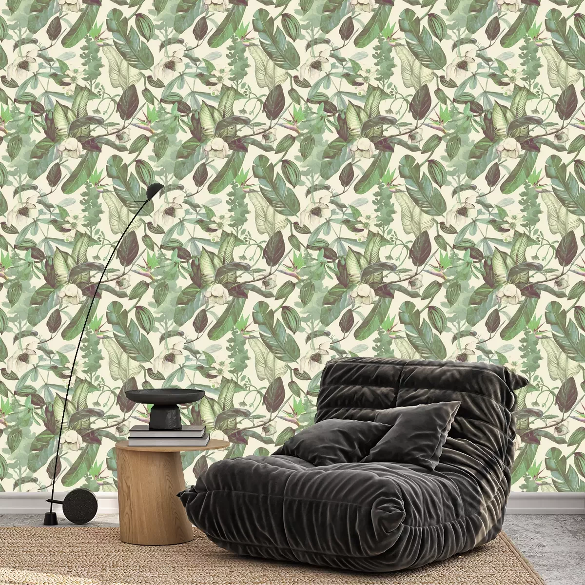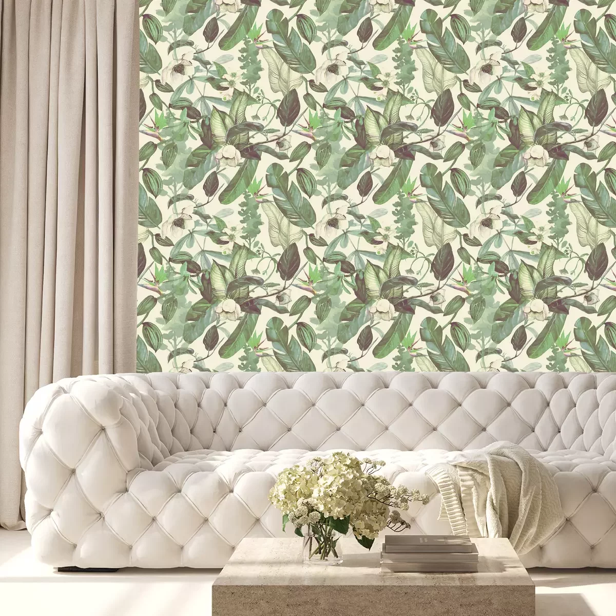 Eine Blumentapete, die Magnolien, Orangenblüten, Vanilleblumen und Paradiesvogelblumen darstellt, ist das perfekte Accessoire, das Frische und ein exotisches Flair in Ihr Interieur bringt. Das Muster strahlt wunderschöne Grüntöne aus, die sanft gedämpft sind und ihm einen Vintage-Touch verleihen. Tapeten mit Blumen sind die perfekte Wahl für diejenigen, die einzigartige und originelle Arrangements schaffen wollen. Ein exotisches Motiv sorgt für viele Einsatzmöglichkeiten einer solchen Tapete. Blumen können als Deko-Akzent im Wohnzimmer, im Schlafzimmer, im Büro oder sogar im Bad verwendet werden. Ihr originelles Design verleiht jedem Raum eine ungewöhnliche Note und sorgt für eine tropische Stimmung. Sie fragen sich: Mit wie vielen Einrichtungsstilen harmonieren diese Tapeten? Blumen an der Wand sind die perfekte Ergänzung, wenn Sie den tropischen oder Boho-Stil mögen. Exotische Motive und zarte Farben fügen sich perfekt in die Ästhetik dieser Stile ein. Sie können ein solches Muster auch mit einem minimalistischen Interieur kombinieren und ihm einen Hauch von Leben und Farbe verleihen. Eine florale Tapete funktioniert auch in Kombination mit dem skandinavischen Stil, wo sie einen interessanten Kontrast zwischen den geraden Linien und dem Reichtum tropischer Blumen bildet. Die Vorteile dieser Tapete sind zahlreich. Sie bringt Frische und Natürlichkeit in den Innenraum wie echte Blumen. Tapete mit blühenden Magnolien, Orangenblüten, Vanilleblumen und Paradiesvogelblumen sorgt für einen Hauch von natürlicher Schönheit. Diese Dekoration vermittelt einen angenehmen Eindruck von Grün, aber in einer gedämpften Form, was sie ideal für diejenigen macht, die zarte Grüntöne bevorzugen. Zudem verleiht ihr leicht vintageartiger Charakter dem Interieur Einzigartigkeit und Originalität. Moderne Blumentapeten schaffen eine angenehme Atmosphäre im Innenraum und erleichtern die Entspannung.