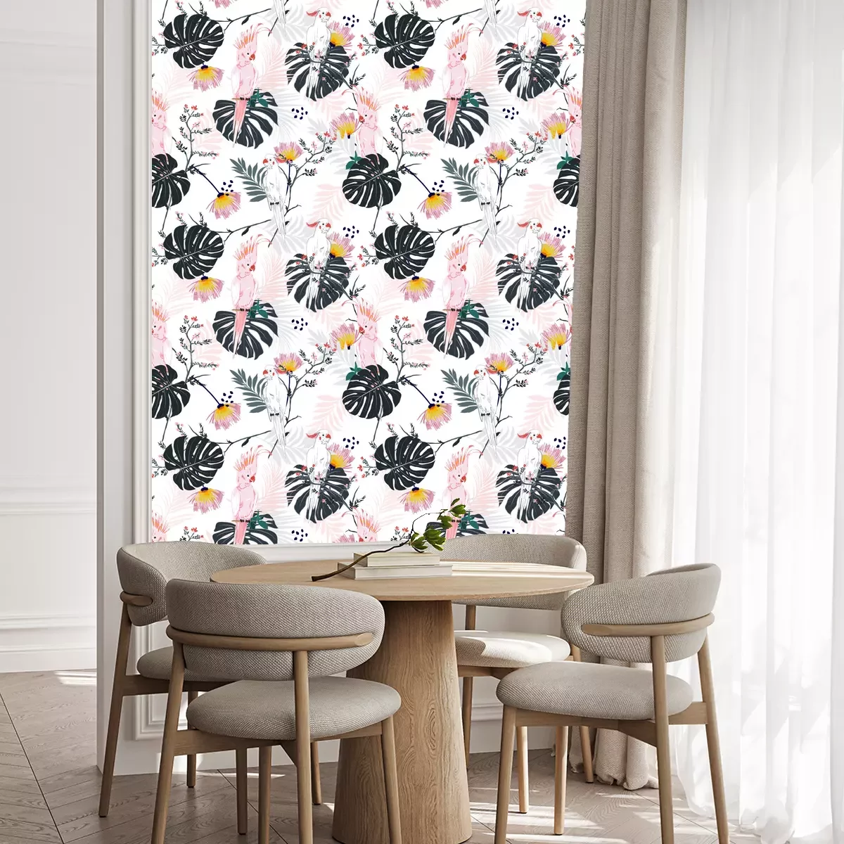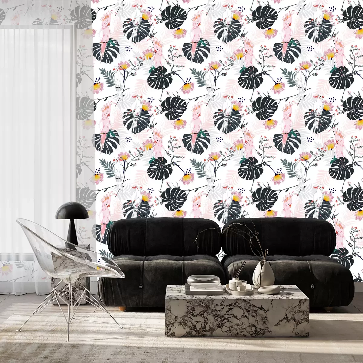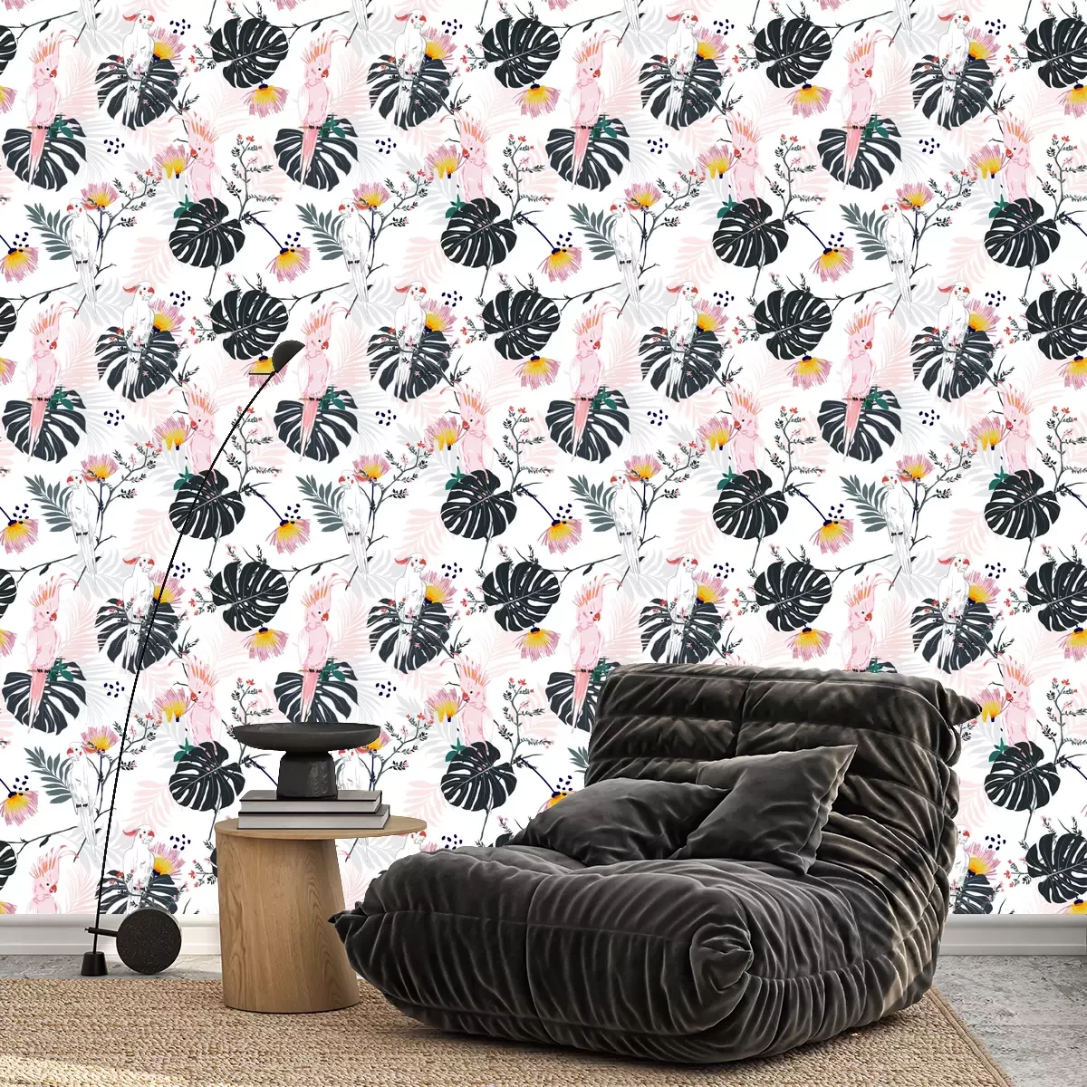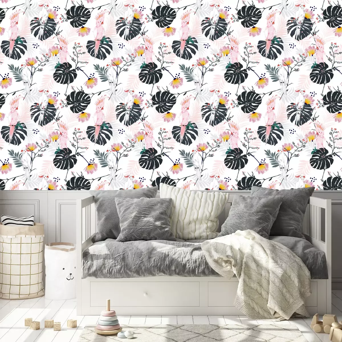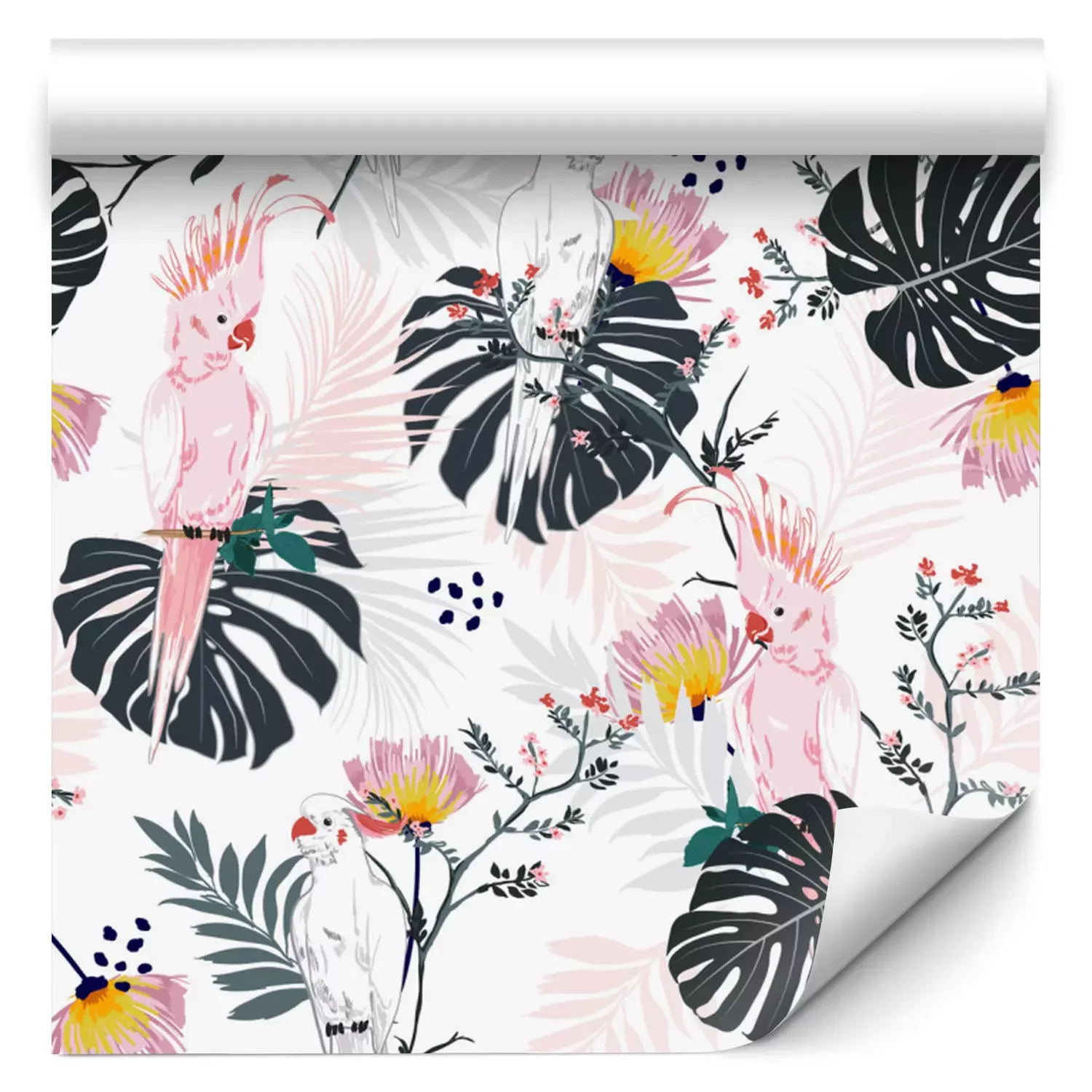 Tapete Trendy Sommer tropischer Blumendruck. Papageienvogel im Dschungel und Blumen im exotischen Wald allover Design, nahtloser Mustervektor für Mode, wallpaoer und alle Drucke