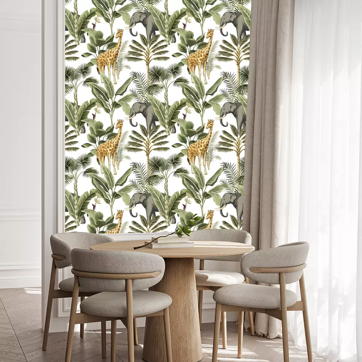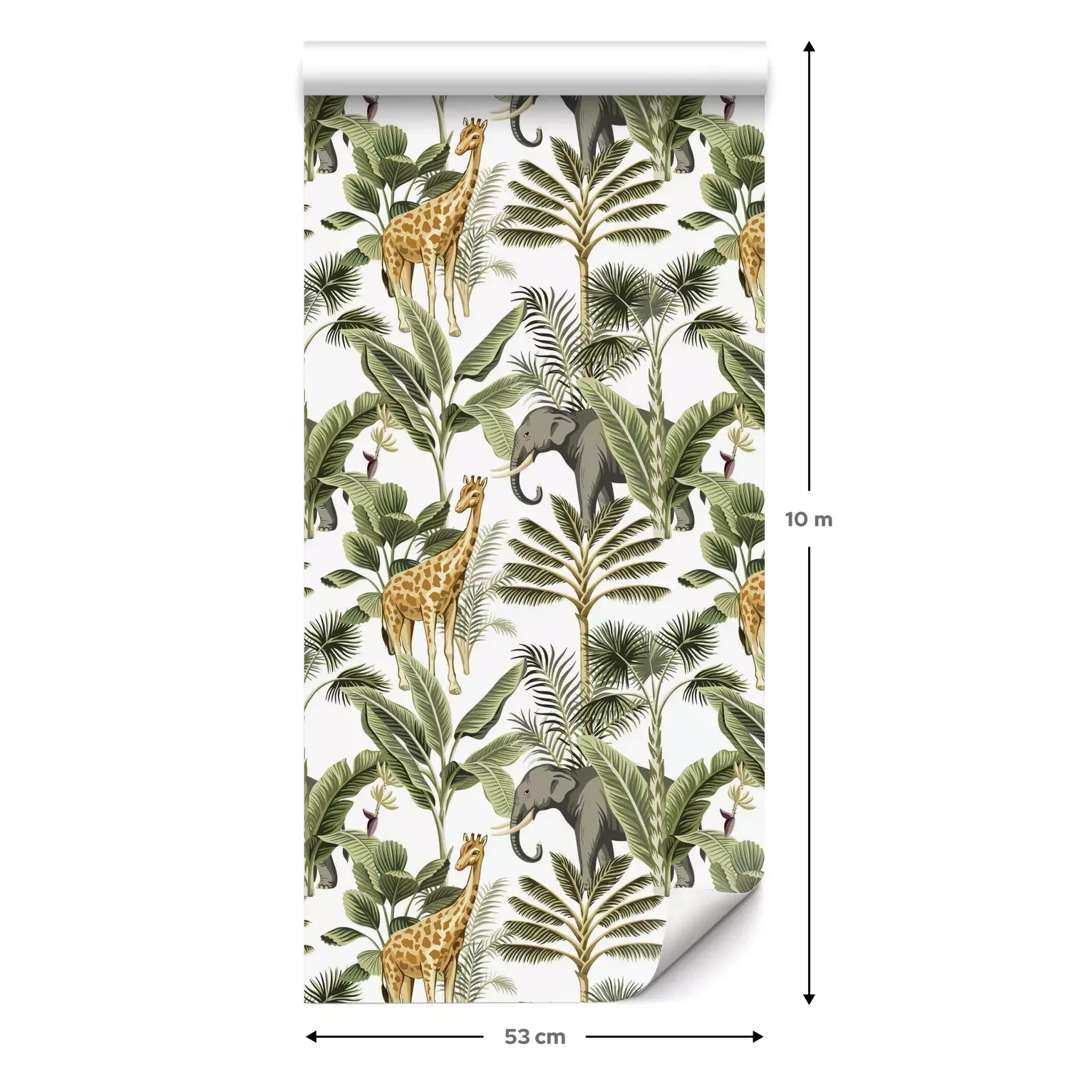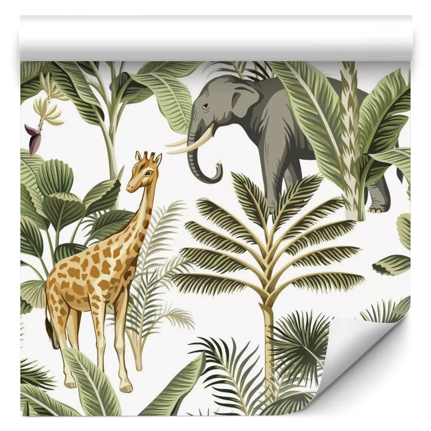 Tapete Tropical vintage elephant, giraffe wild animals, palm tree and plant floral seamless pattern white background. Exotic jungle safari wallpaper.