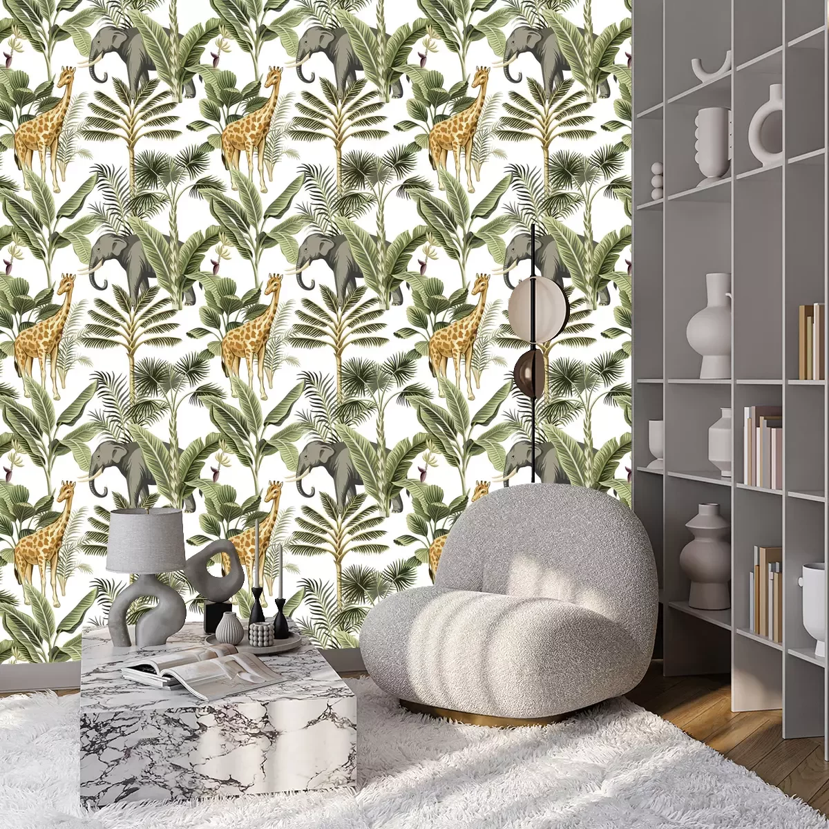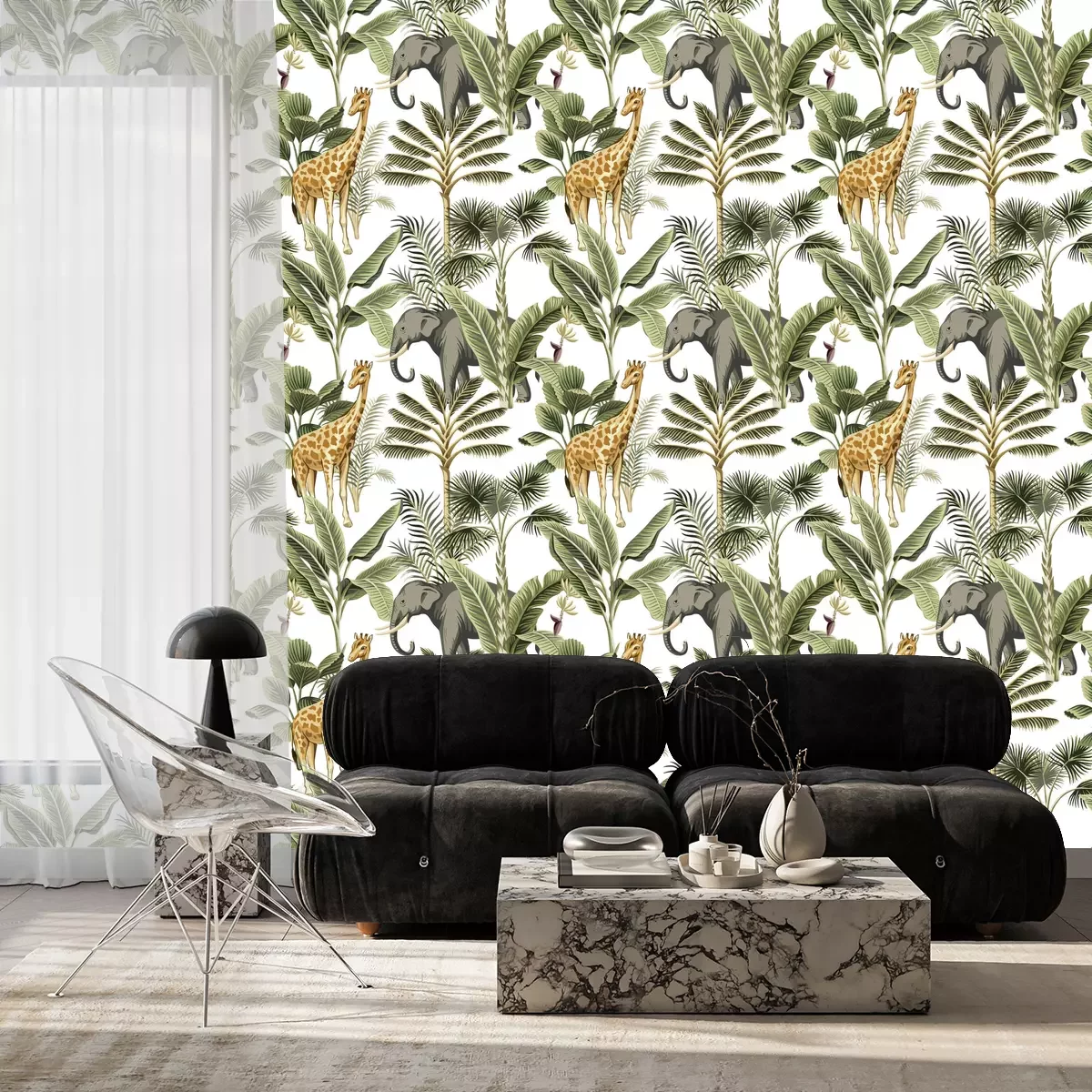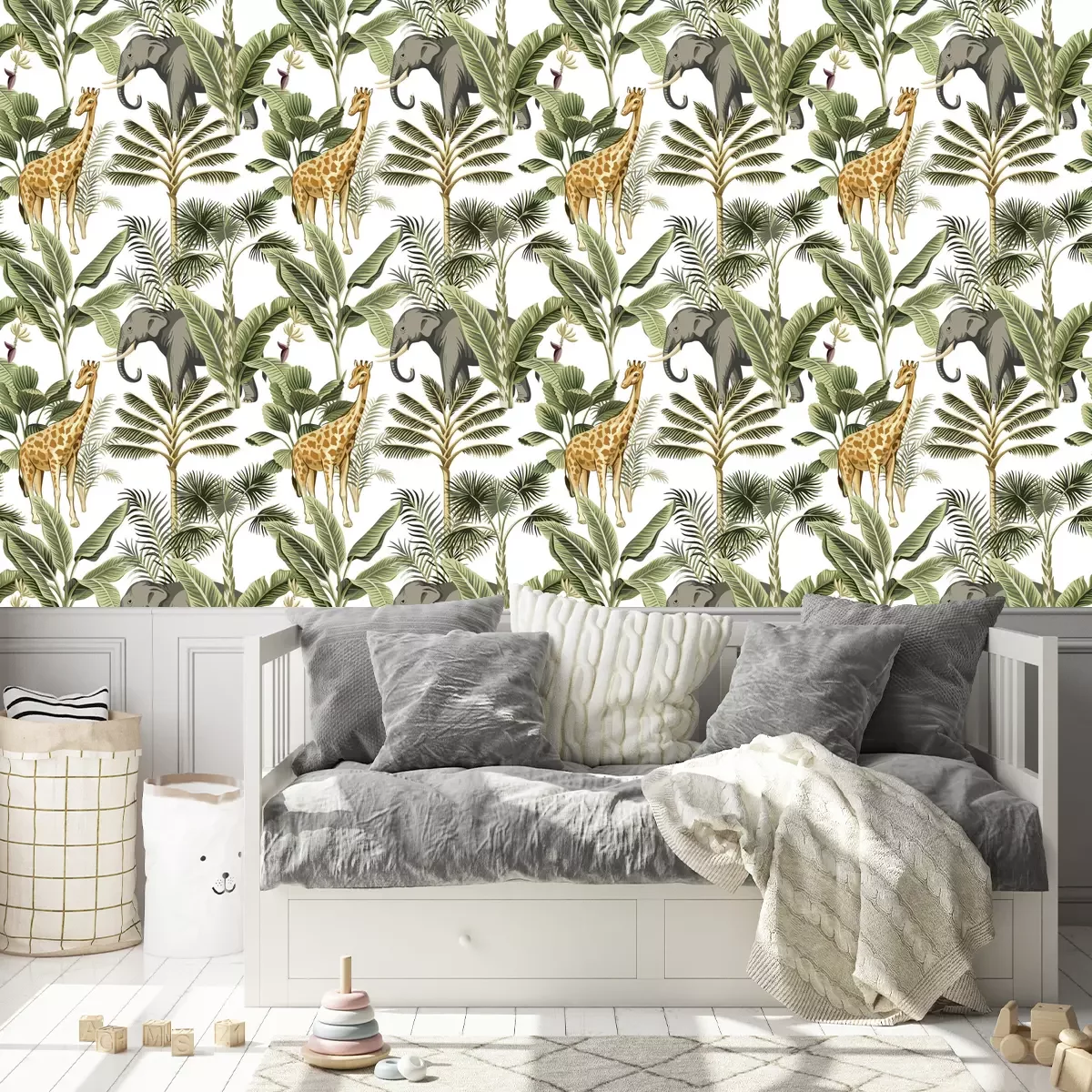 Tapete Tropical vintage elephant, giraffe wild animals, palm tree and plant floral seamless pattern white background. Exotic jungle safari wallpaper.