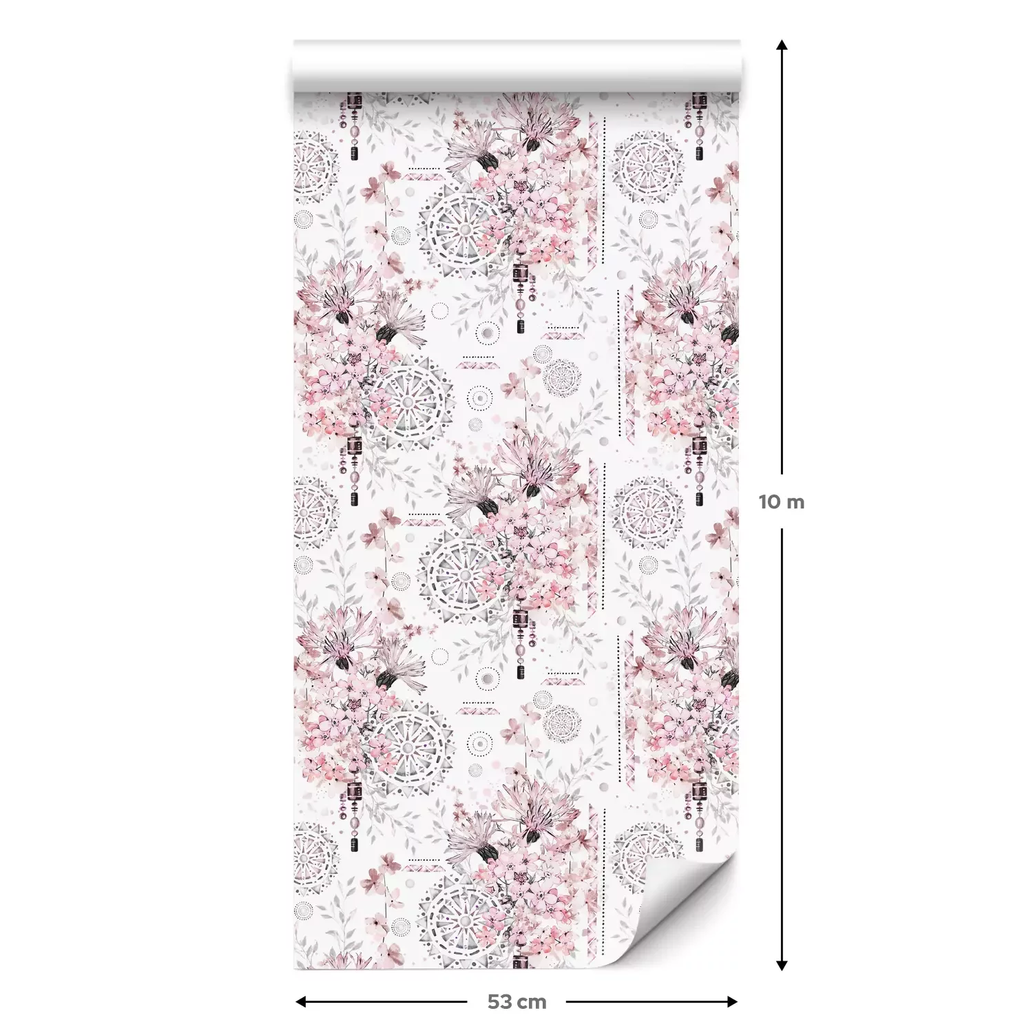 Eine Standard-Tapetenrolle hat die Maße 0,53 m x 10 m und deckt eine Wandfläche von etwa 5 m² ab.