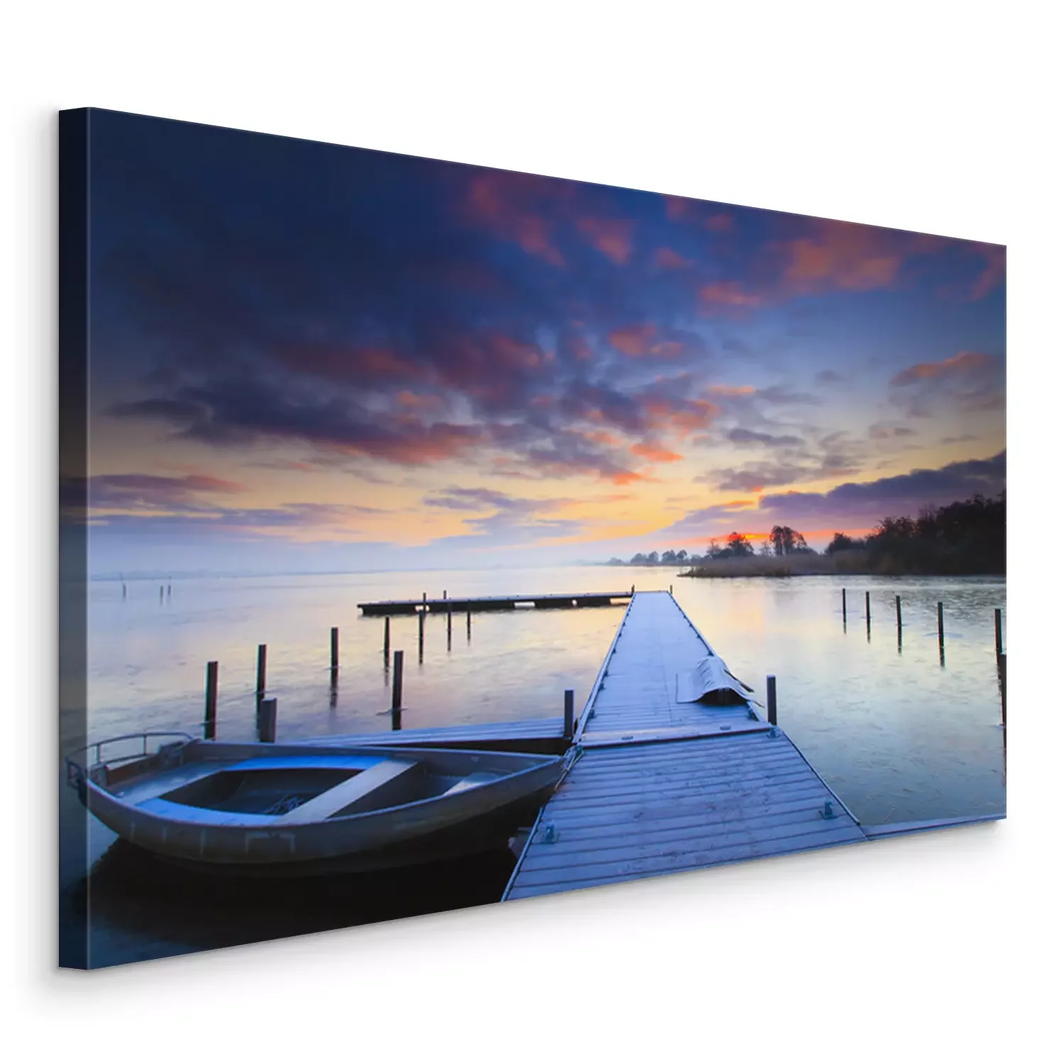 Peaceful Sonnenaufgang mit dramatischen Himmel und Boote und eine Anlegestelle
