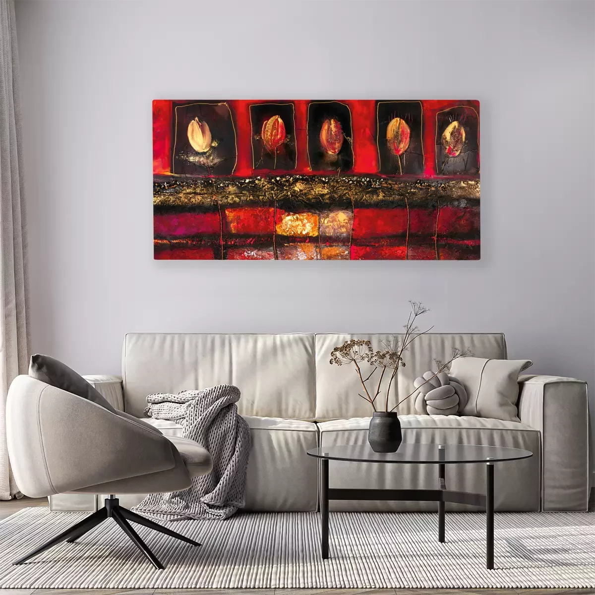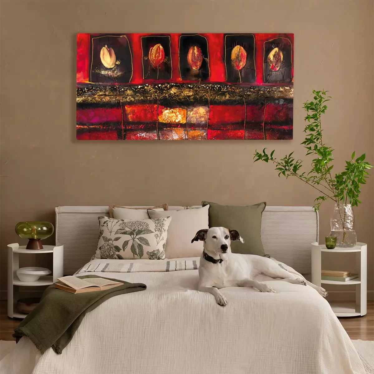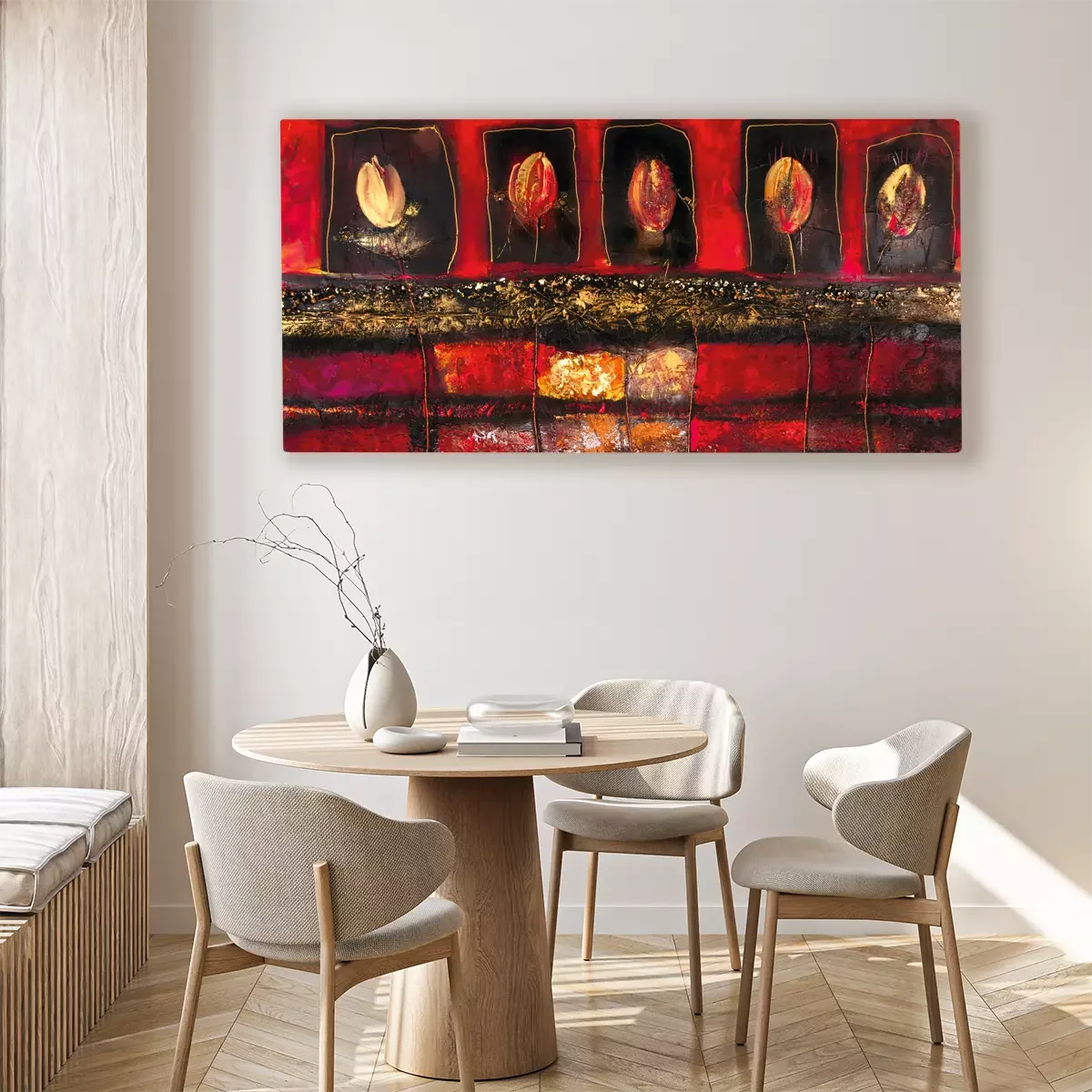 Abstrakte komposition von tulpen auf rotem hintergrund