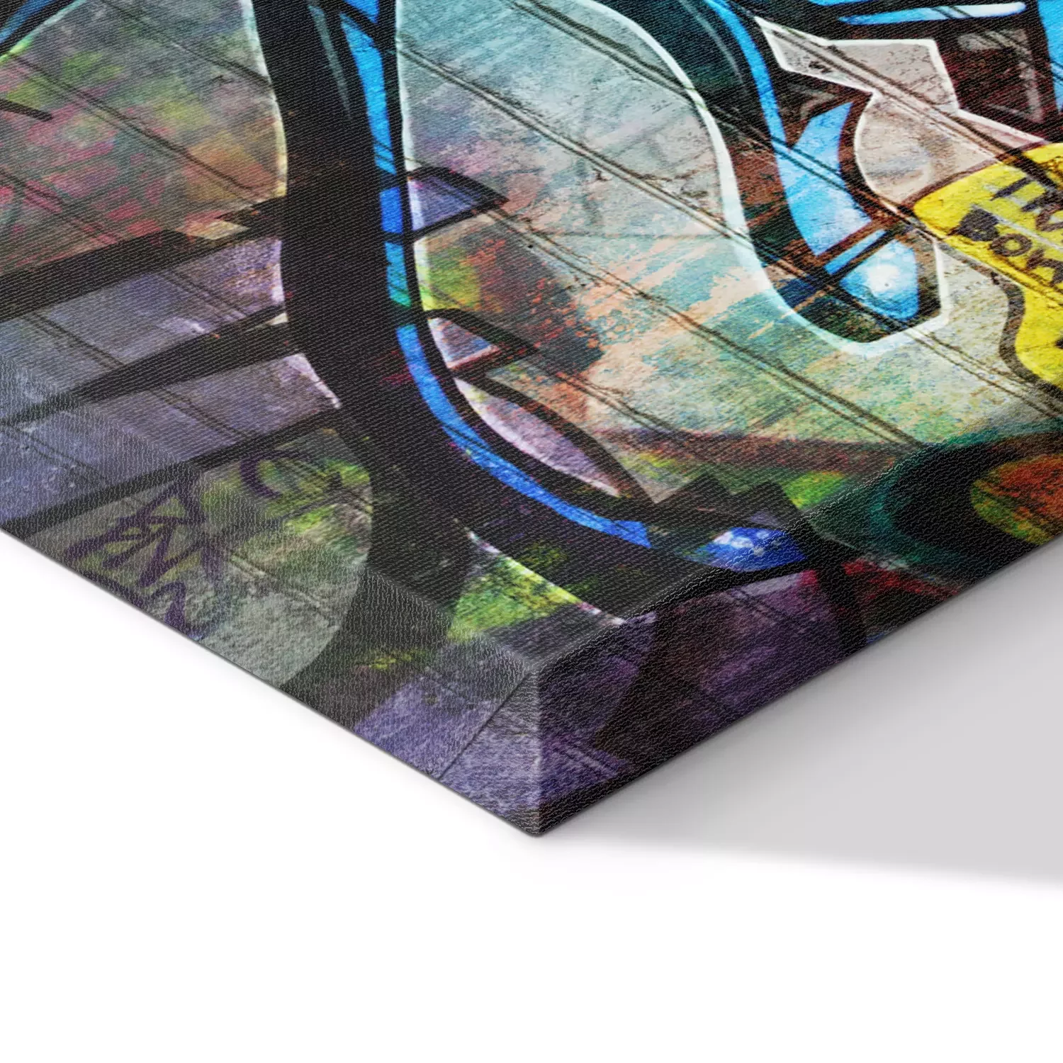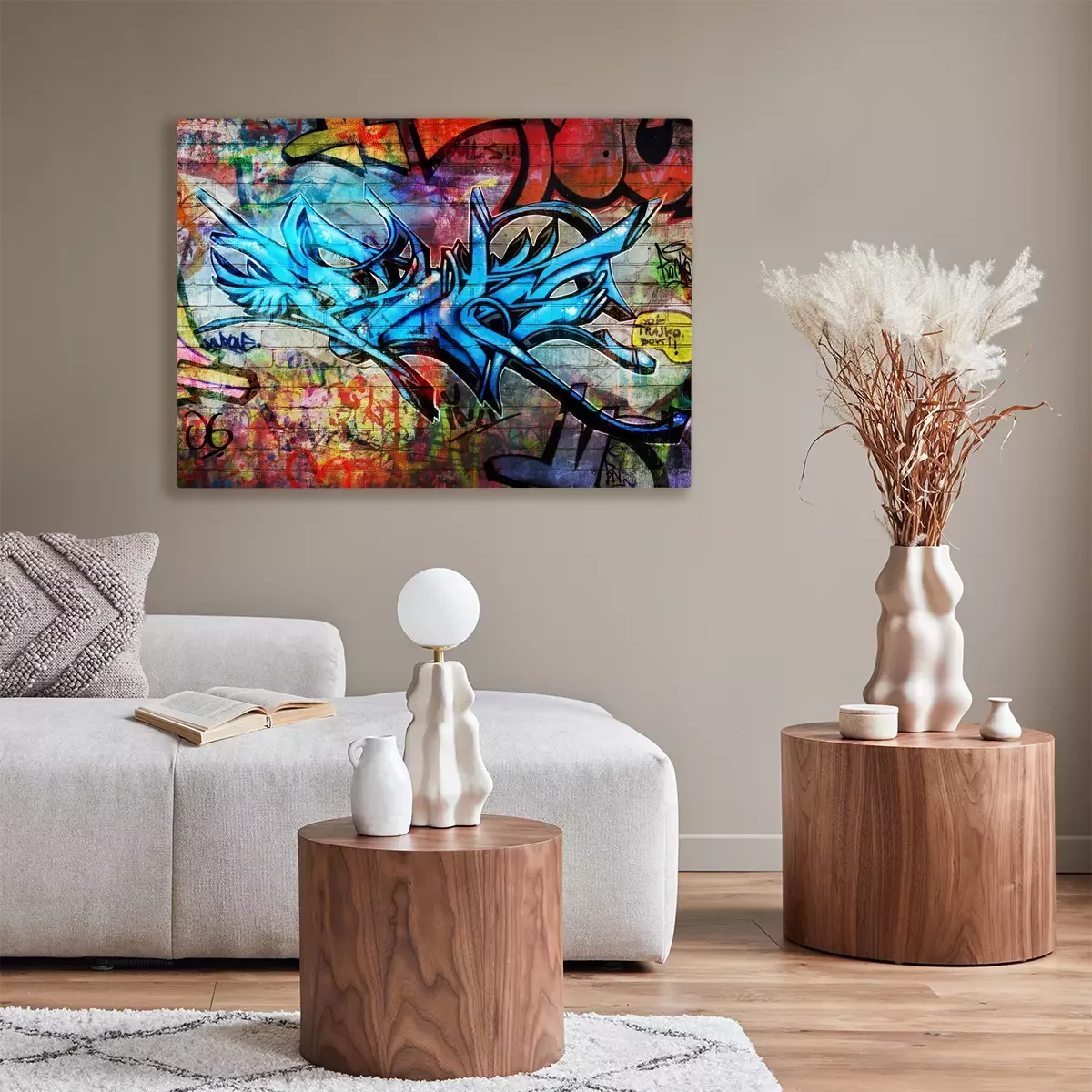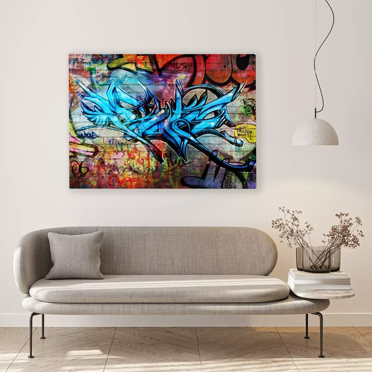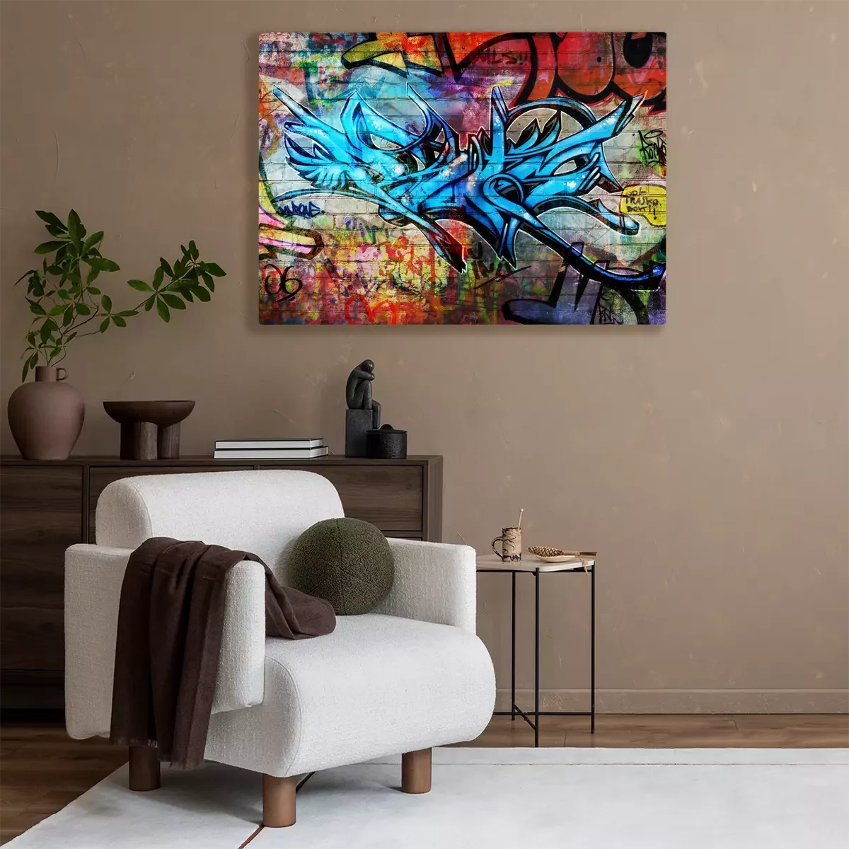 Abstraktes blaues graffiti-tag auf einer farbenfrohen wand