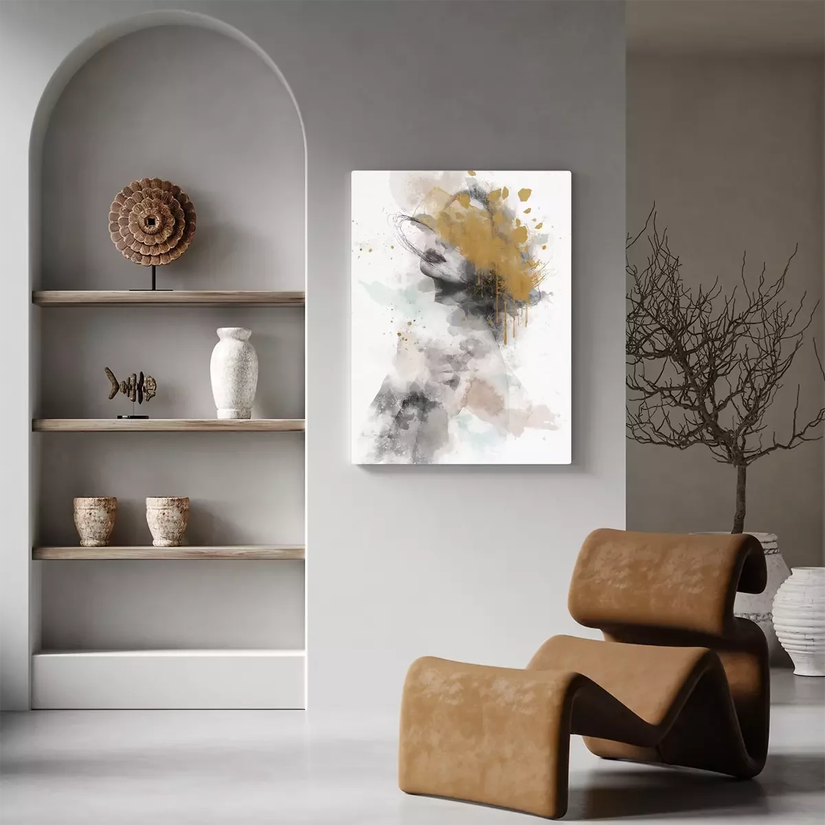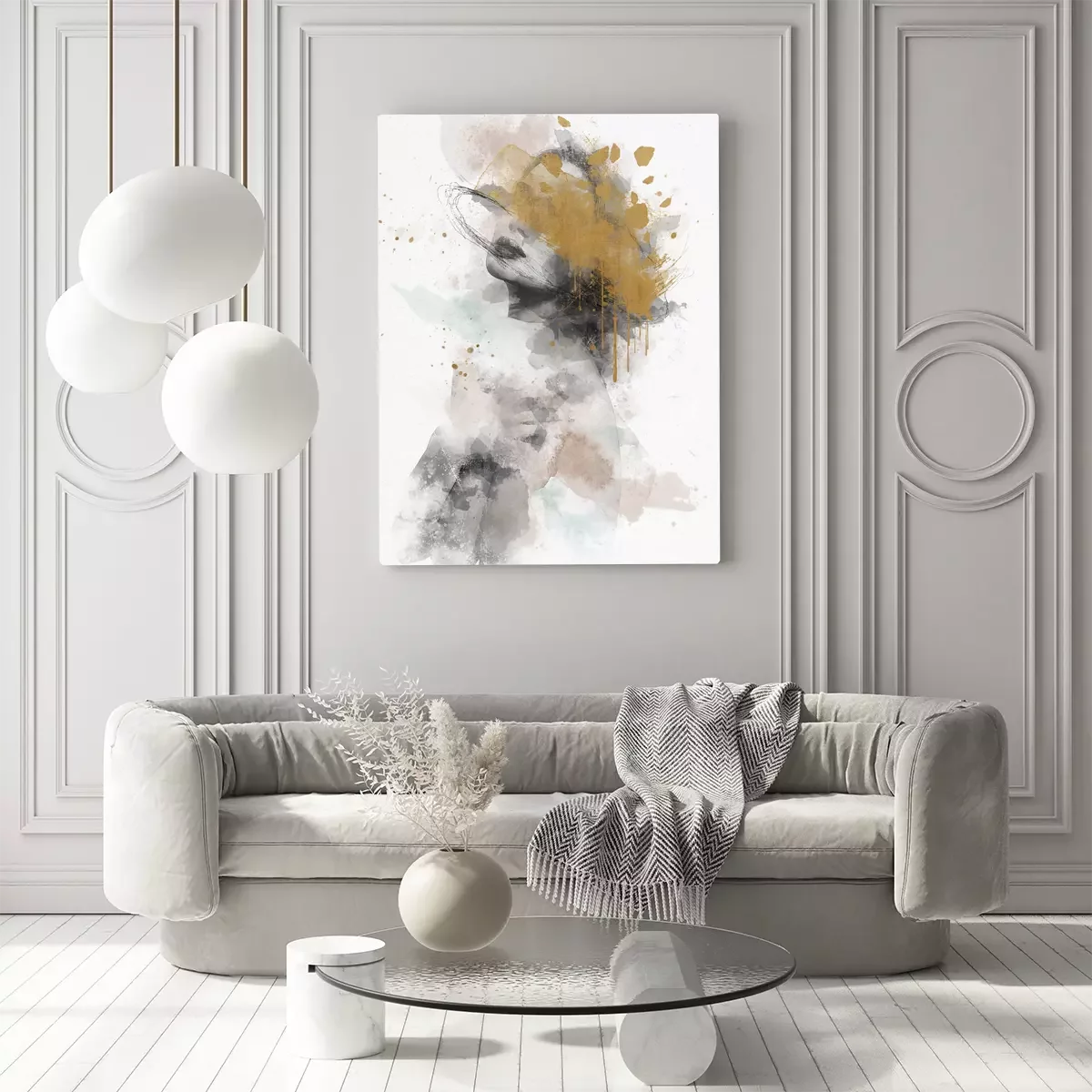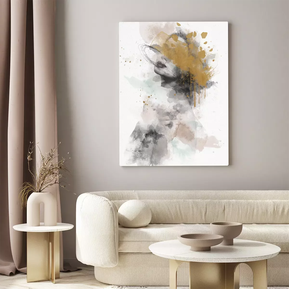 Abstraktion mit einem frauengesicht in leuchtenden farben mit goldenem schimmer