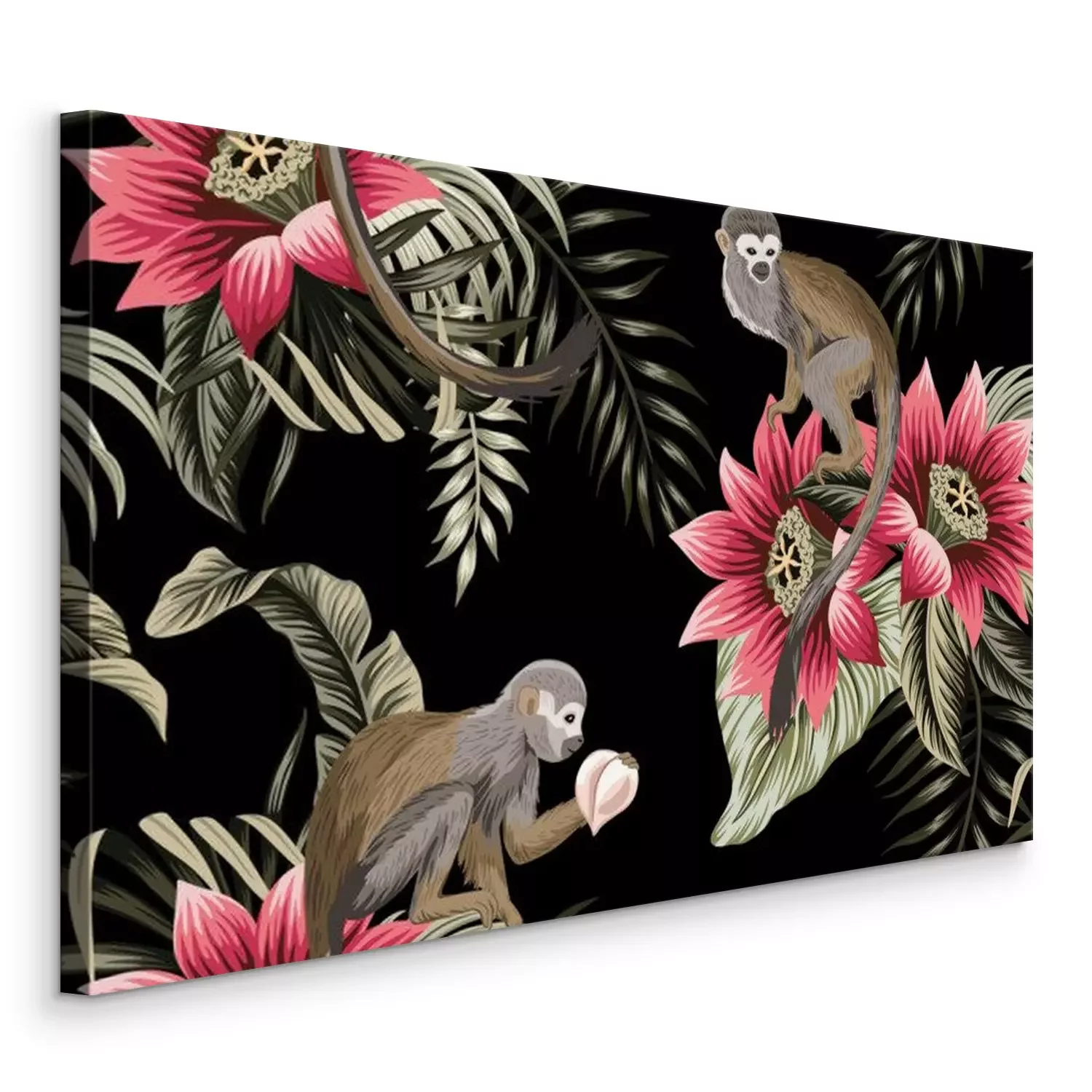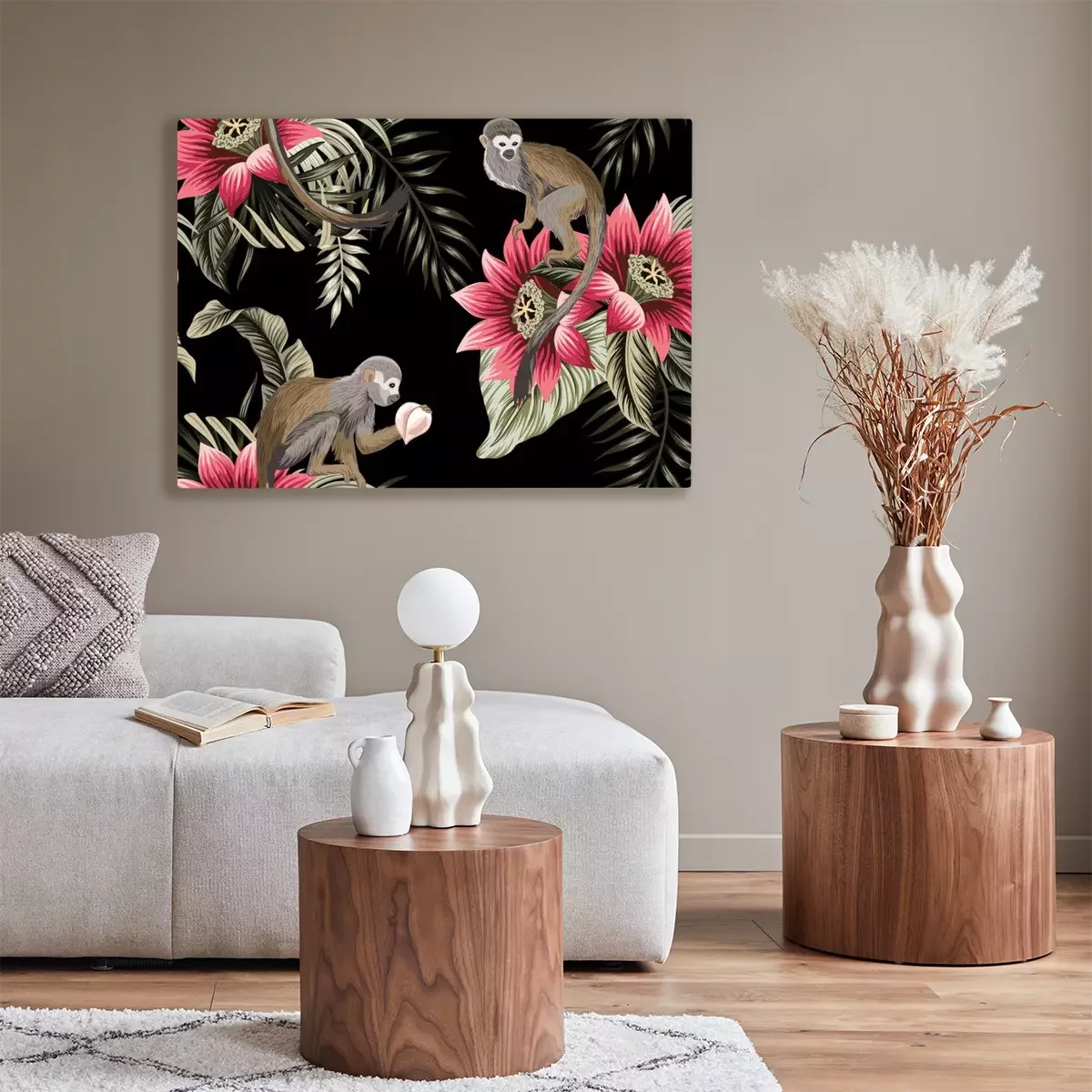 Tropical vintage monkey animal, hibiscus flower, peach fruit, palm leaves floral seamless pattern black background. Exotic jungle wallpaper.
