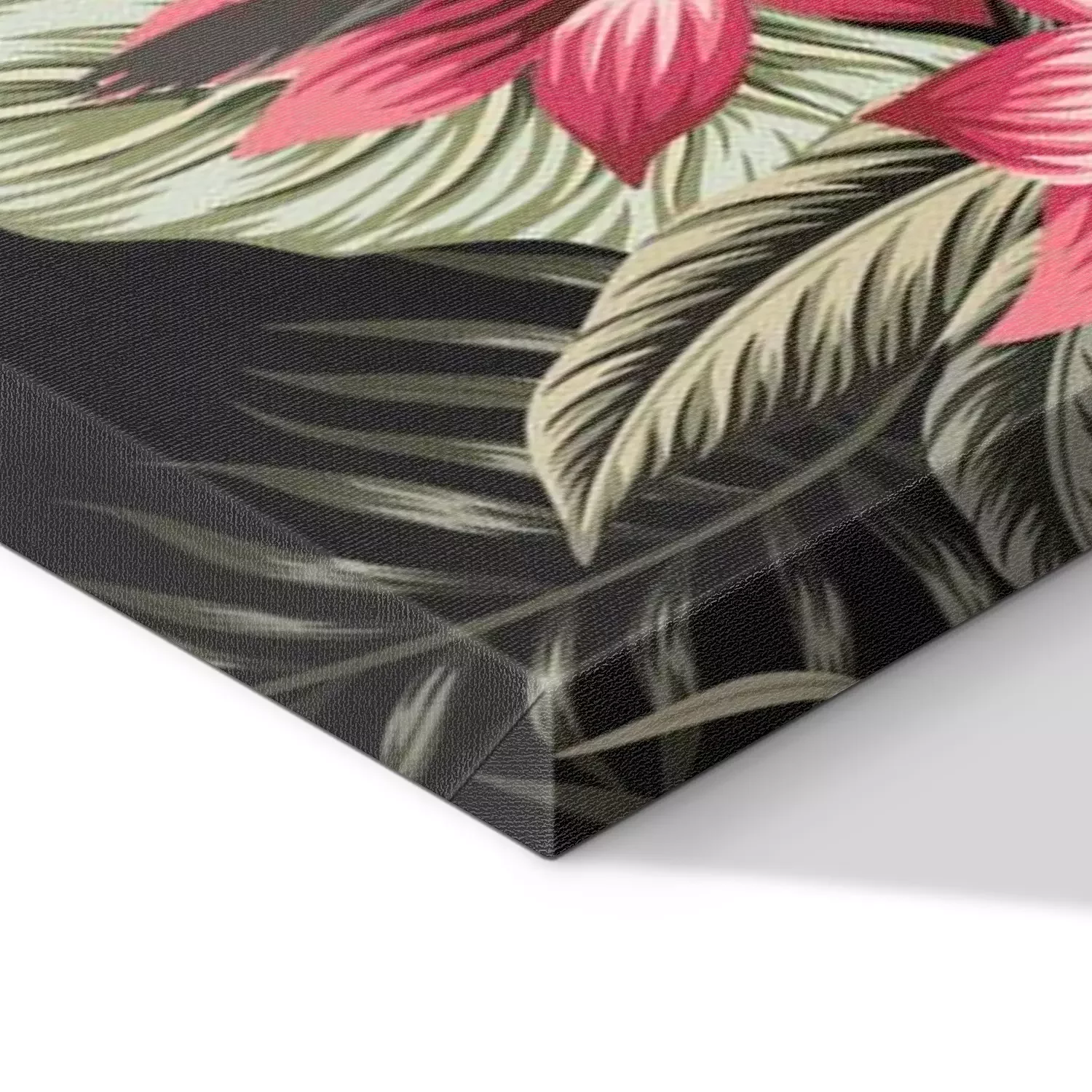 Tropical vintage botanical banana tree, palm tree, red hibiscus flower and leopard floral green palm leaves seamless pattern black background. Exotic jungle wallpaper.