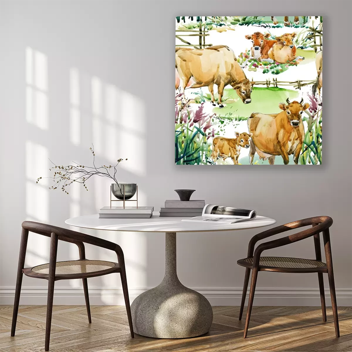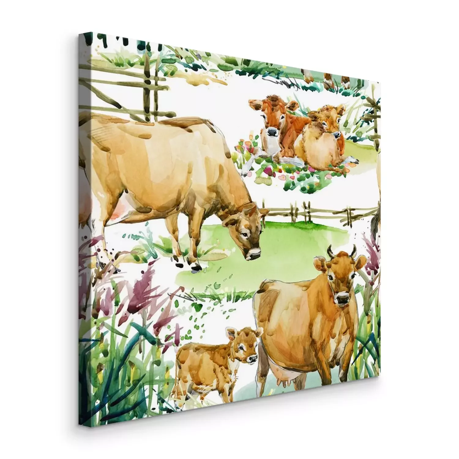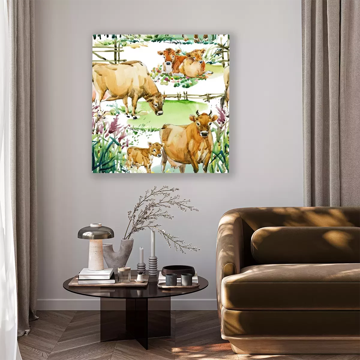 Bild: Aquarell-Muster mit Milchkühen auf der Lichtung