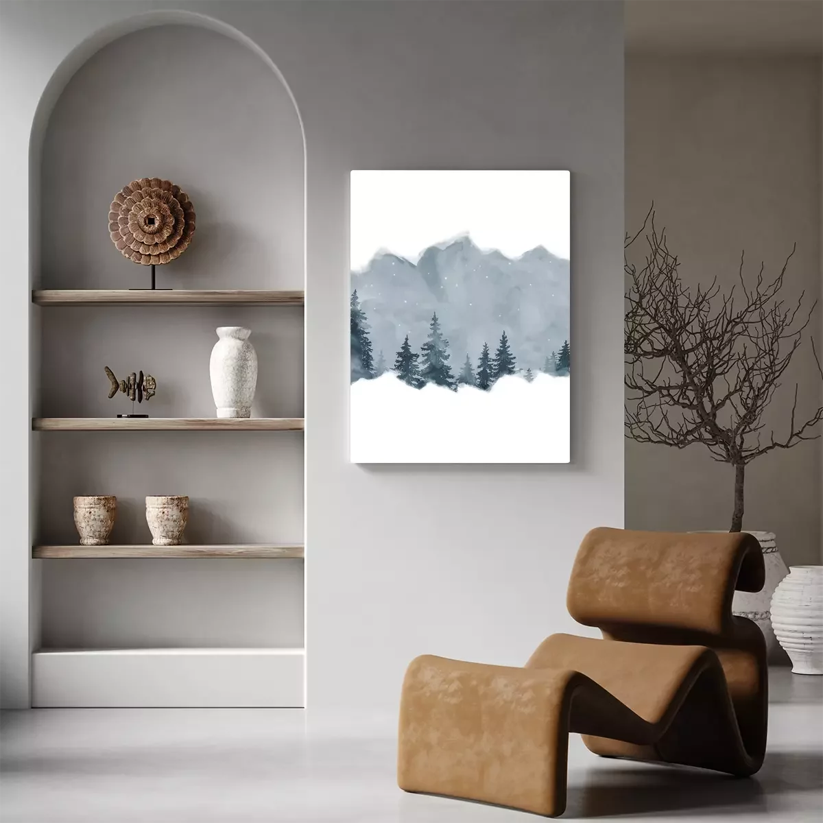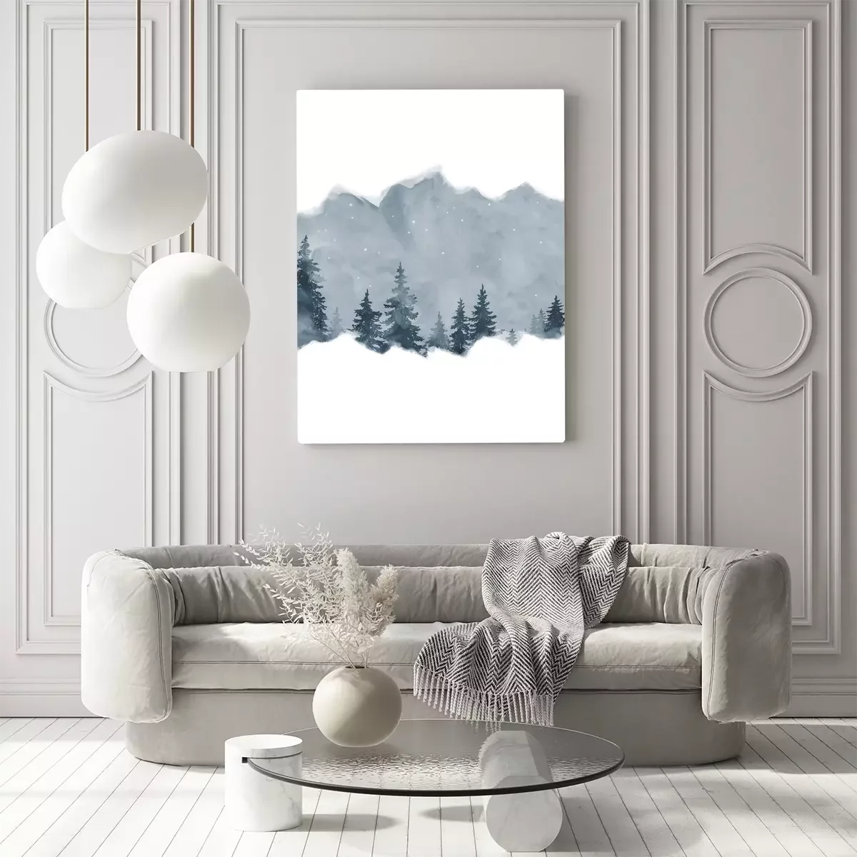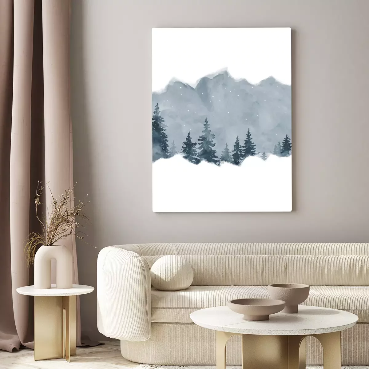 Aquarelllandschaft mit weihnachtsbäumen vor einer bergkulisse
