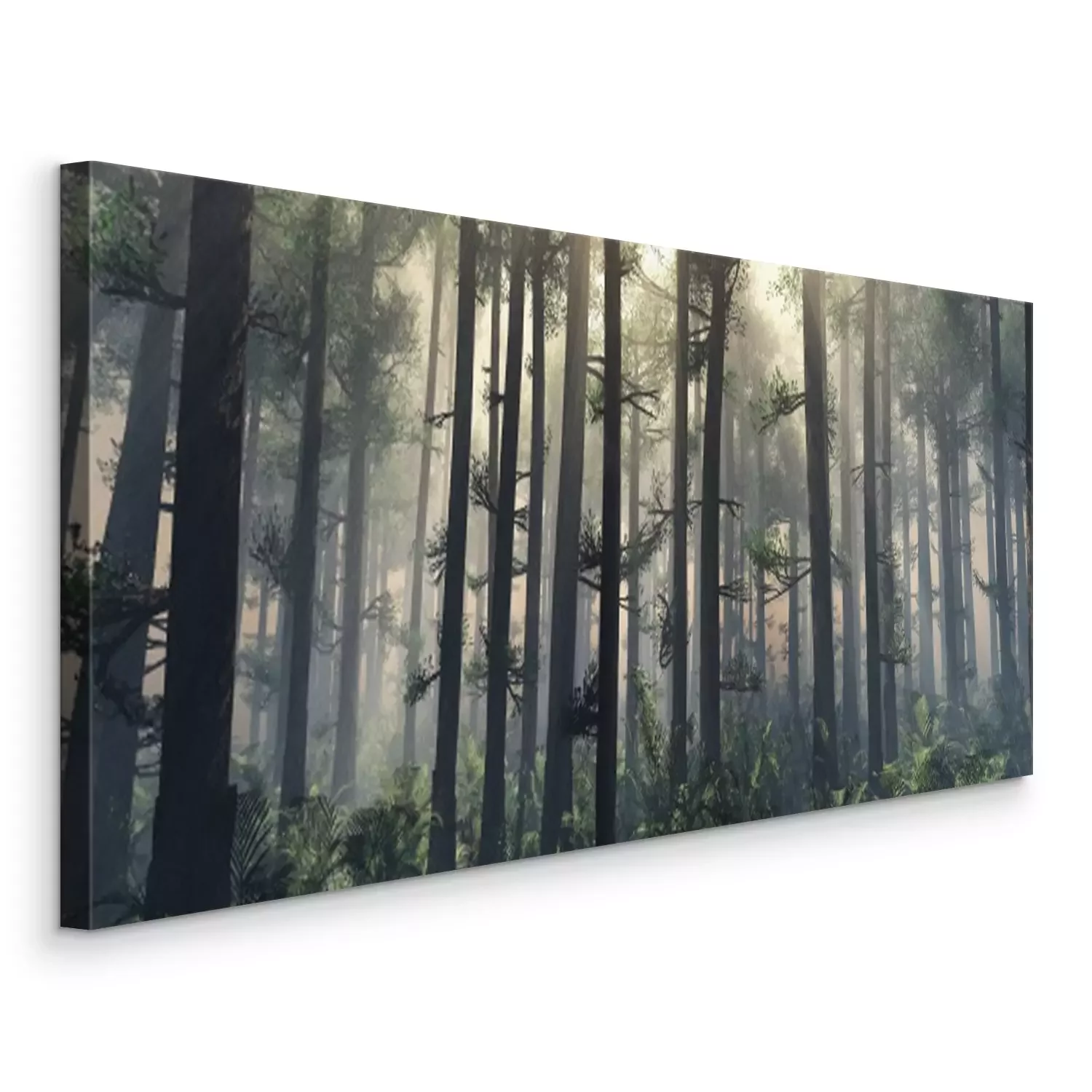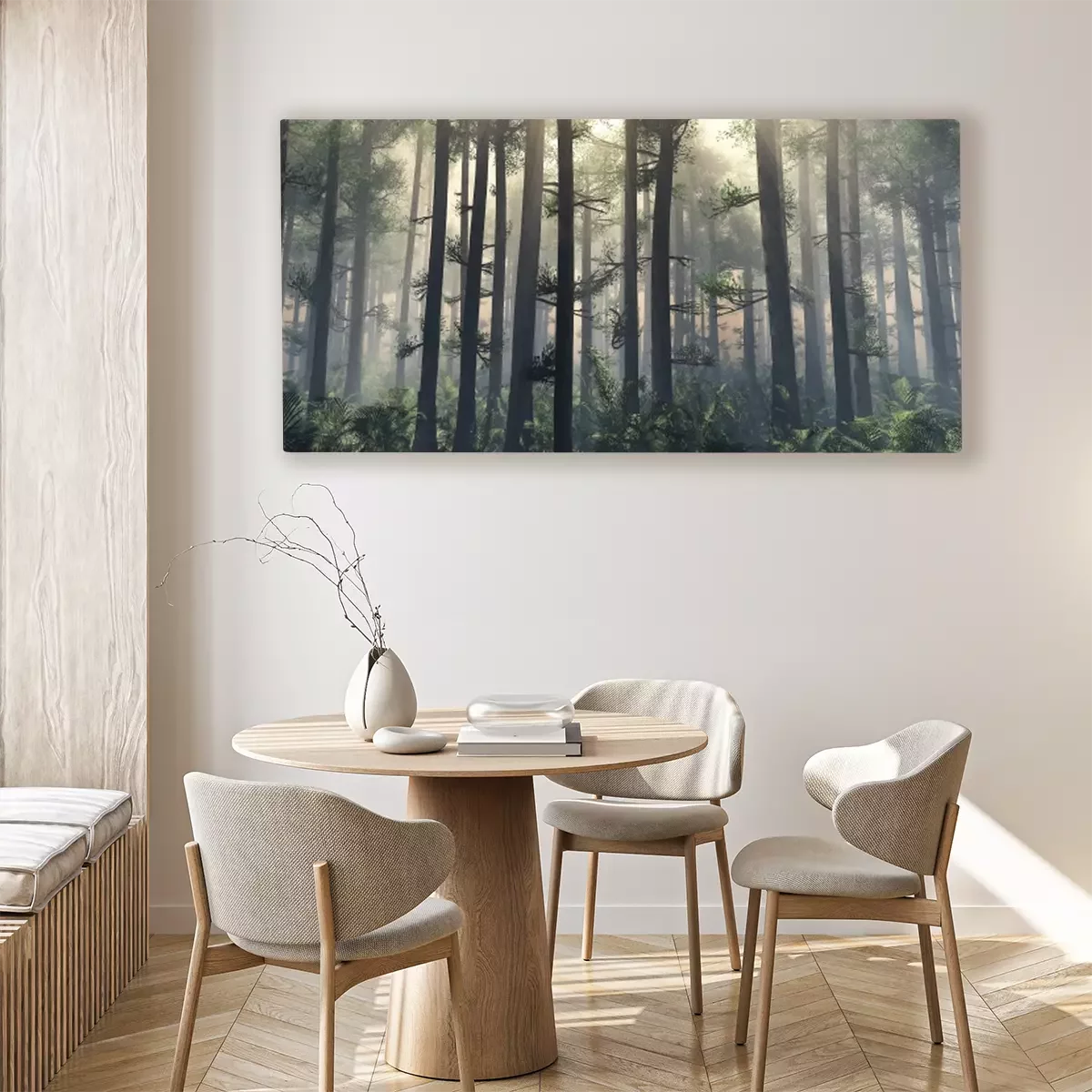 Bild: Bäume im Nebel. Der Rauch im Wald am Morgen. Ein nebliger Morgen zwischen den Bäumen. 3D-Rendering