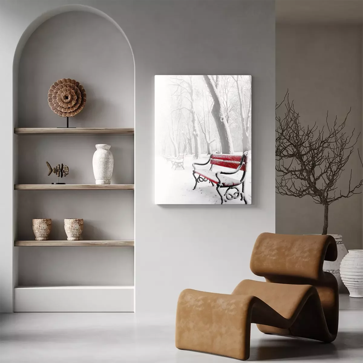 Rote Bank im Hintergrund der Bäume
