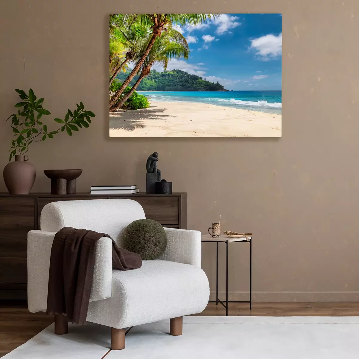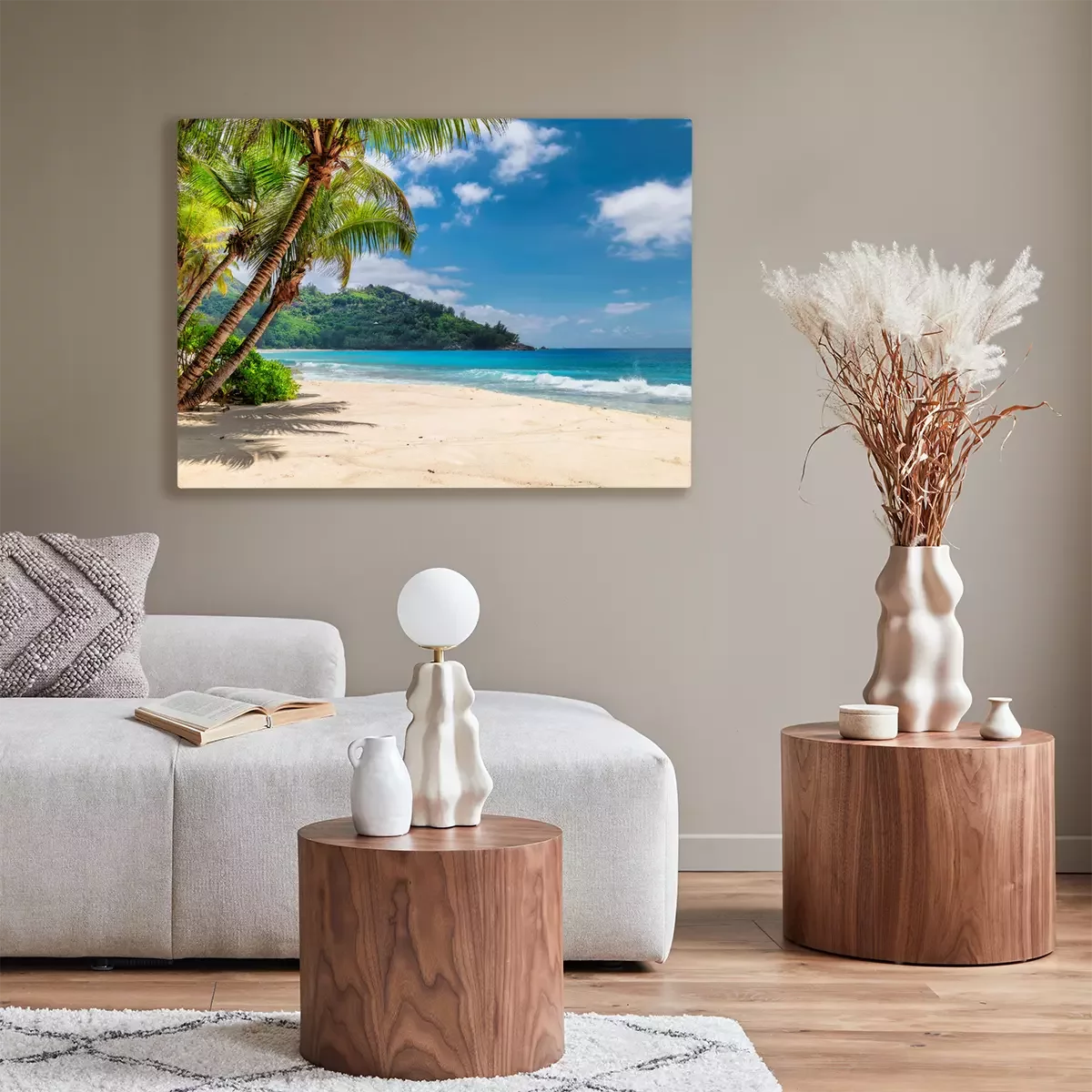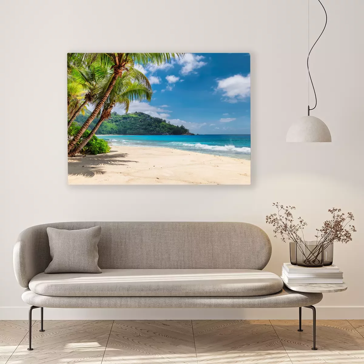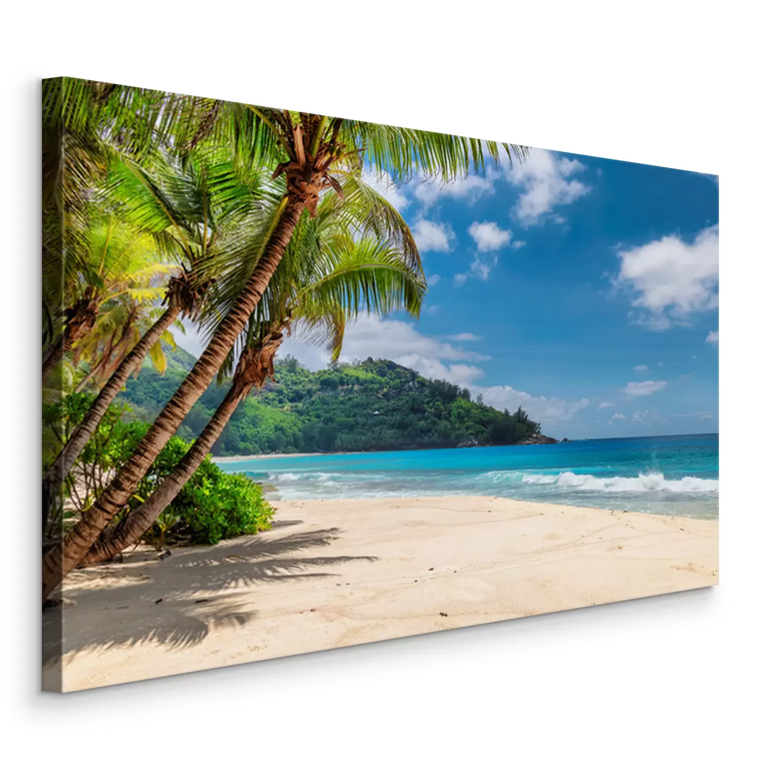 Sandstrand mit Palmen und ein Segelboot im türkisblauen Meer auf der Insel Paradise.