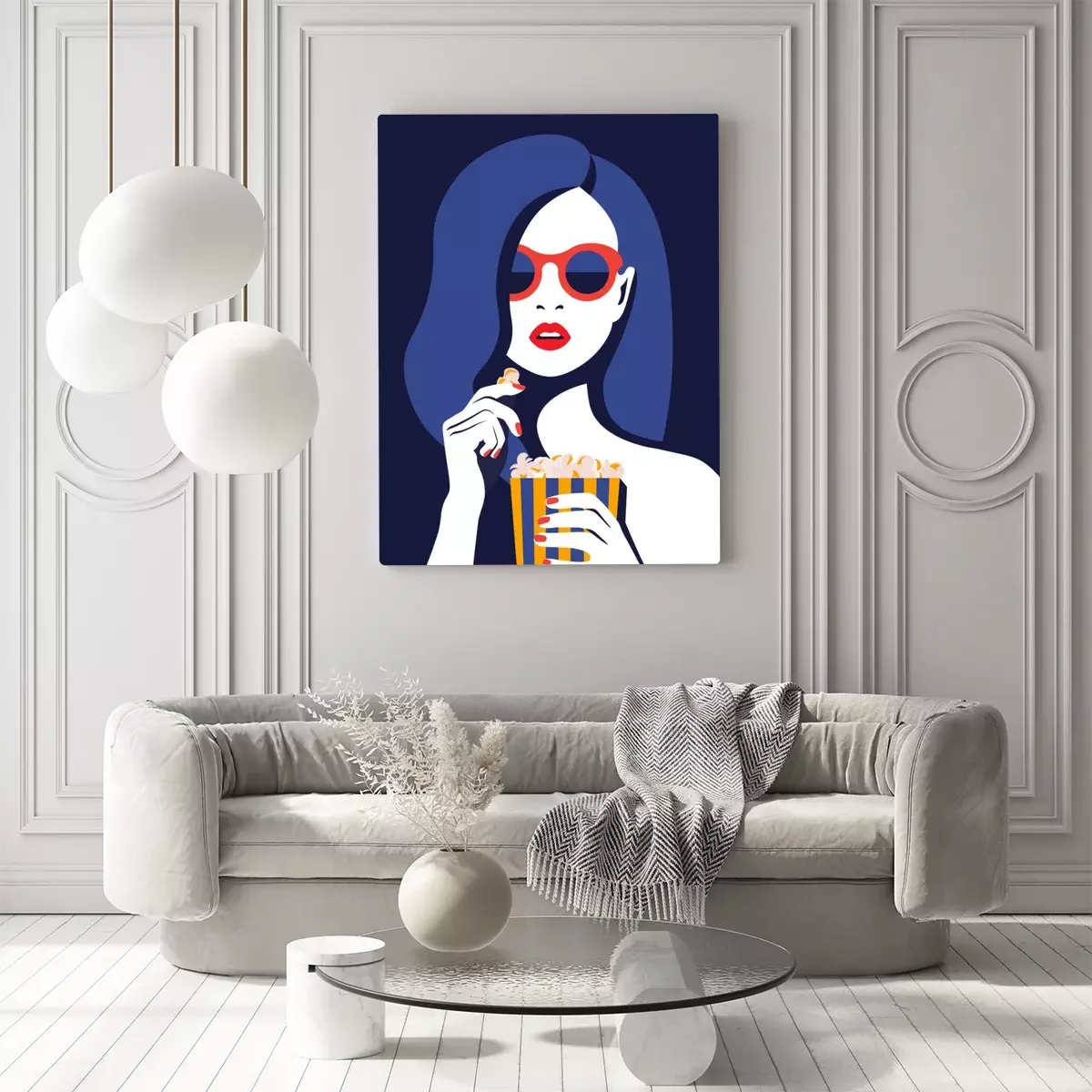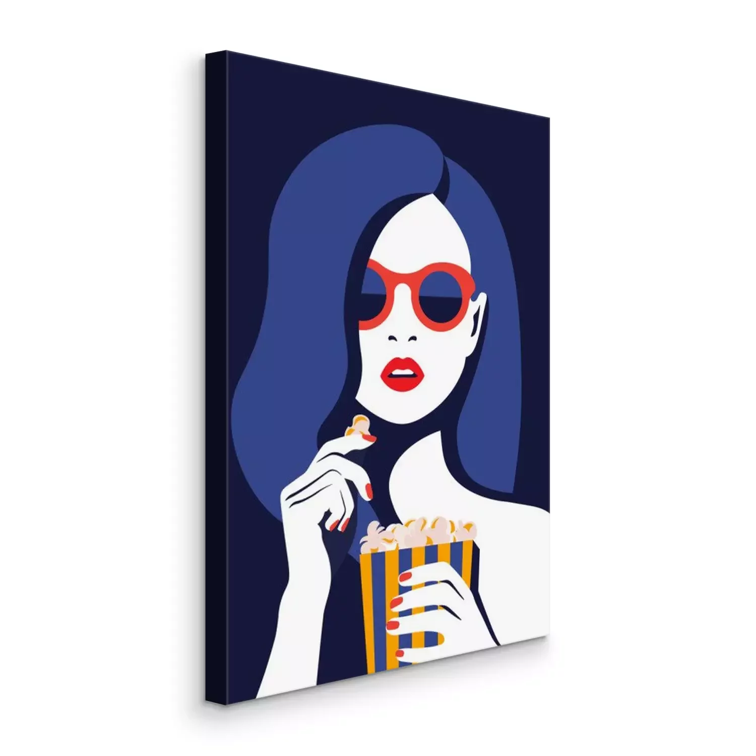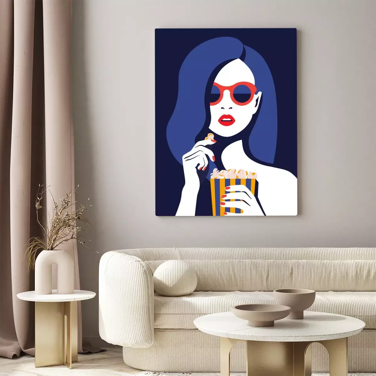 Bild Beautiful girl in glasses eats popcorn and watches a movie. Portrait of a young woman with open mouth. Vector illustration in flat style