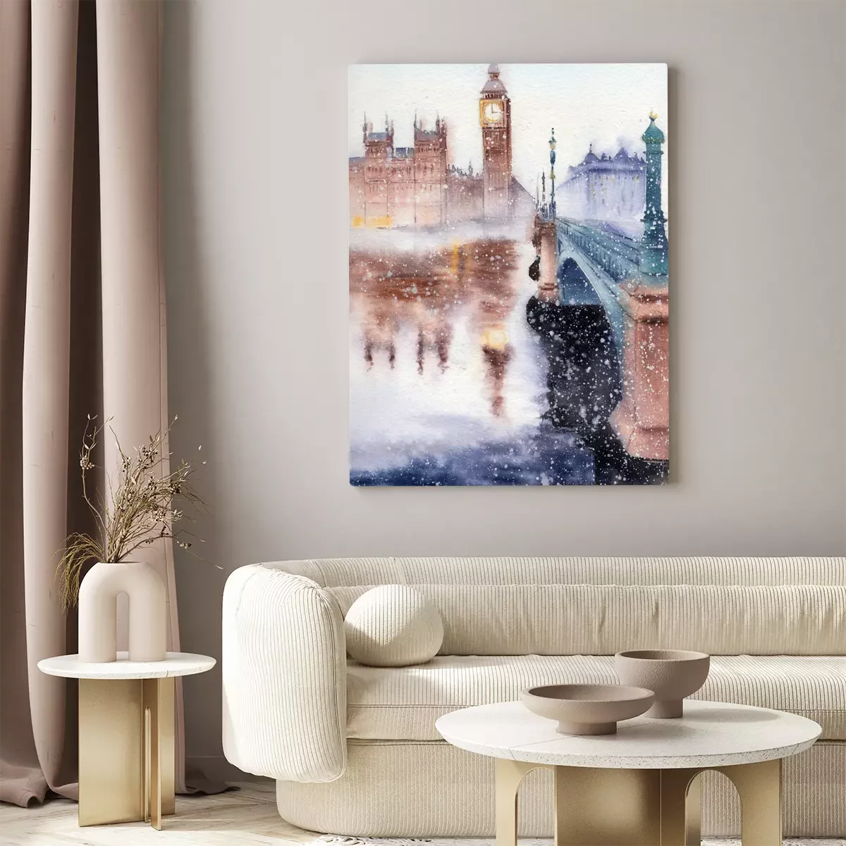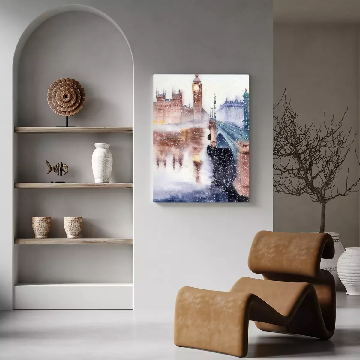 Big ben und die brücke im verschneiten dunst