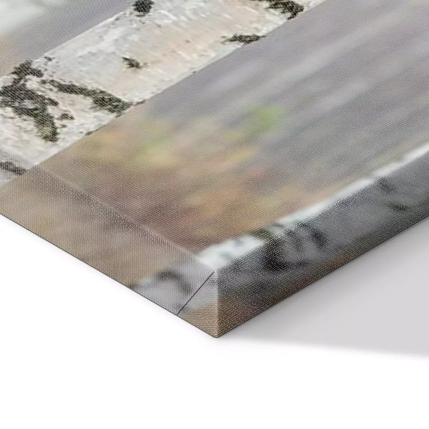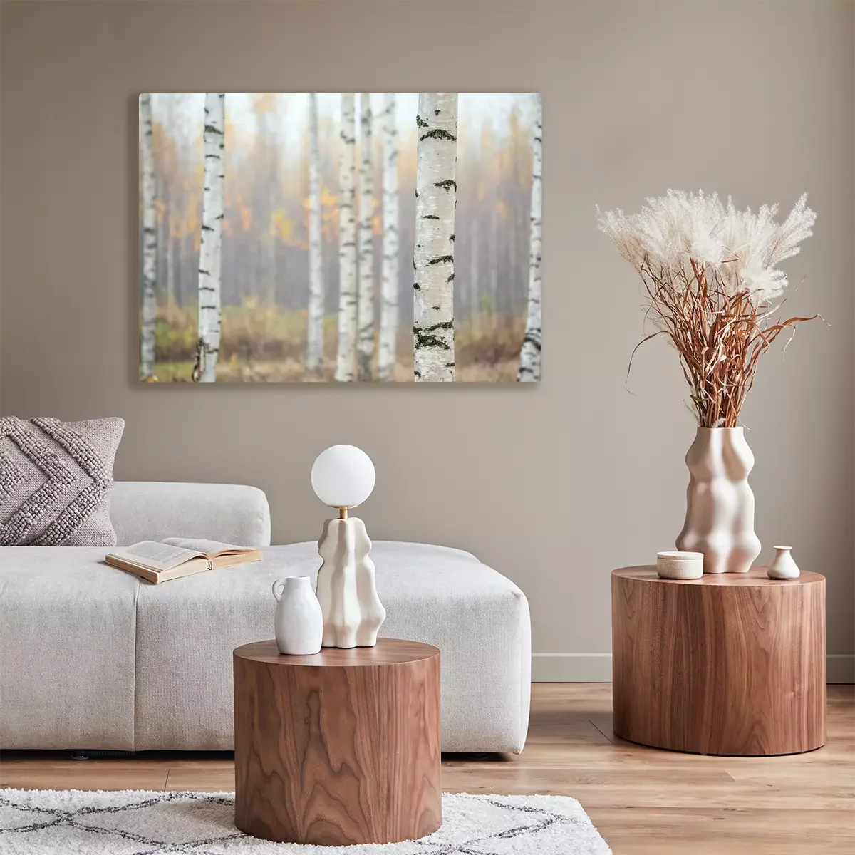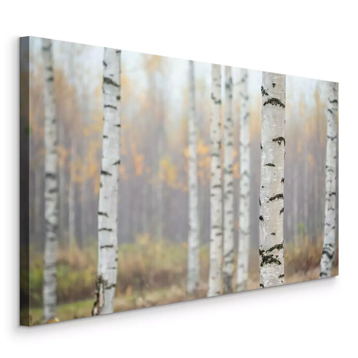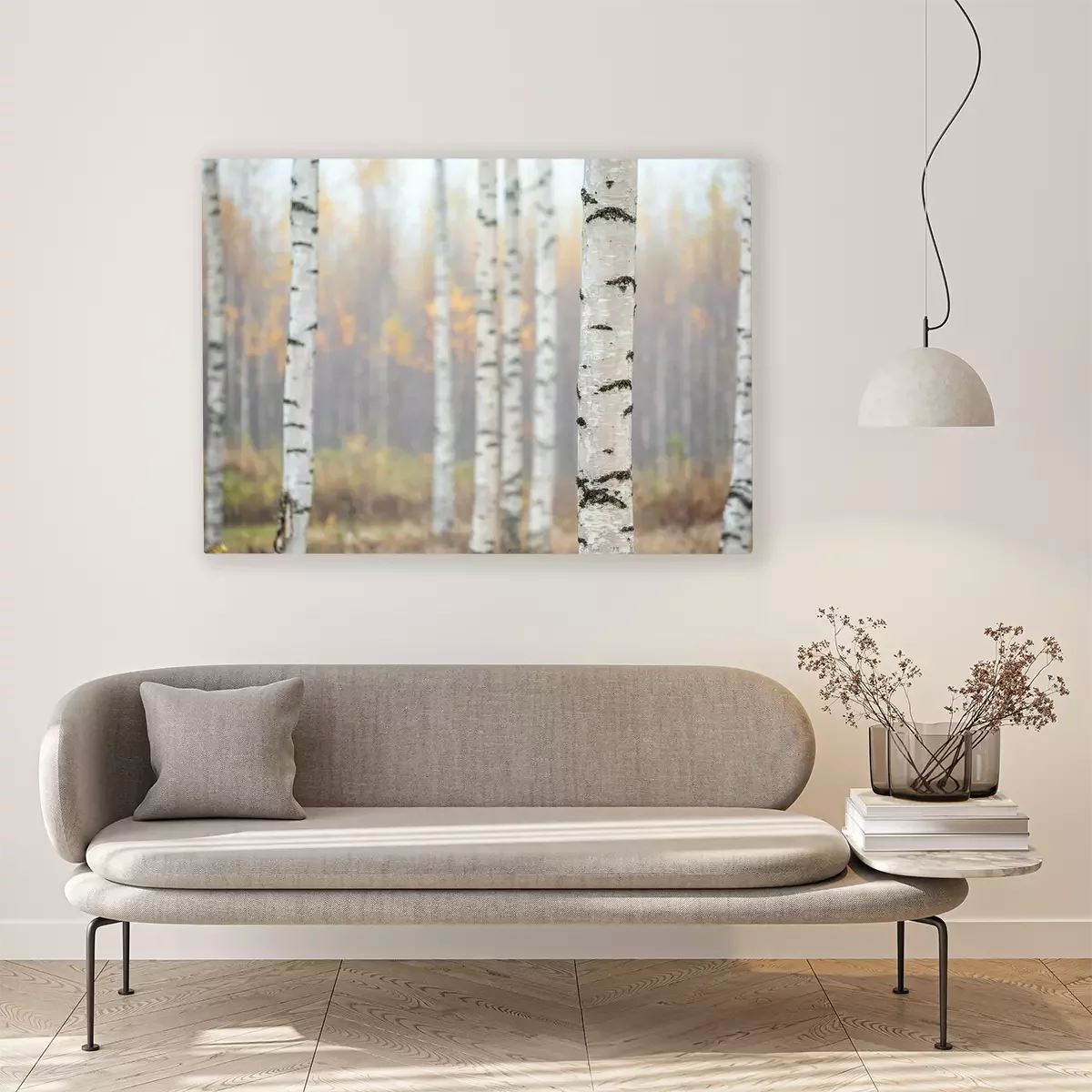 Bild Birch forest in fog. Autumn view. Focus in foreground tree trunk.