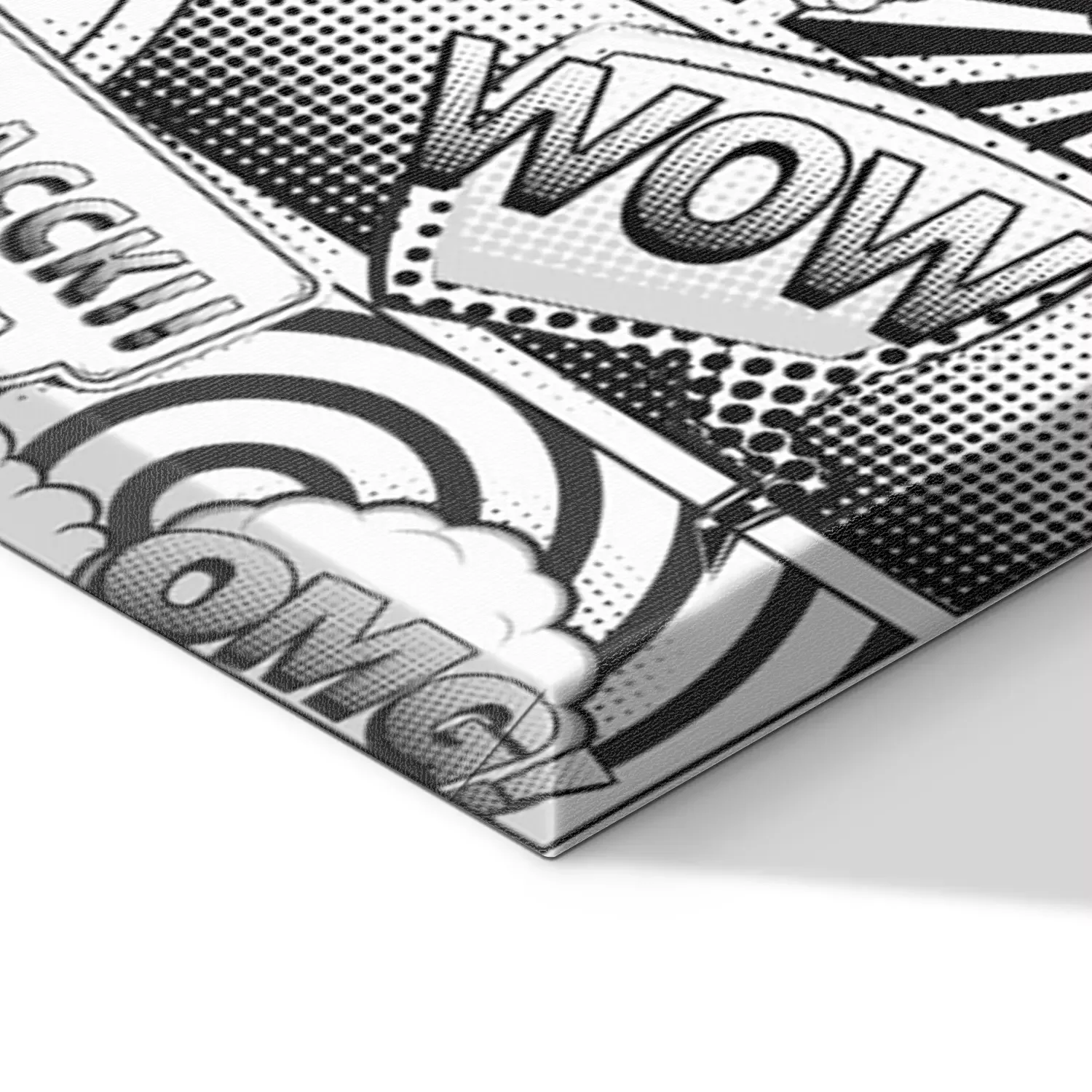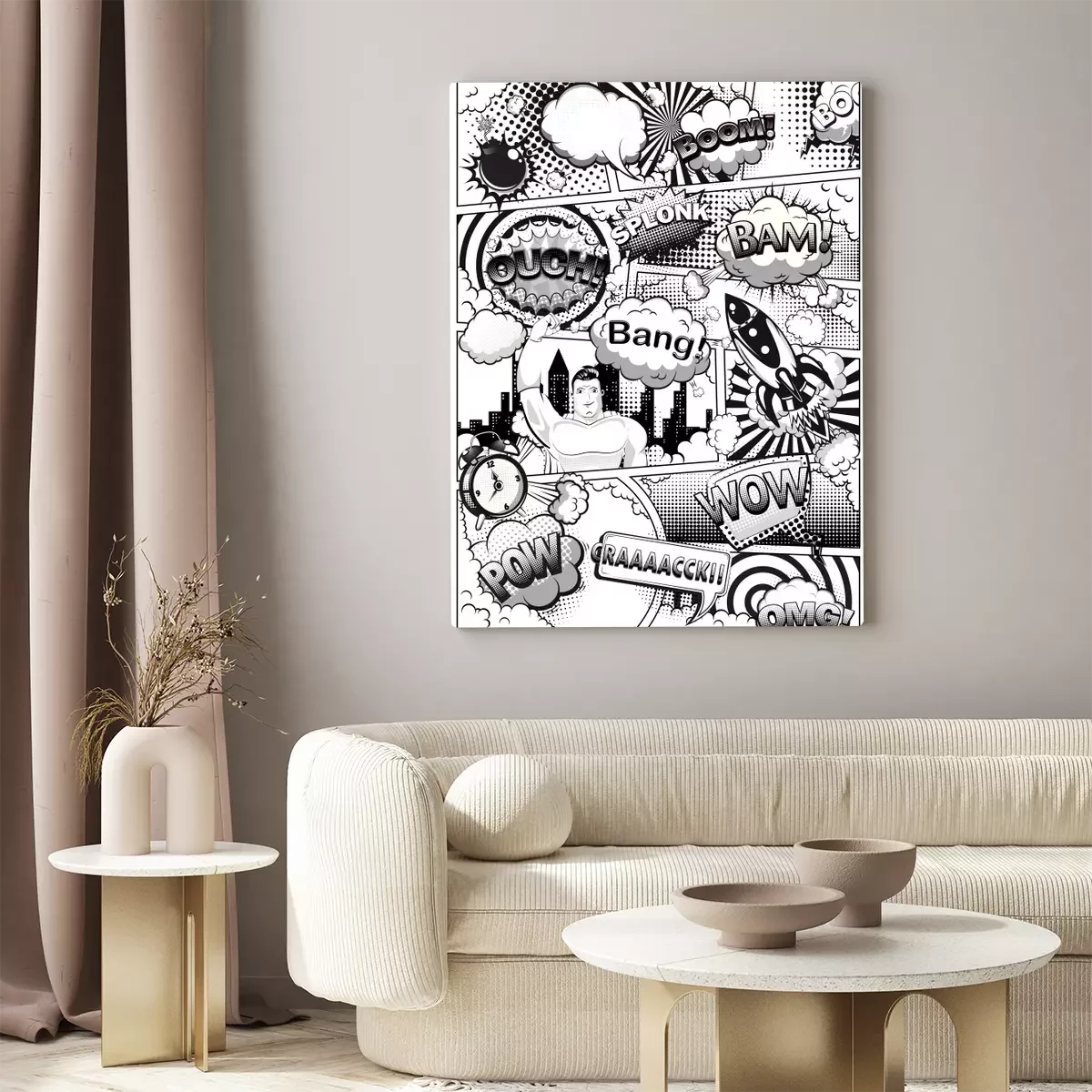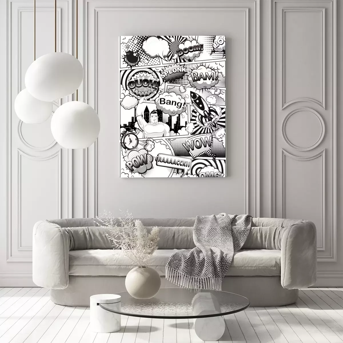 Black and white comic book page divided by lines with speech bubbles, rocket, superhero hand and sounds effect. Illustration
