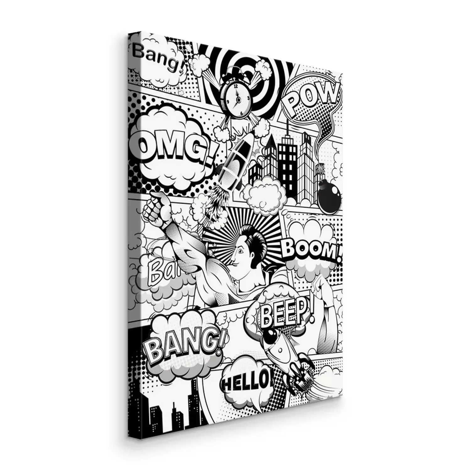 Bild: Black and white comic book page divided by lines with speech bubbles, rocket, superhero and sounds effect. Illustration