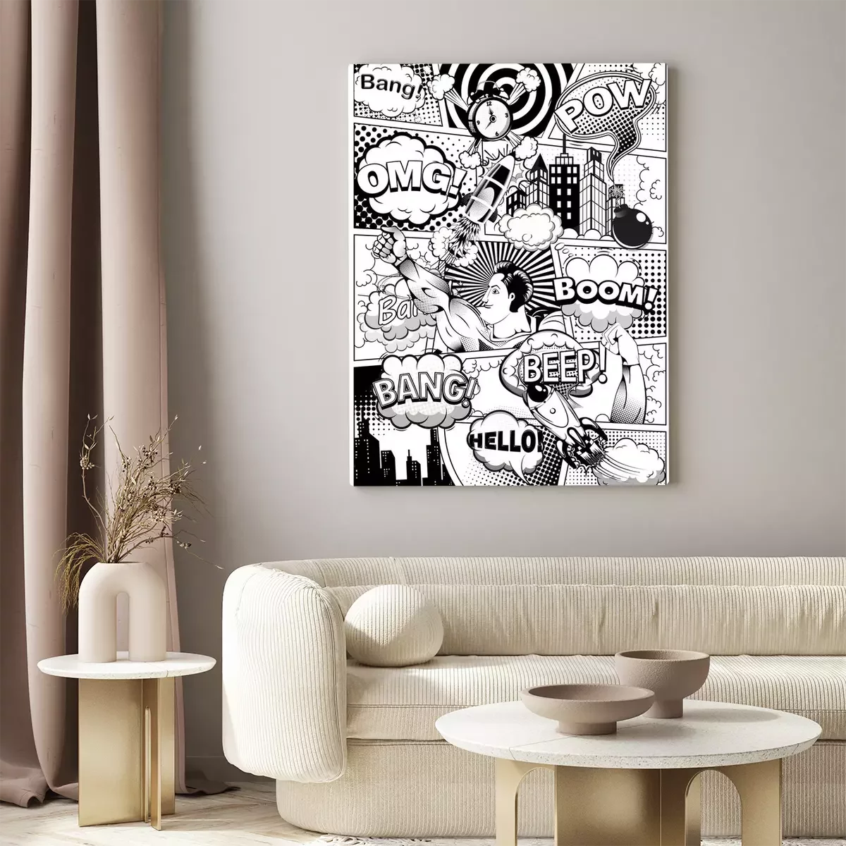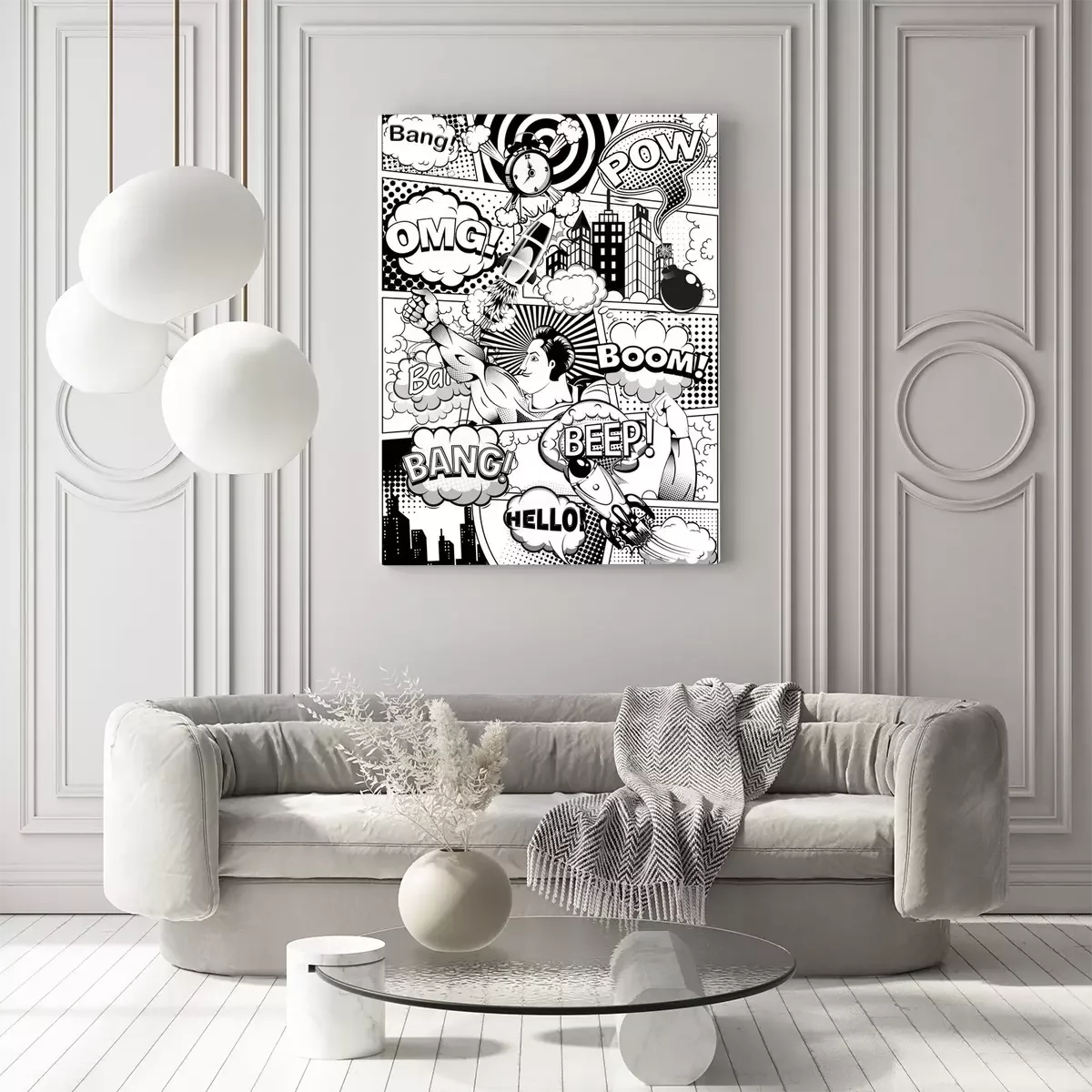 Black and white comic book page divided by lines with speech bubbles, rocket, superhero and sounds effect. Illustration