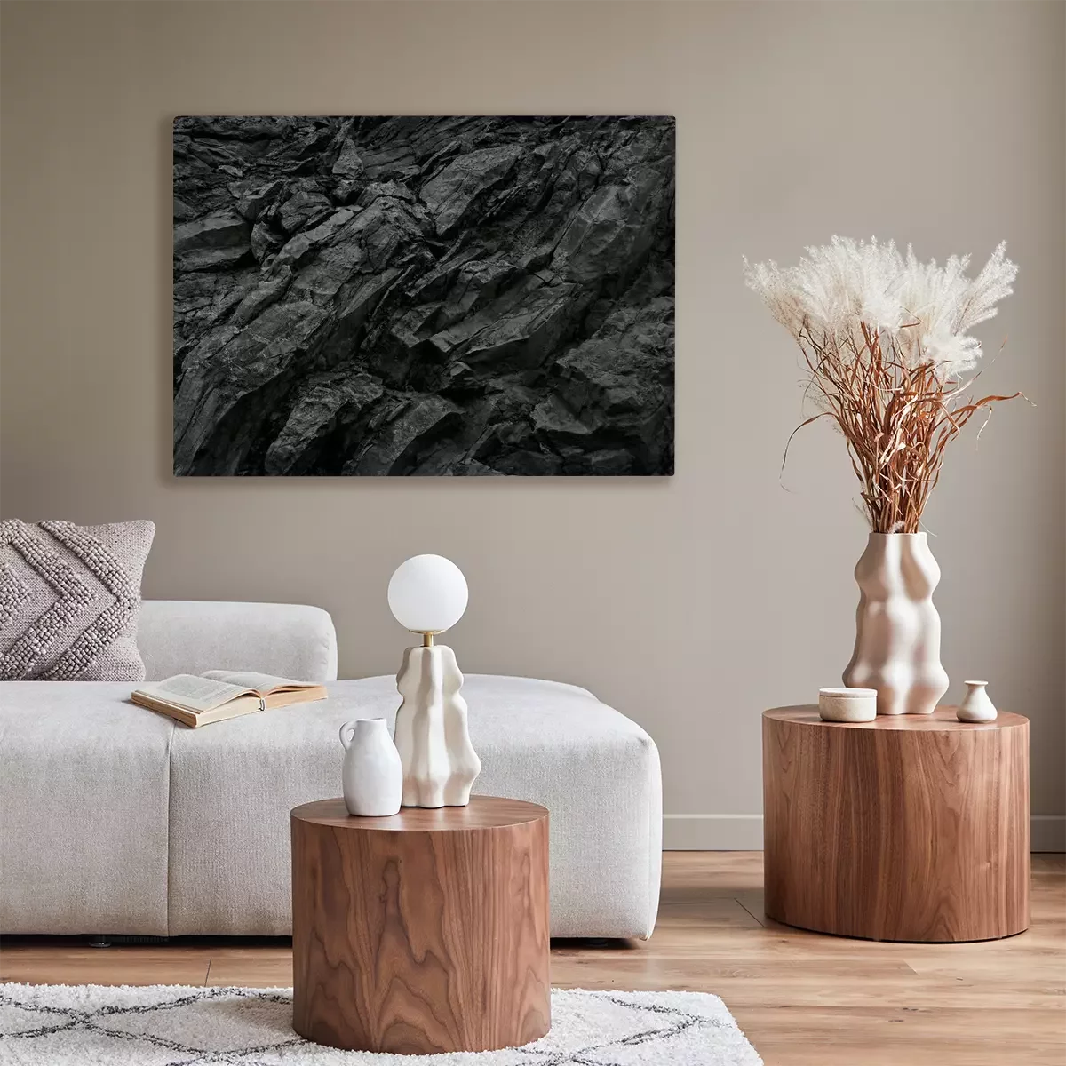 Bild: Black rock background. Dark gray stone texture. Black grunge background. Mountain close-up. Distressed backdrop.