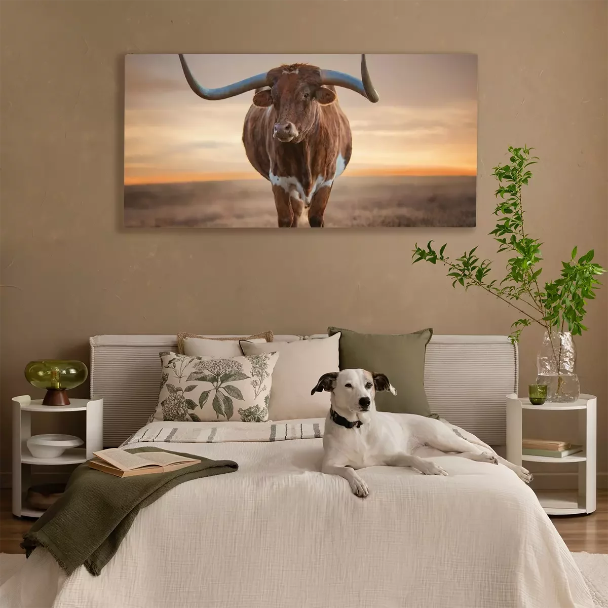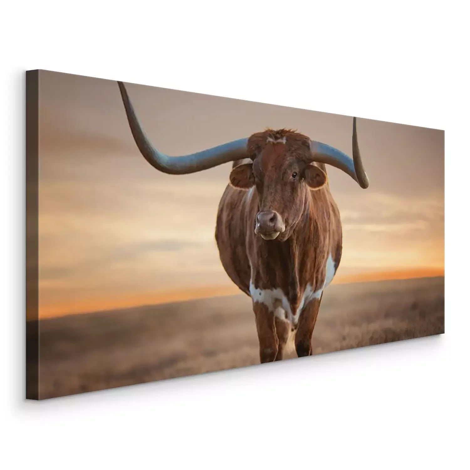 Bild Braune Kuh mit Hörnern vor dem Hintergrund des Sonnenuntergangs
