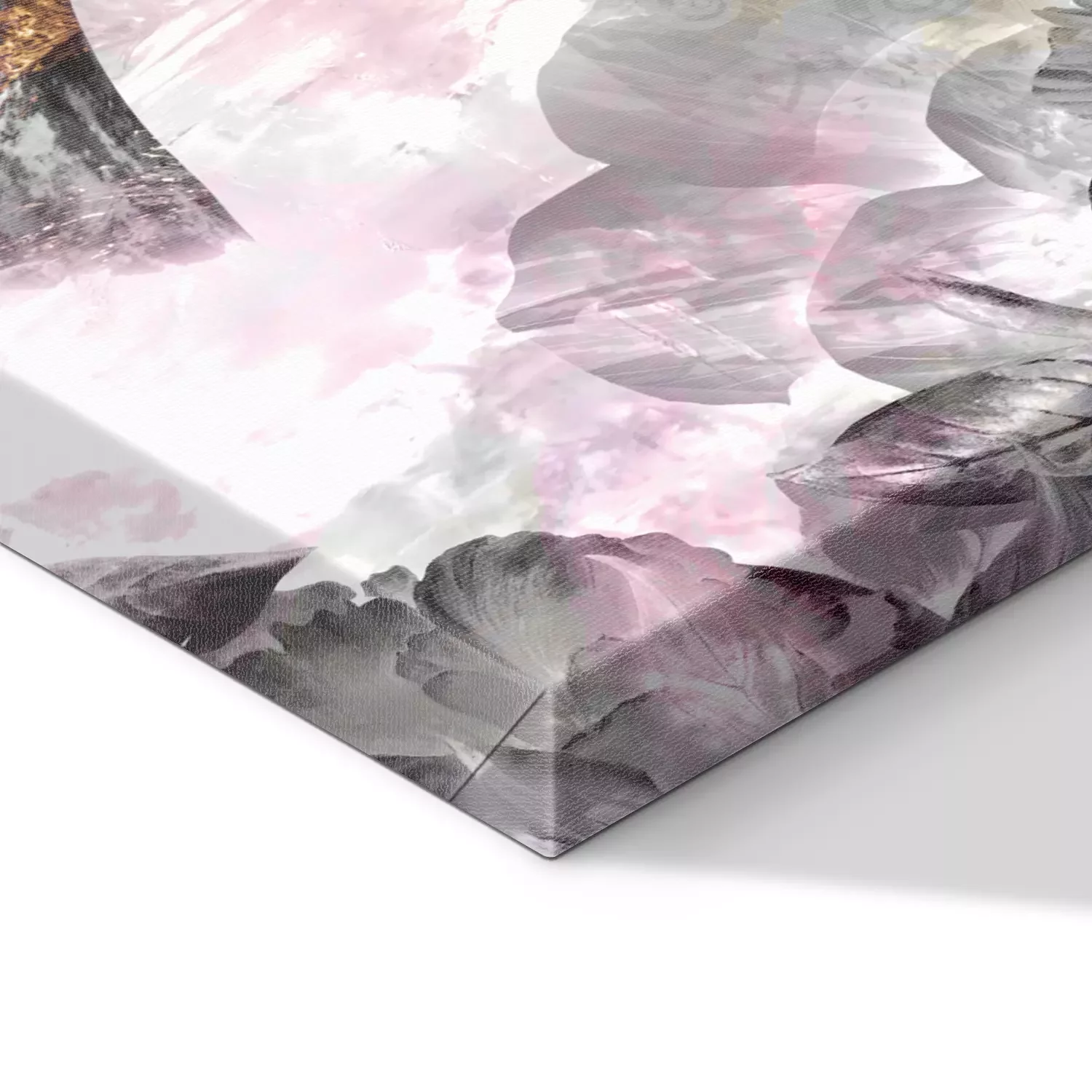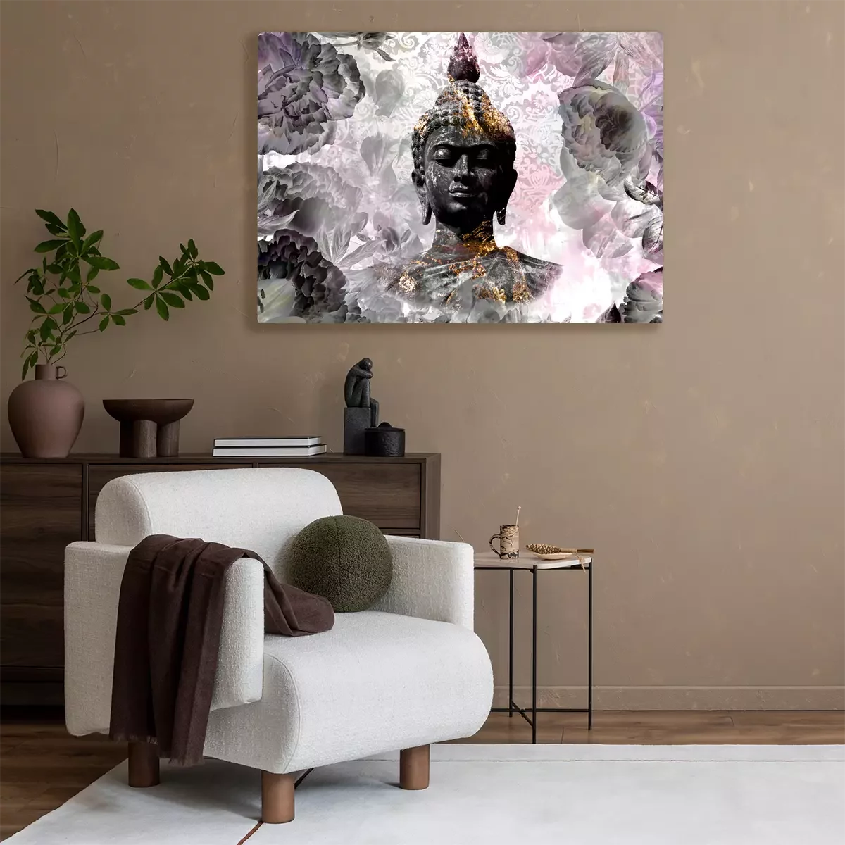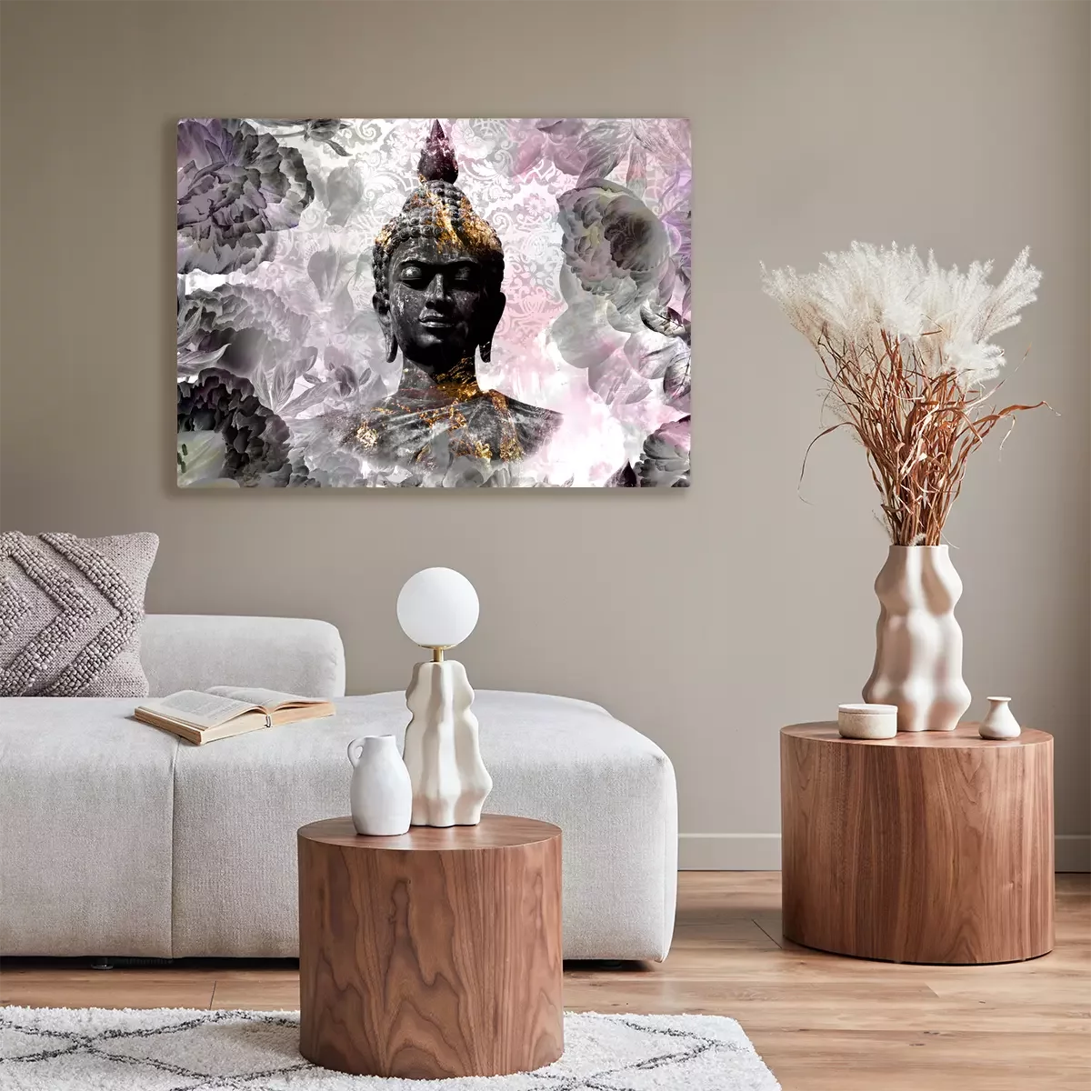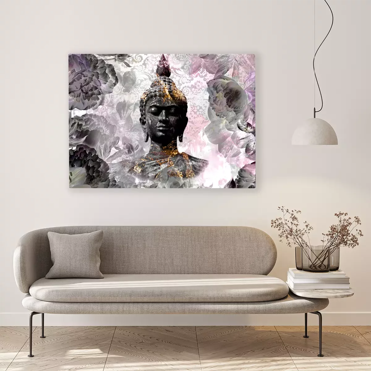Buddha vor einem hintergrund aus rosa und grauen blumen und dekorativen mustern