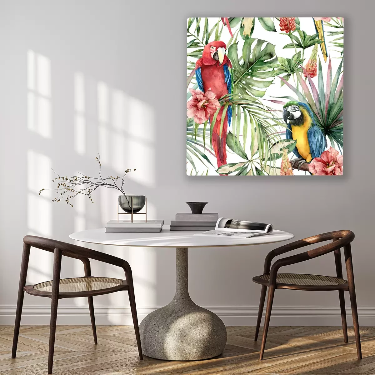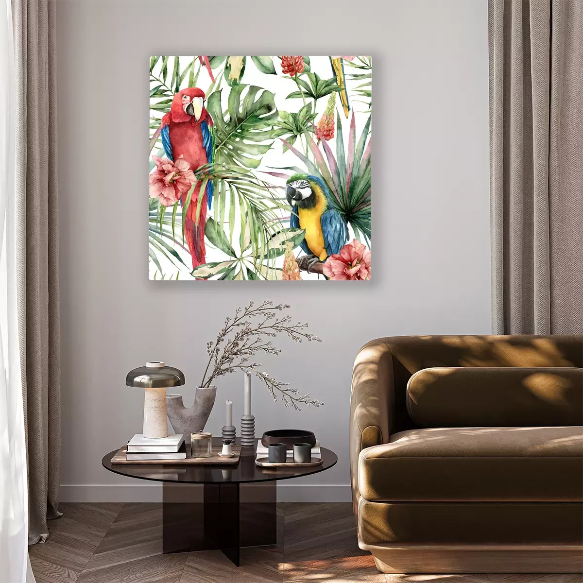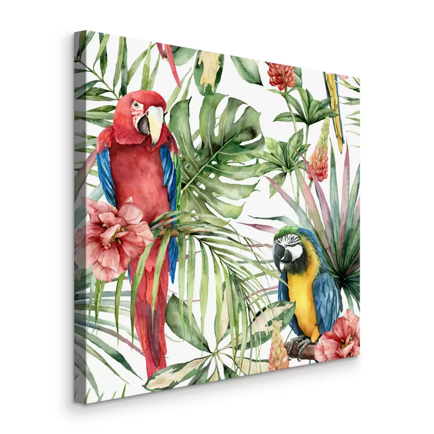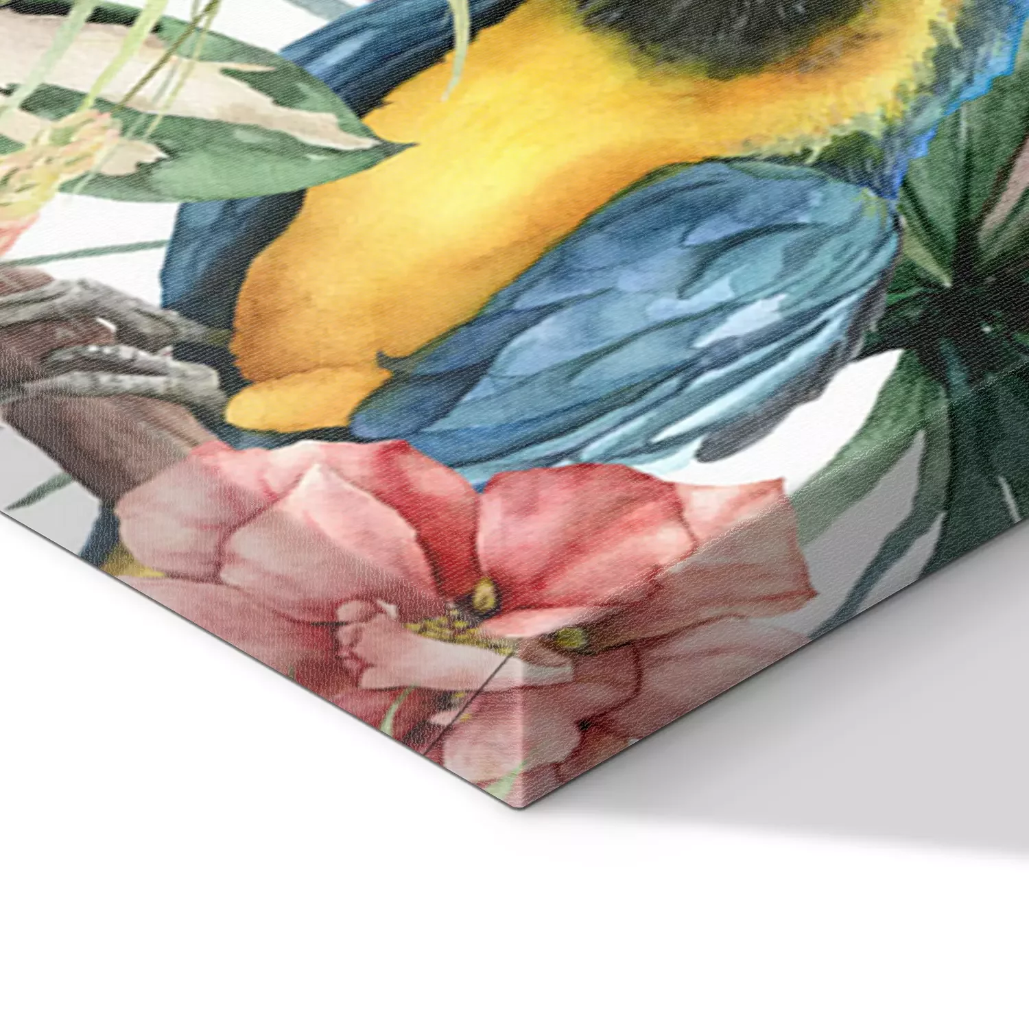 Tropisches nahtloses Muster mit Papageien, Protea, Plumeria und Blättern. Aquarell Sommer Print. Exotische handgezeichnete Abbildung