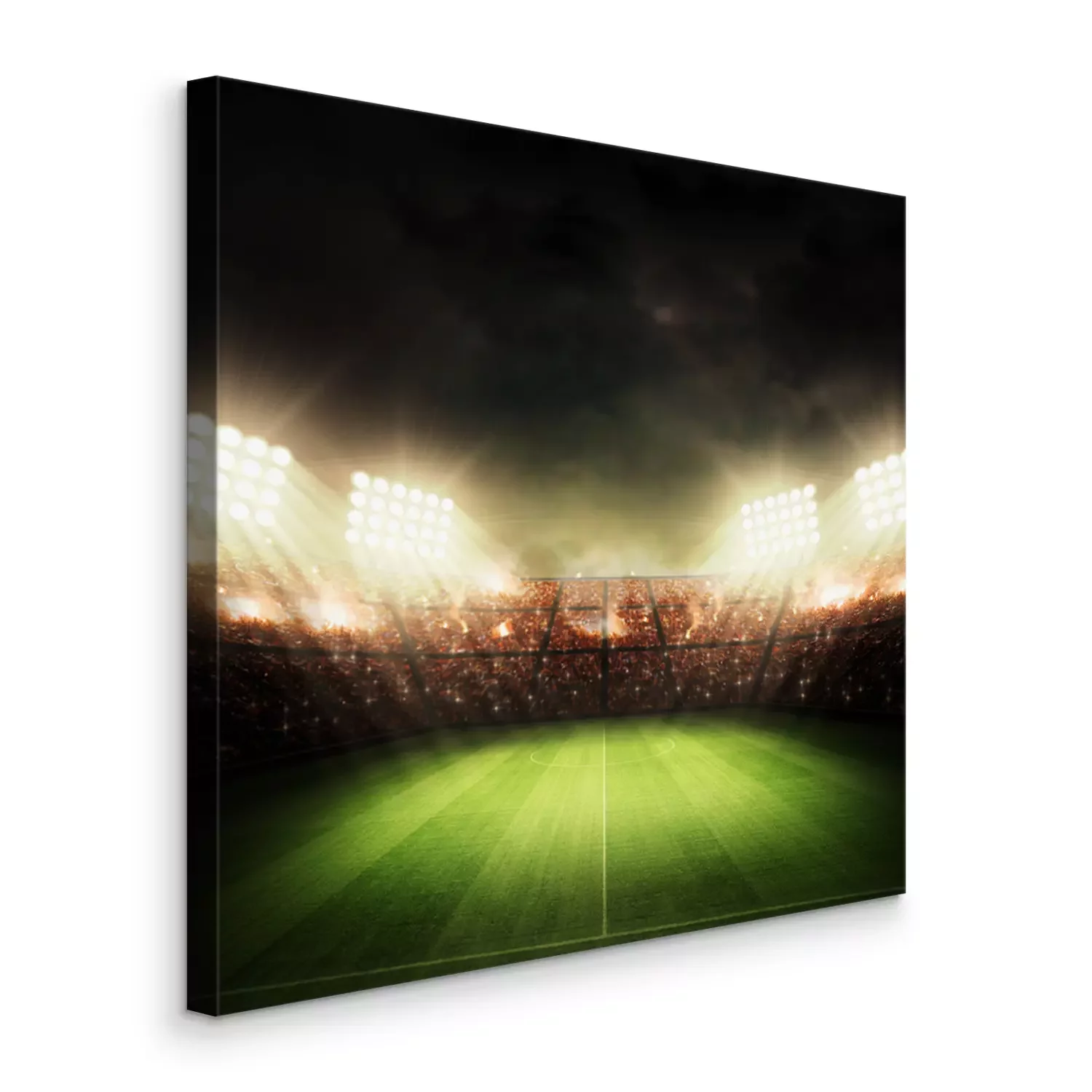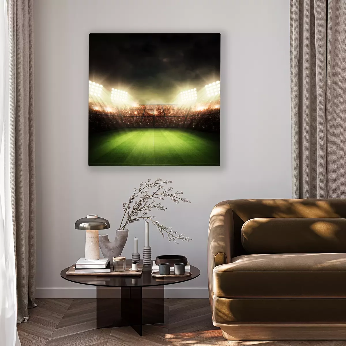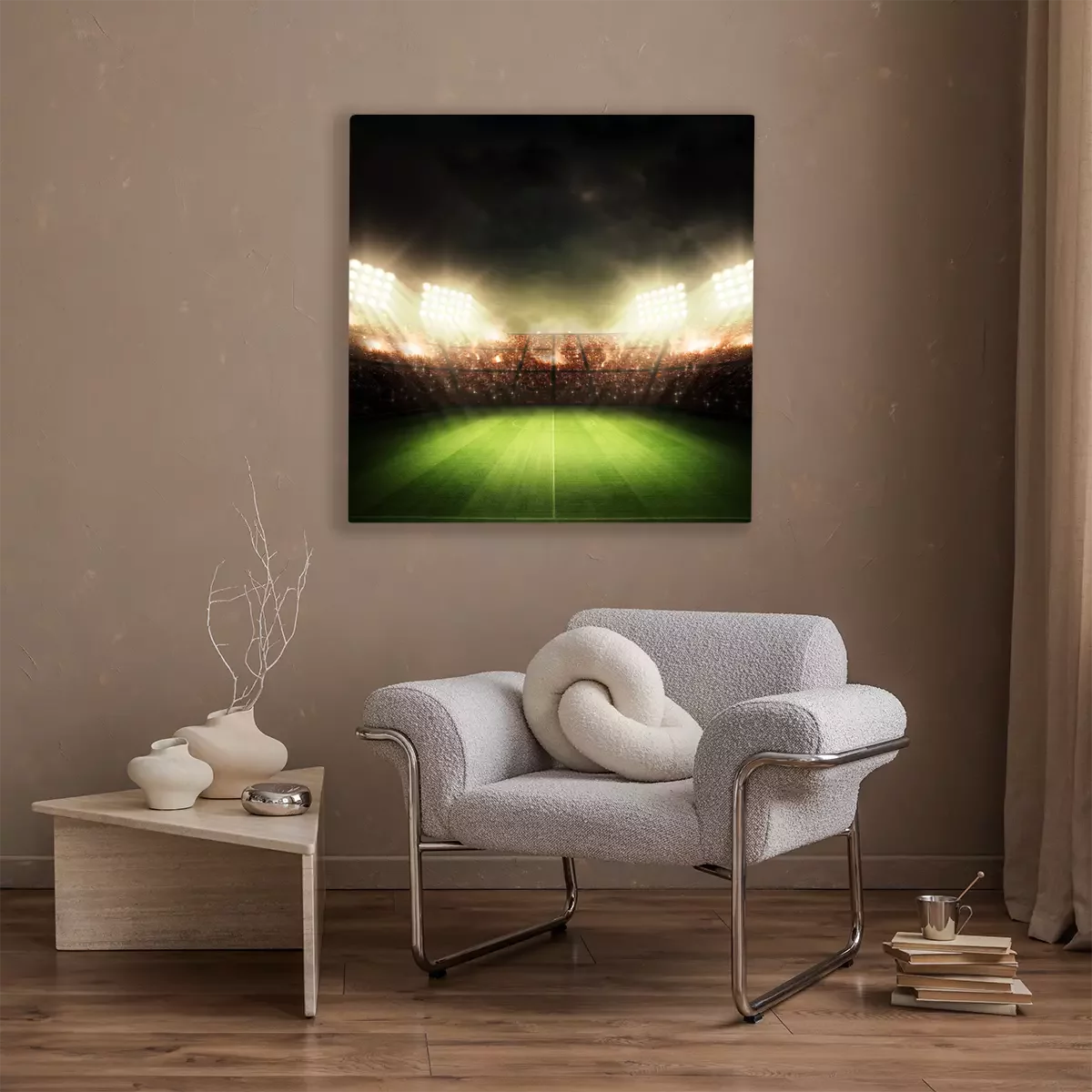 Fußball Rasen und Tor durch Halogene beleuchtet