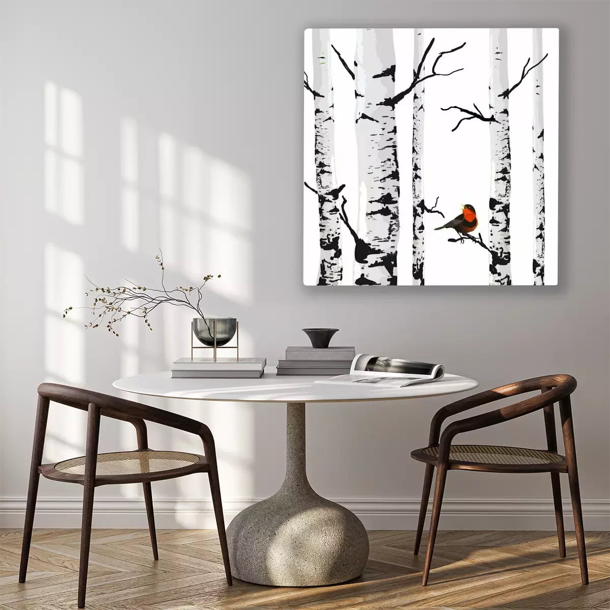 Bild: Cartoonartiger Vogel inmitten von Birken