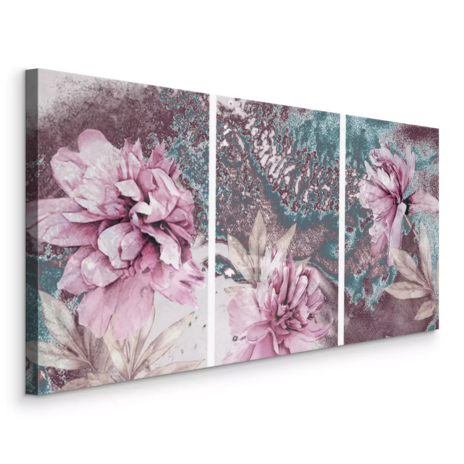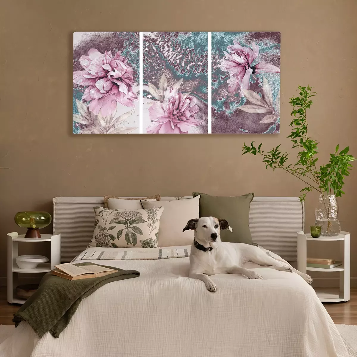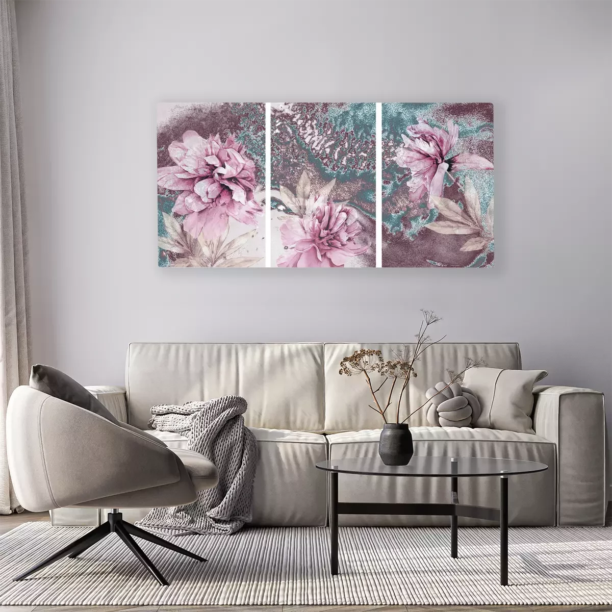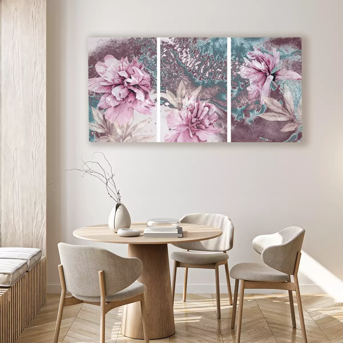 Bild: Collection of designer oil paintings. Decoration for the interior. Modern abstract art on canvas. A set of paintings with pink peonies on an abstract blue background