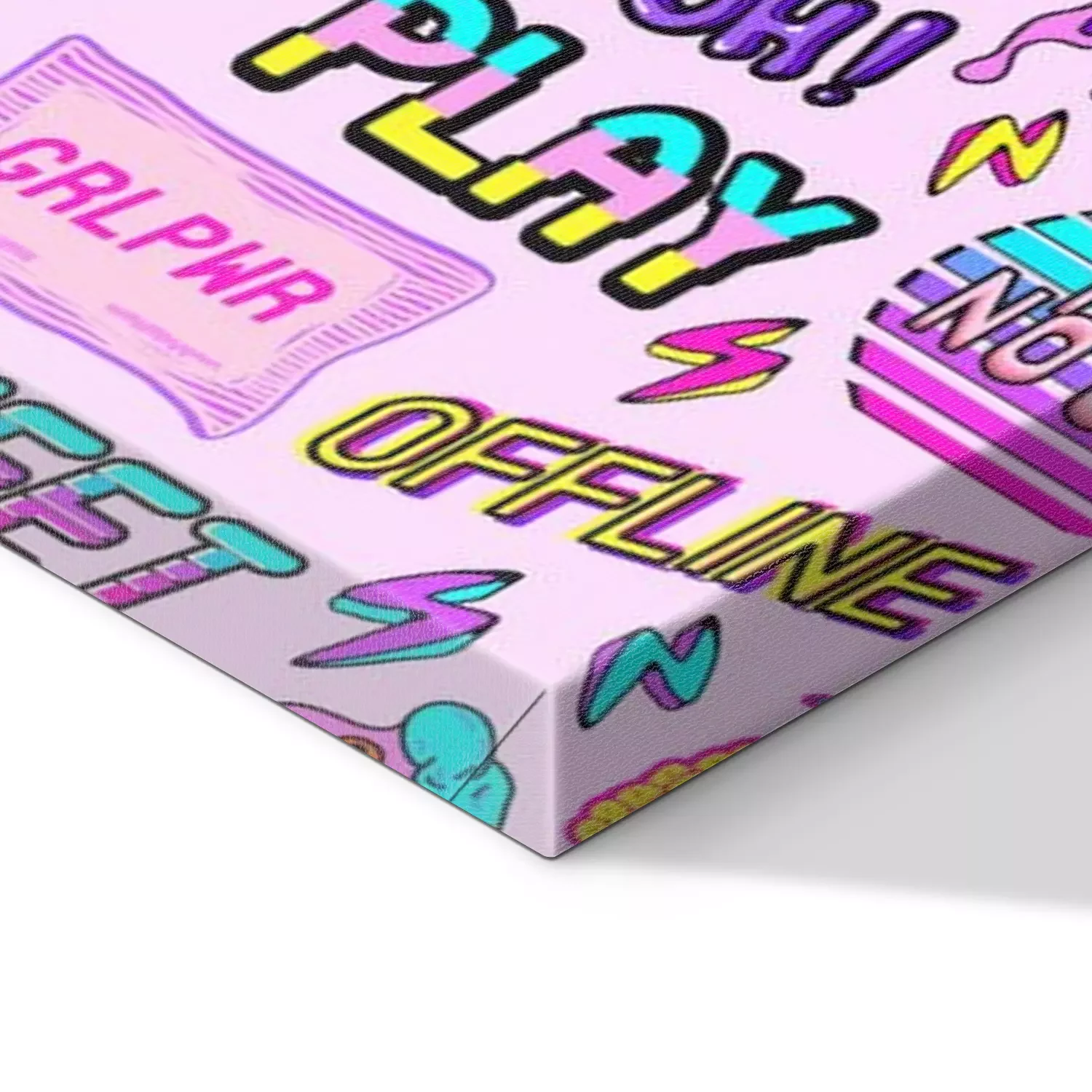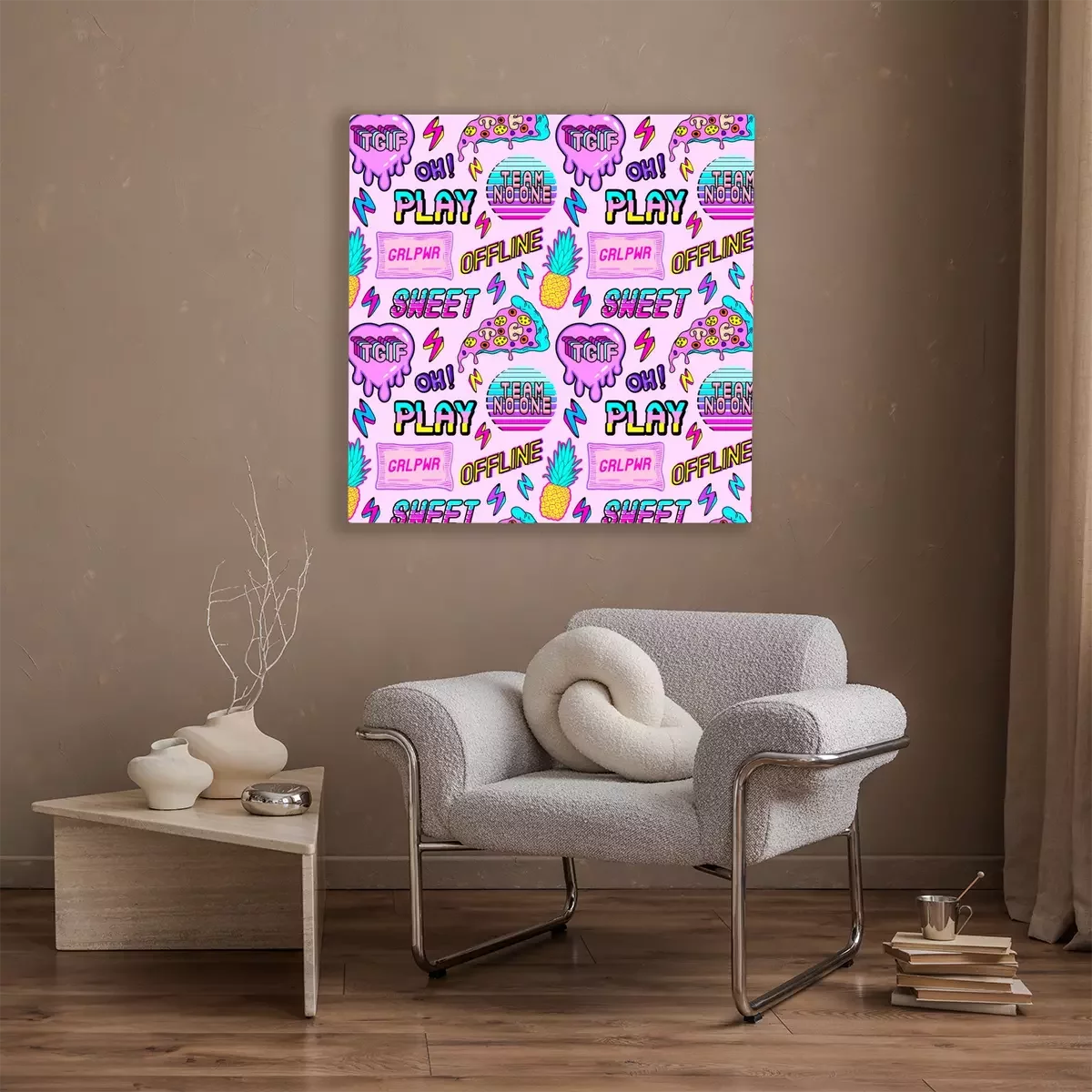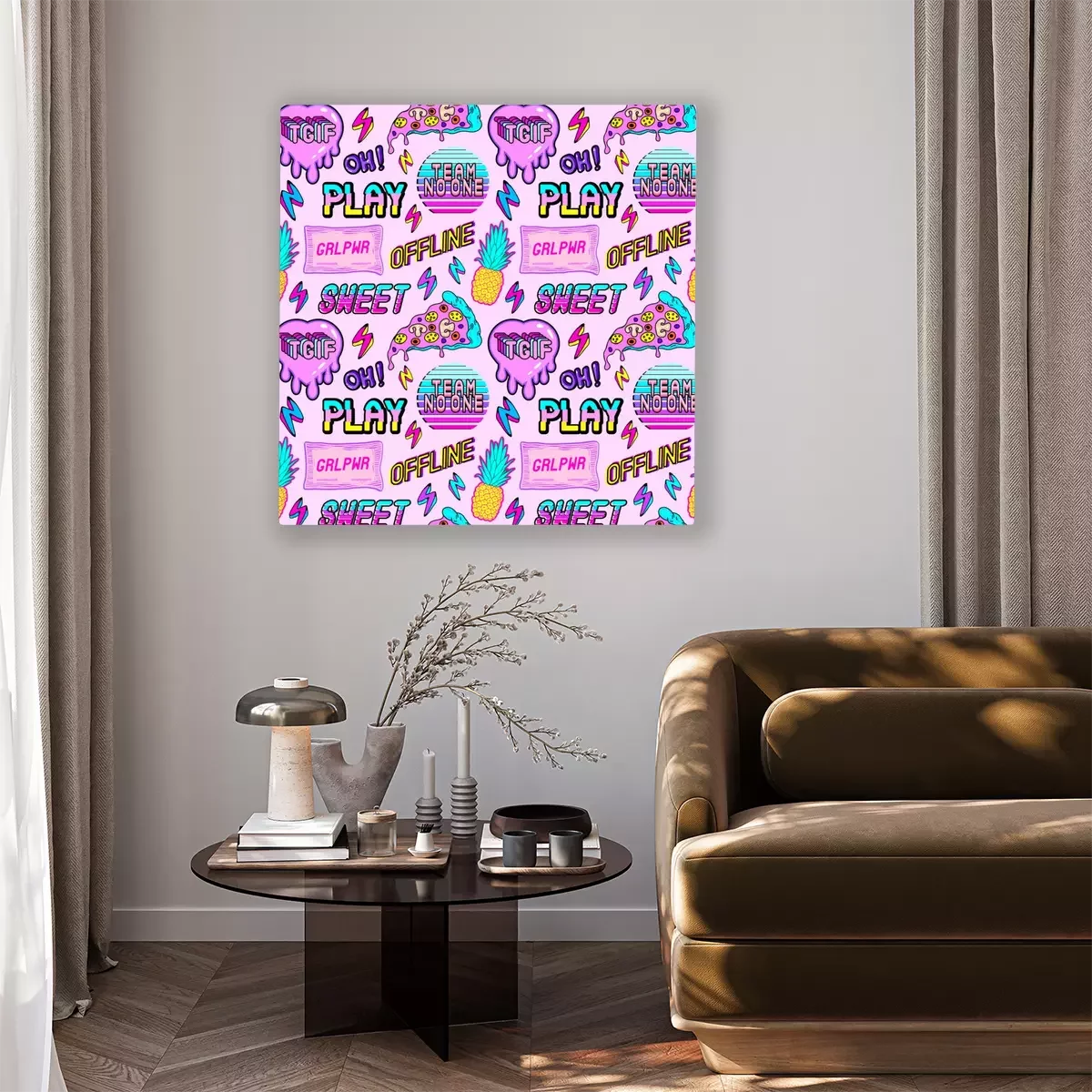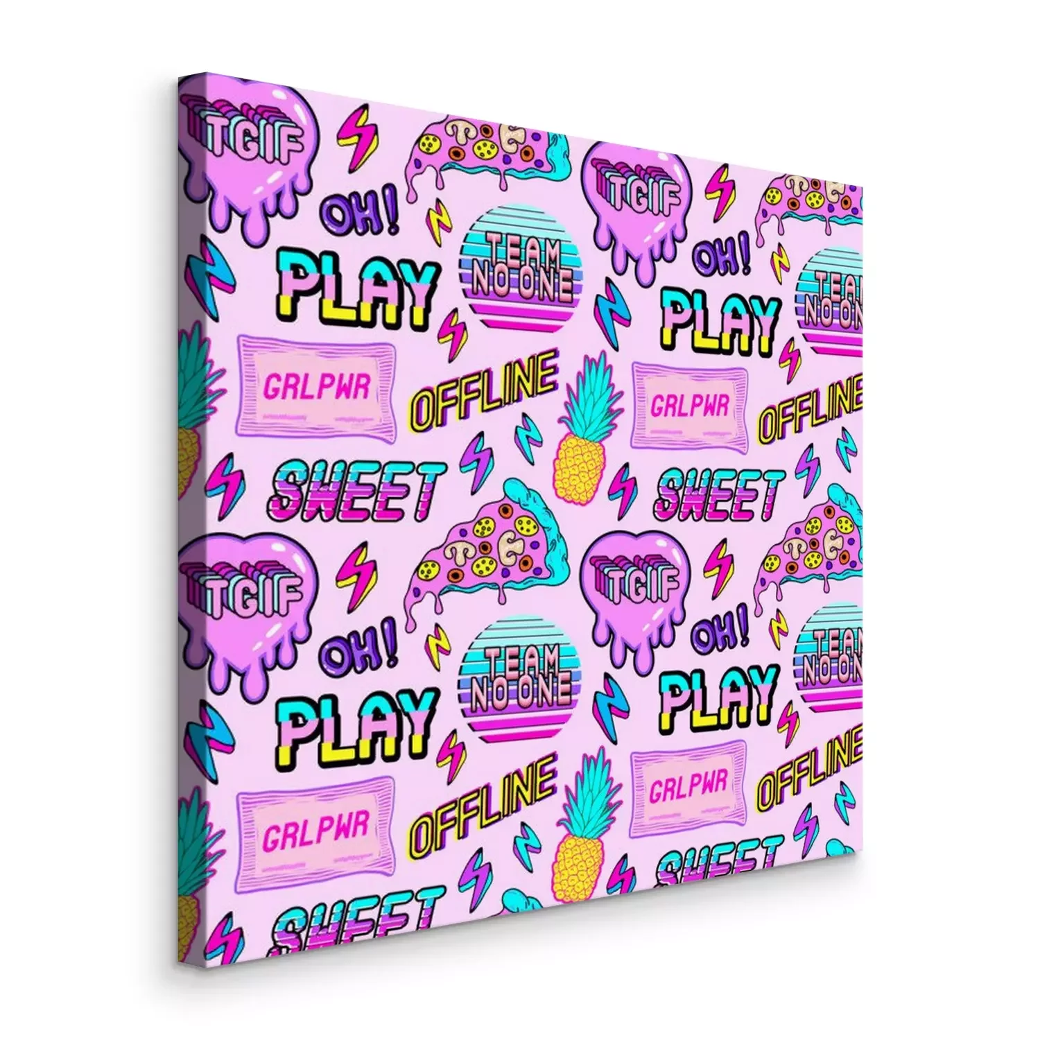 Bild Colorful seamless pattern with vaporware style patches, stickers with pineapples, pizza slices, hearts, words and abbreviations "TGIF", "team no one", "offline", "play", etc. Pink background.